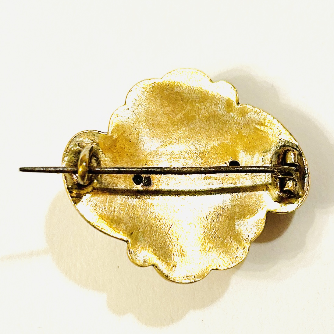 Zhotoveno ze silně zlaceného obecného kovu; neznačeno. Hmotnost 5,69 g, délka 33 mm, šířka 28 mm. Zapínání na \“C\“ sponu v pořádku, nepůvodní jehla, stopy nošení, jinak v dobrém stavu, odborně vyčištěno a vyleštěno zlatníkem.