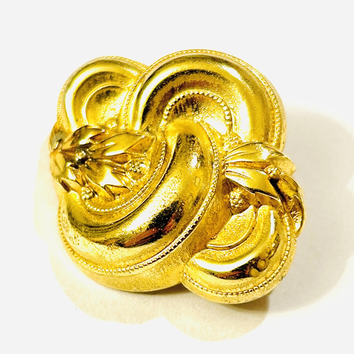 Starožitná brož z období biedermeieru v podobě stylizovaného uzlu s propleteným listovým s malými piniovými šiškami. Kvalitní středoevropská zlatnická práce z poloviny 19. století. Vyrobeno technikou dutého kovu.
