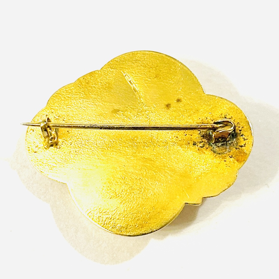 Zhotoveno ze silně zlaceného obecného kovu; neznačeno. Hmotnost 4,42 g, délka 37 mm, šířka 31 mm. Zapínání na \“C\“ sponu v pořádku, lehké stopy nošení, jinak v dobrém stavu, odborně vyčištěno a vyleštěno zlatníkem.