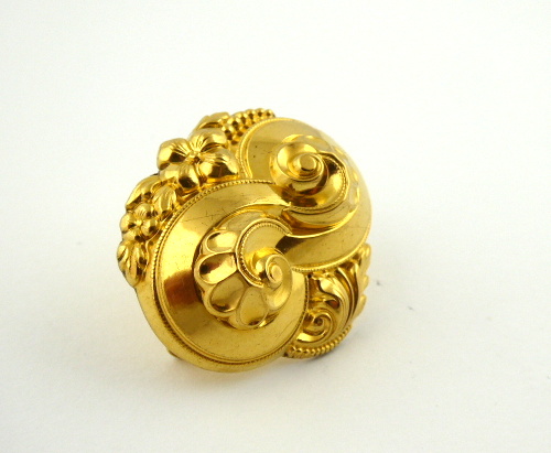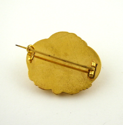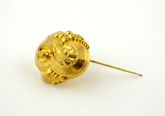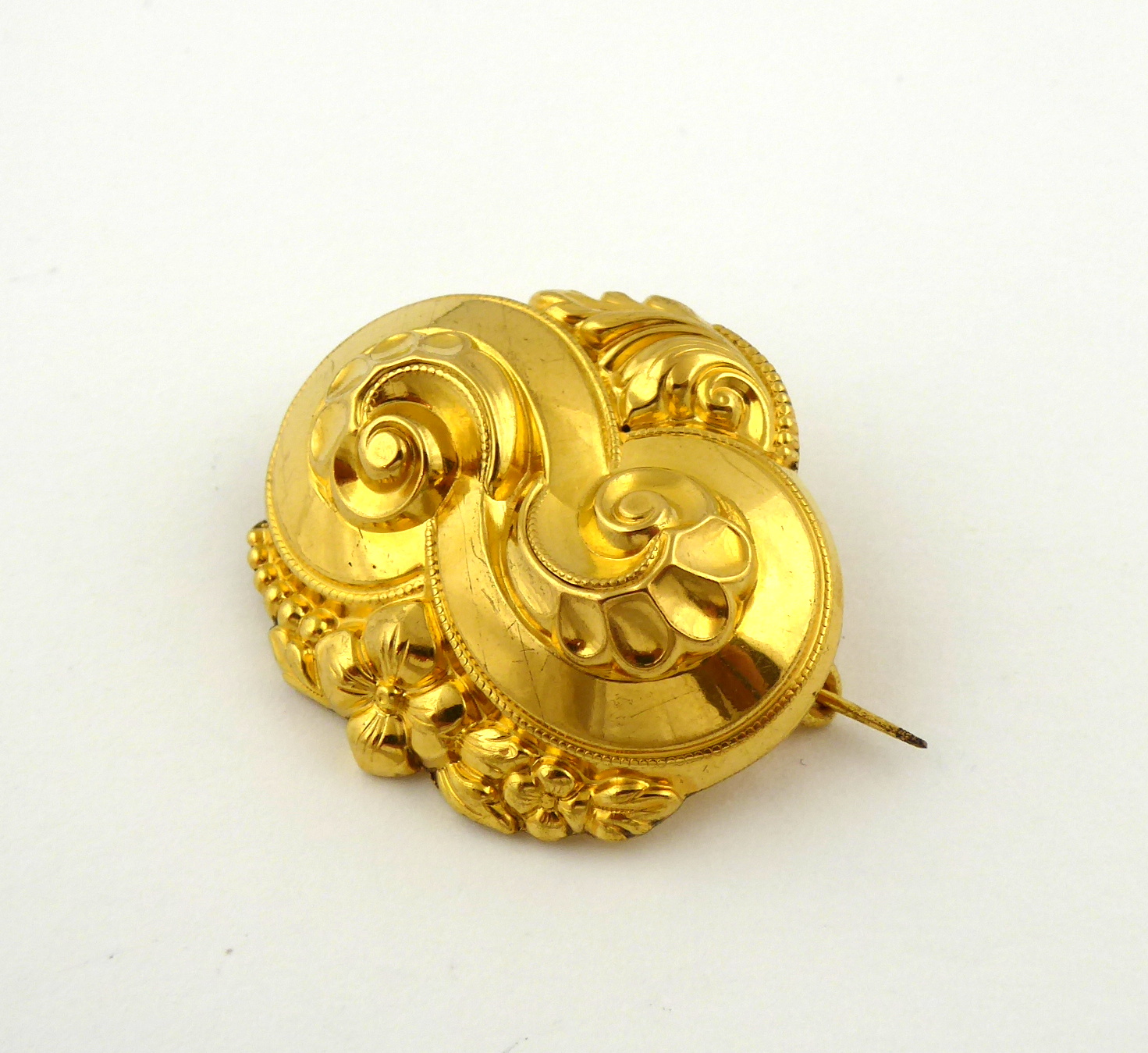 Silně zlacený kov. Období a styl: biedermeier. Celková váha 5,70 g. Zlacená starožitná brož z období biedermeieru zdobená reliéfním ornamentem s motivem pletence a voluty. Horní a spodní okraj dekorovaný florálním ornamentem. Střední Evropa 1870 – 1890. Výška 3 cm, šířka 3,2 cm.
