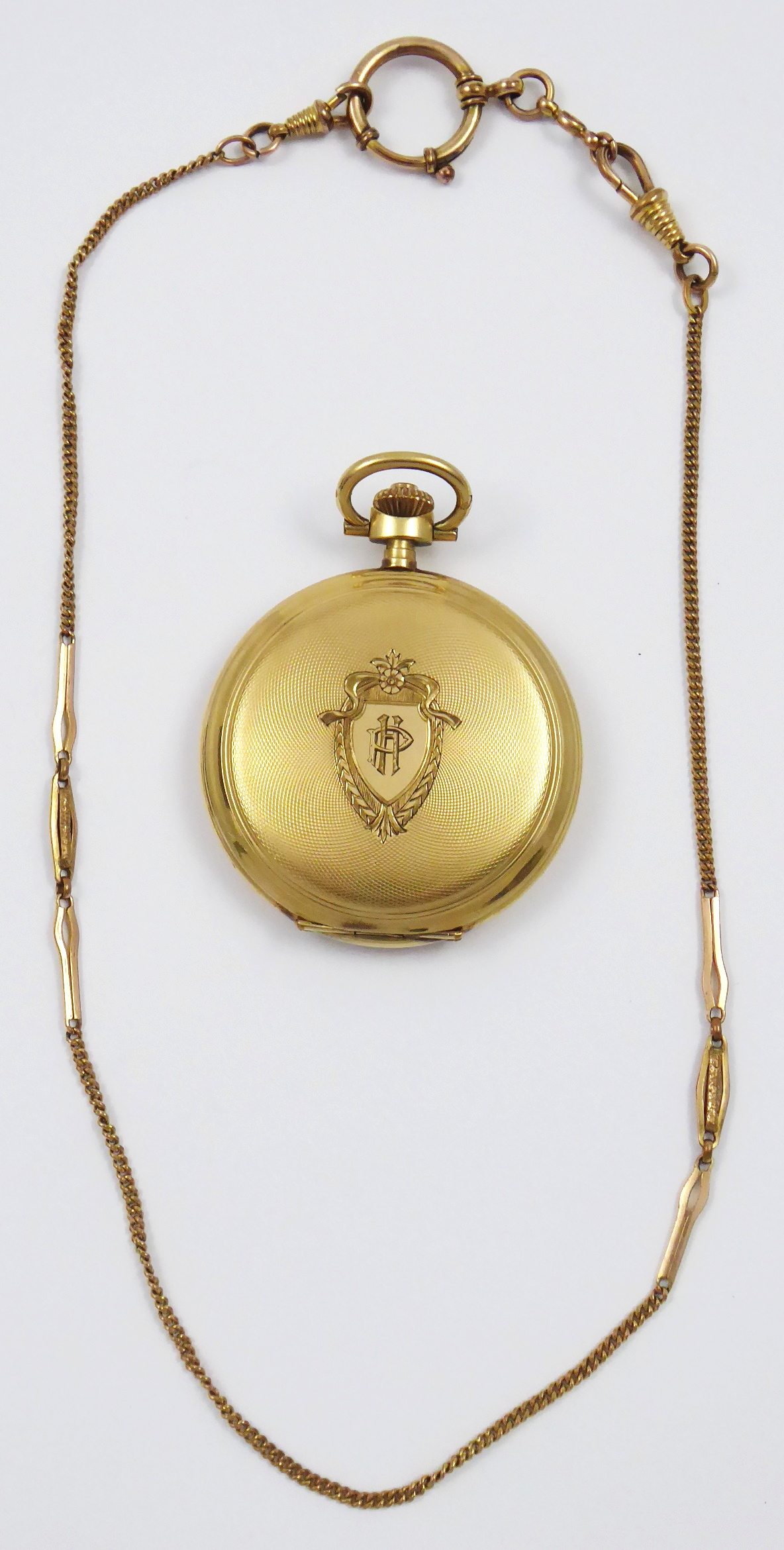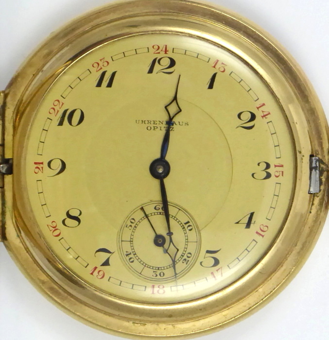 Silně zlacený žlutý kov a doublé. Celková hmotnost hodinek 94,85 g. Celková hmotnost řetízku k hodinkám 11,35 g. Kapesní tříplášťové hodinky s ciferníkem barvy champagne se jménem prodejce: UHRENHAUS OPITZ a s černými a červenými arabskými číslicemi a vteřinovkou. Modřené ocelové hodinové ručičky. Prodejce: Gustav Opitz, Niederhasslau. Hodinky od firmy Steinmeyer´s, Pforzheim, Německo. Řetízek k hodinkám doublé (zlacený) od firmy Andreas Daub, Pforzheim, Německo. Gravírované a gilošované pláště. V originální krabičce značené: Gustav Opitz, Uhren u. Goldwaren Nierderhasslau i. S. s vavřínovým věncem 30 Jahre 1898 – 1928. Značené: GRARANTIE 10 JAHRE, číslo 12927, STEINMEYER´S ORIGINAL a značkou výrobce řetízku. Funkční. Německo, Niederhasslau, Pforzheim, rok 1928. Průměr: 60 mm.