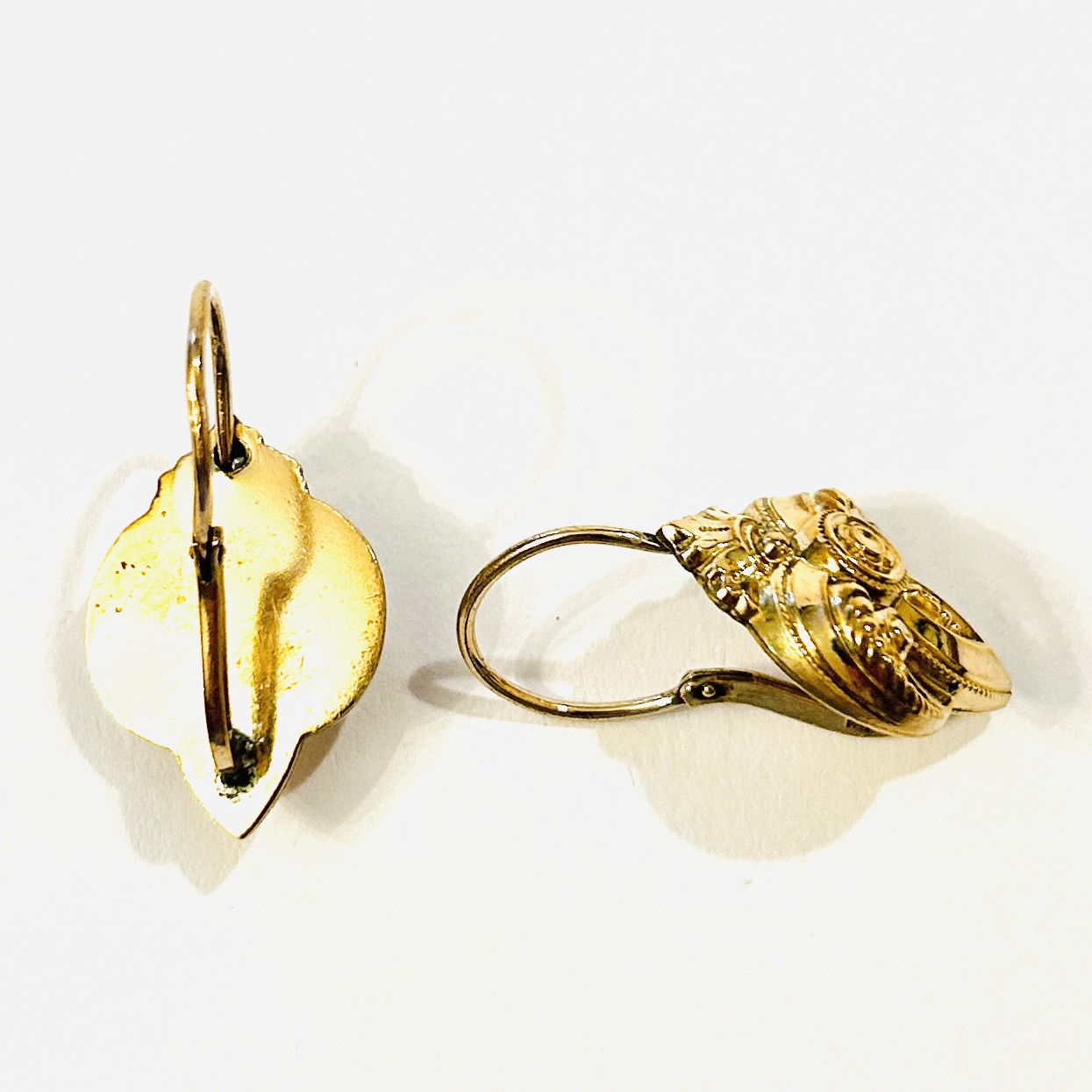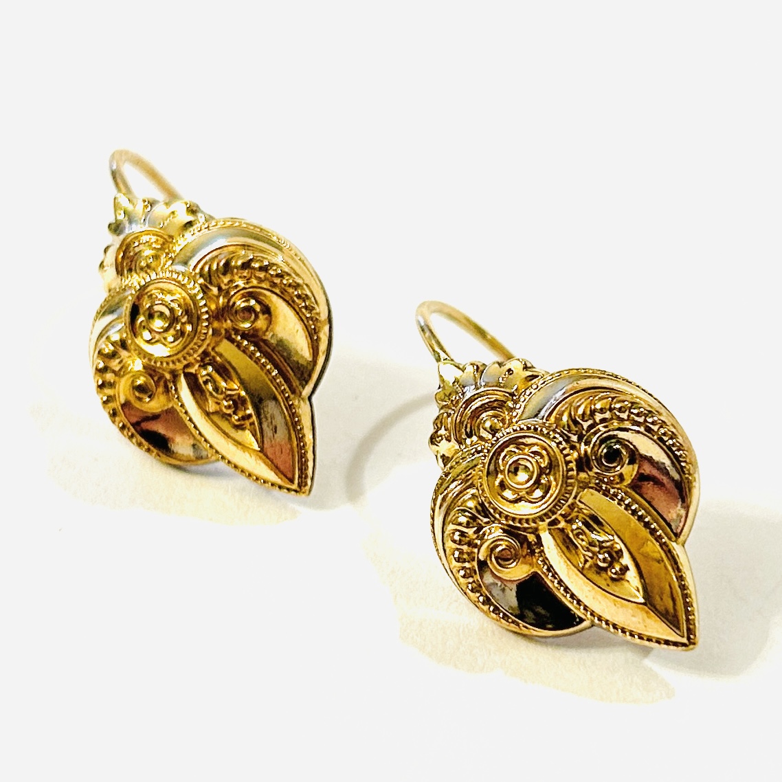 Dekorativní náušnice ve stylu pozdního biedermeieru, plasticky tvarované tělo s motivy volut a florálních křivek. Kvalitní středoevropská či západoevropská práce z 2. poloviny 19. století.