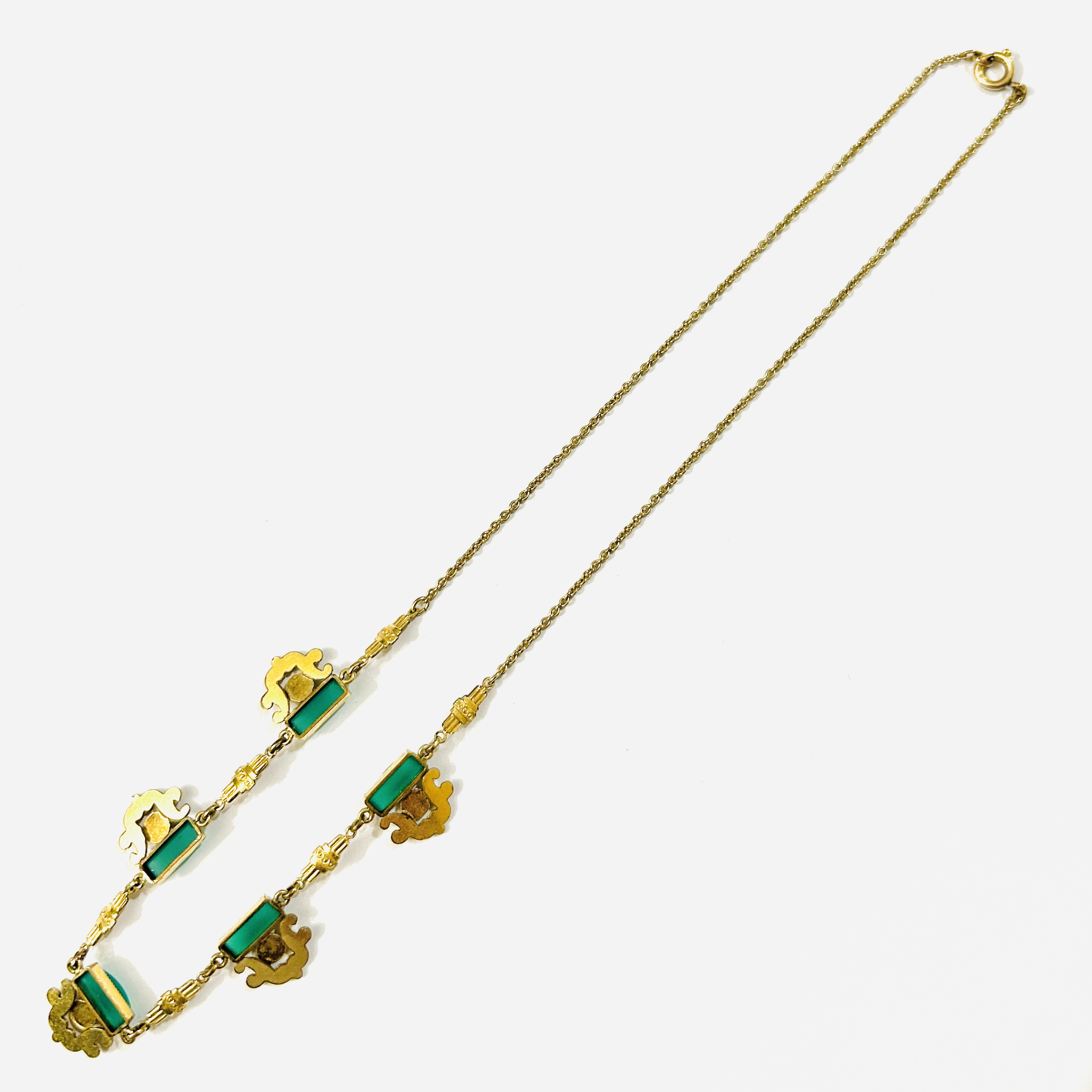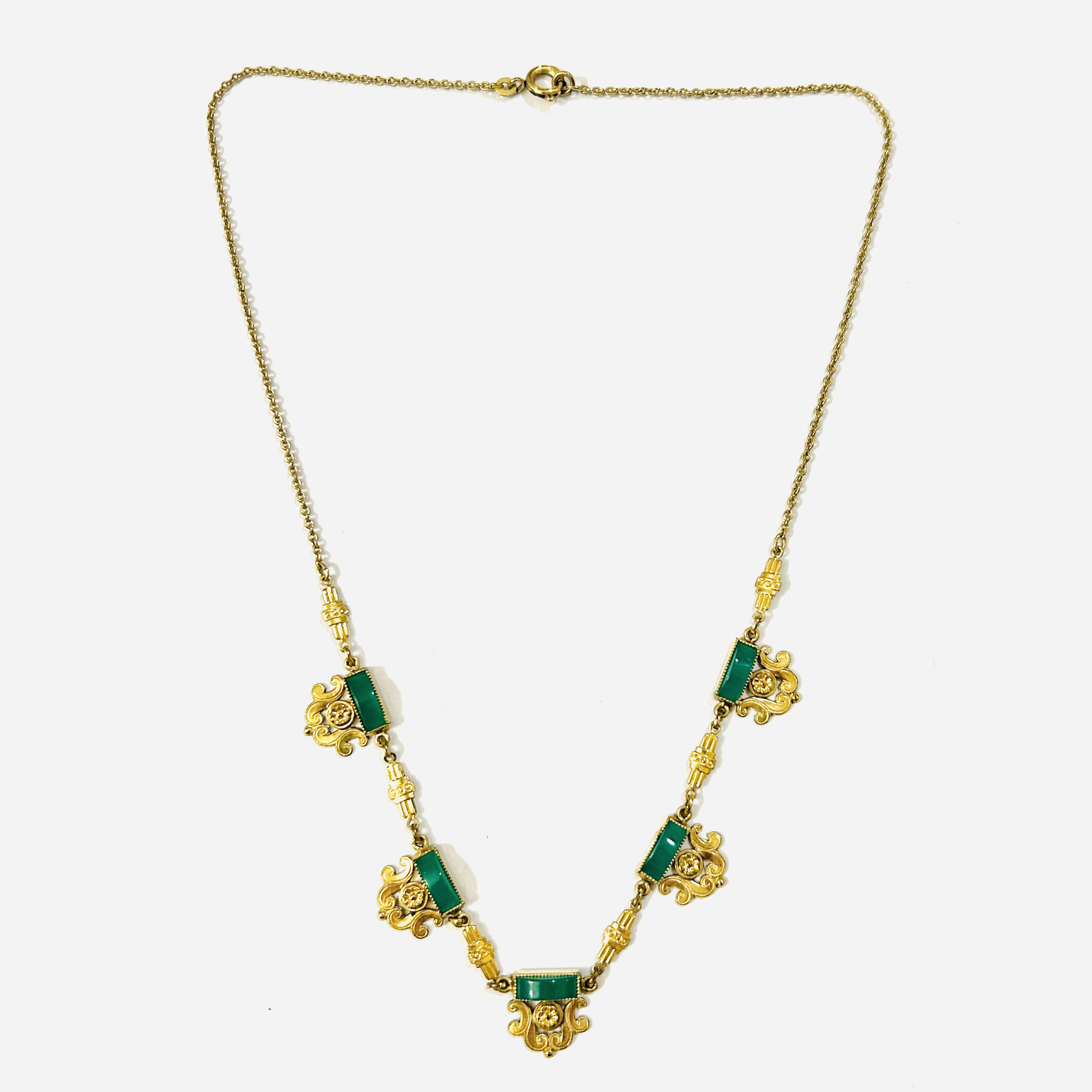 Půvabný náhrdelník s dekorativními, pseudobarokně laděnými články, v zrnitých obrubách osazeno 5 přírodními chryzoprasy obdélného oblého brusu. Kvalitní šperk věrohodně napodobující provedení v drahém materiálu, patrně francouzská práce z 20. až 30. let 20. století.