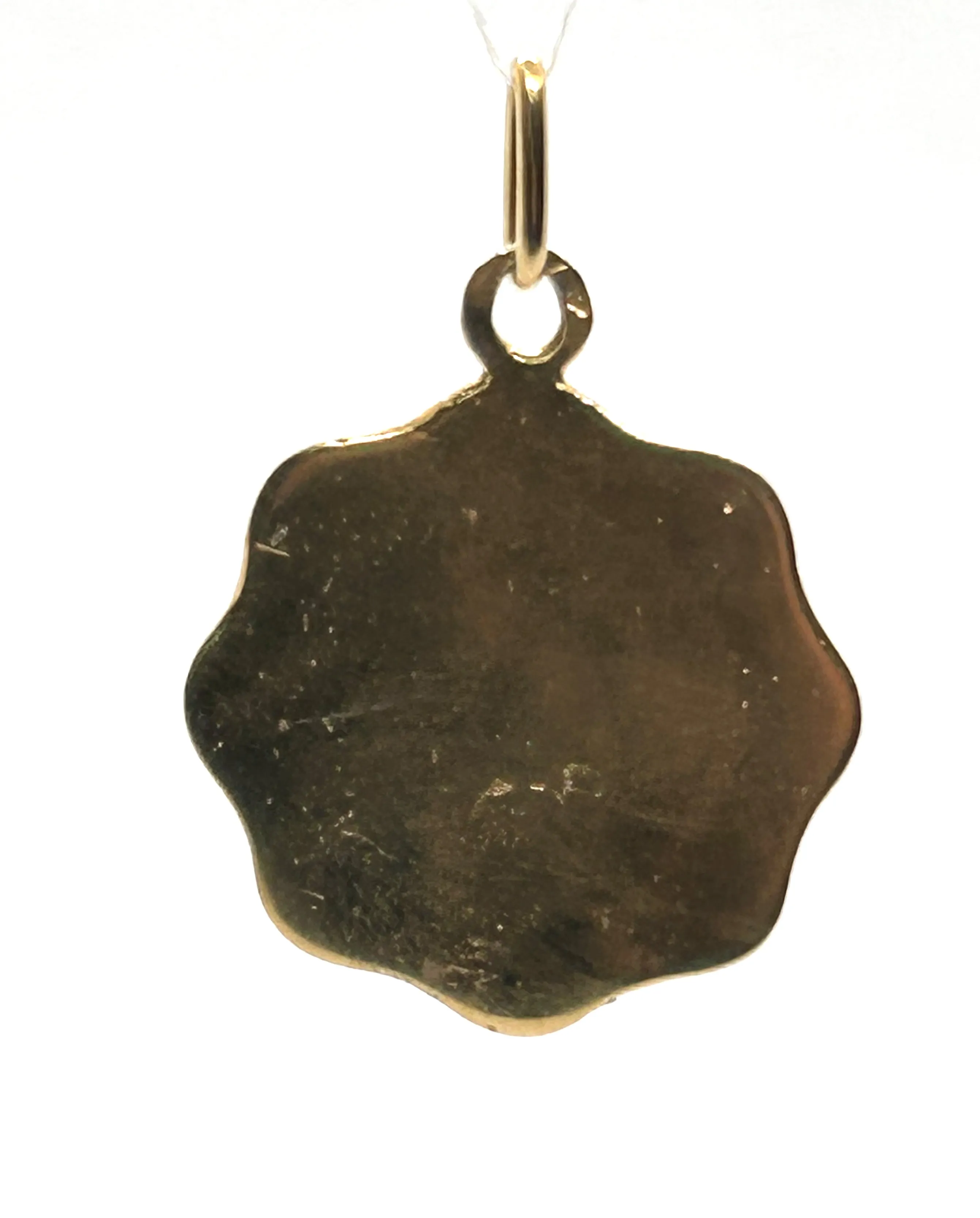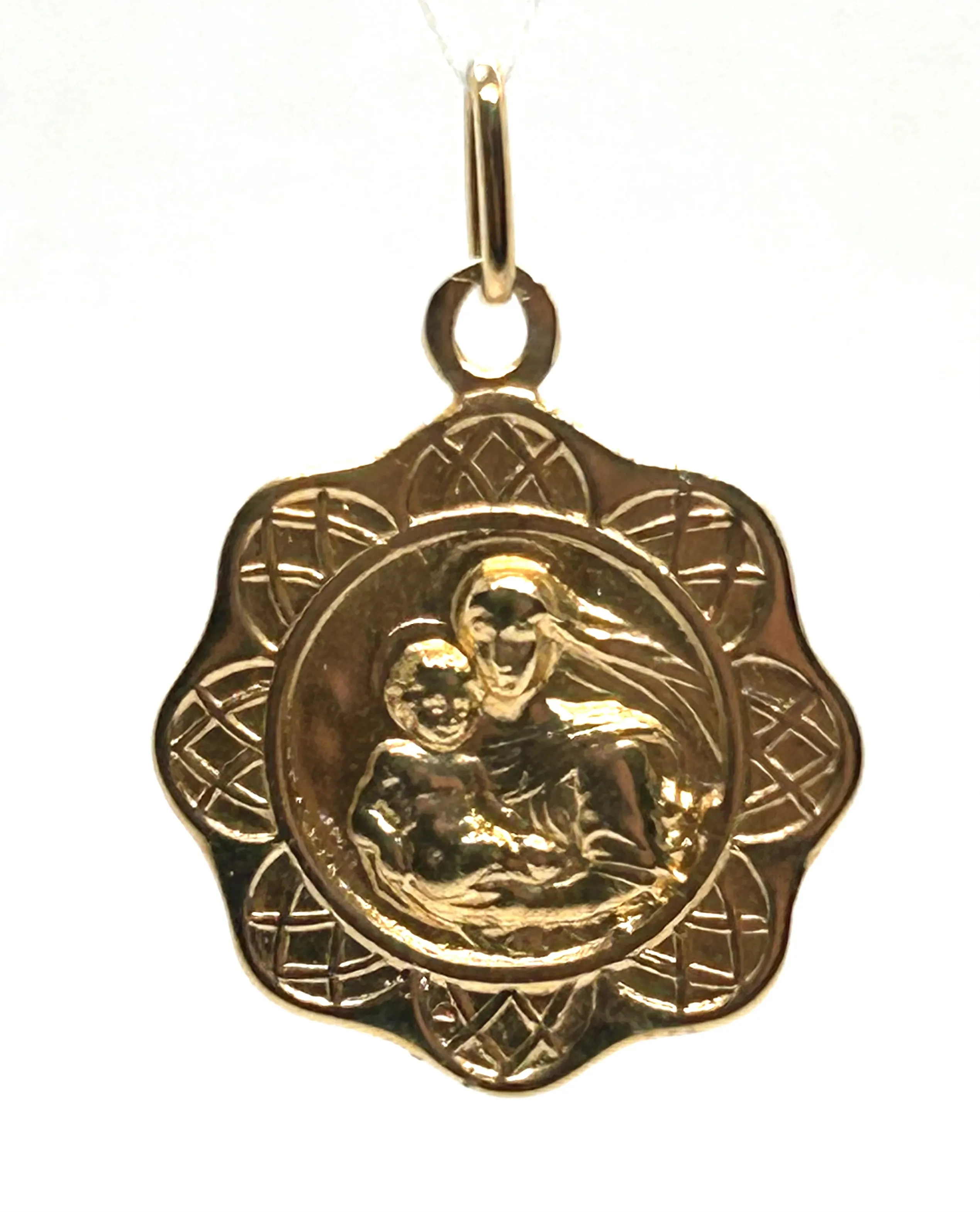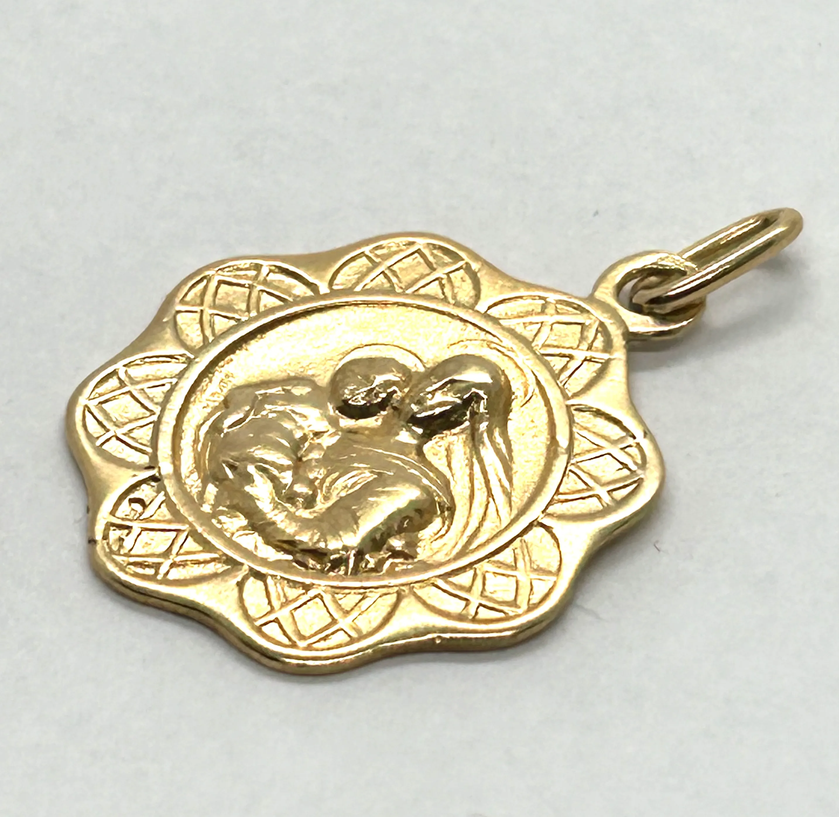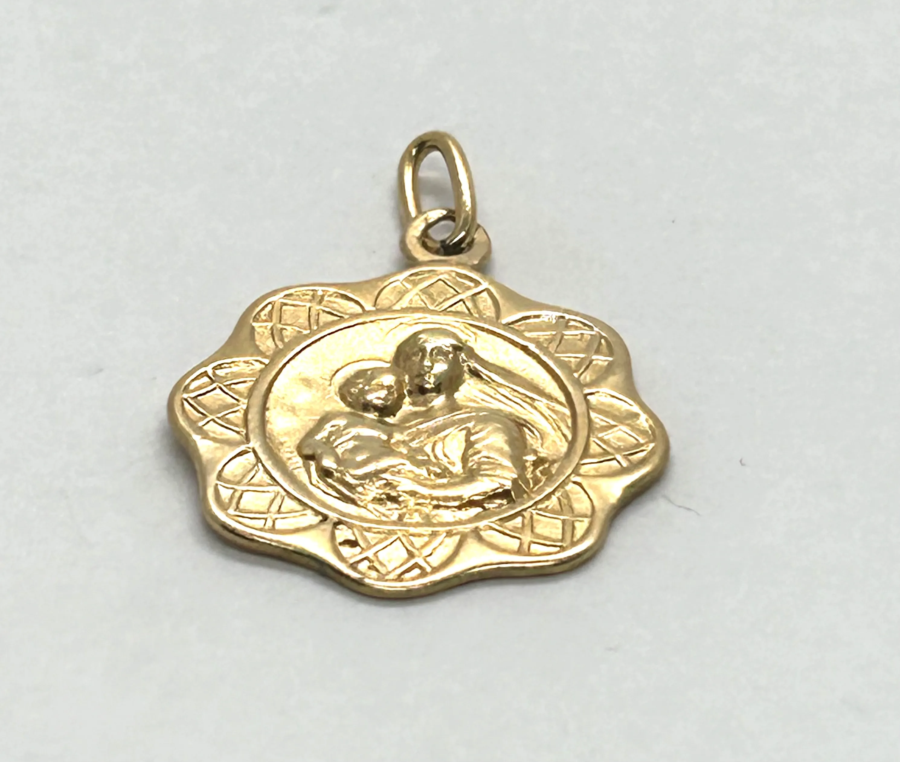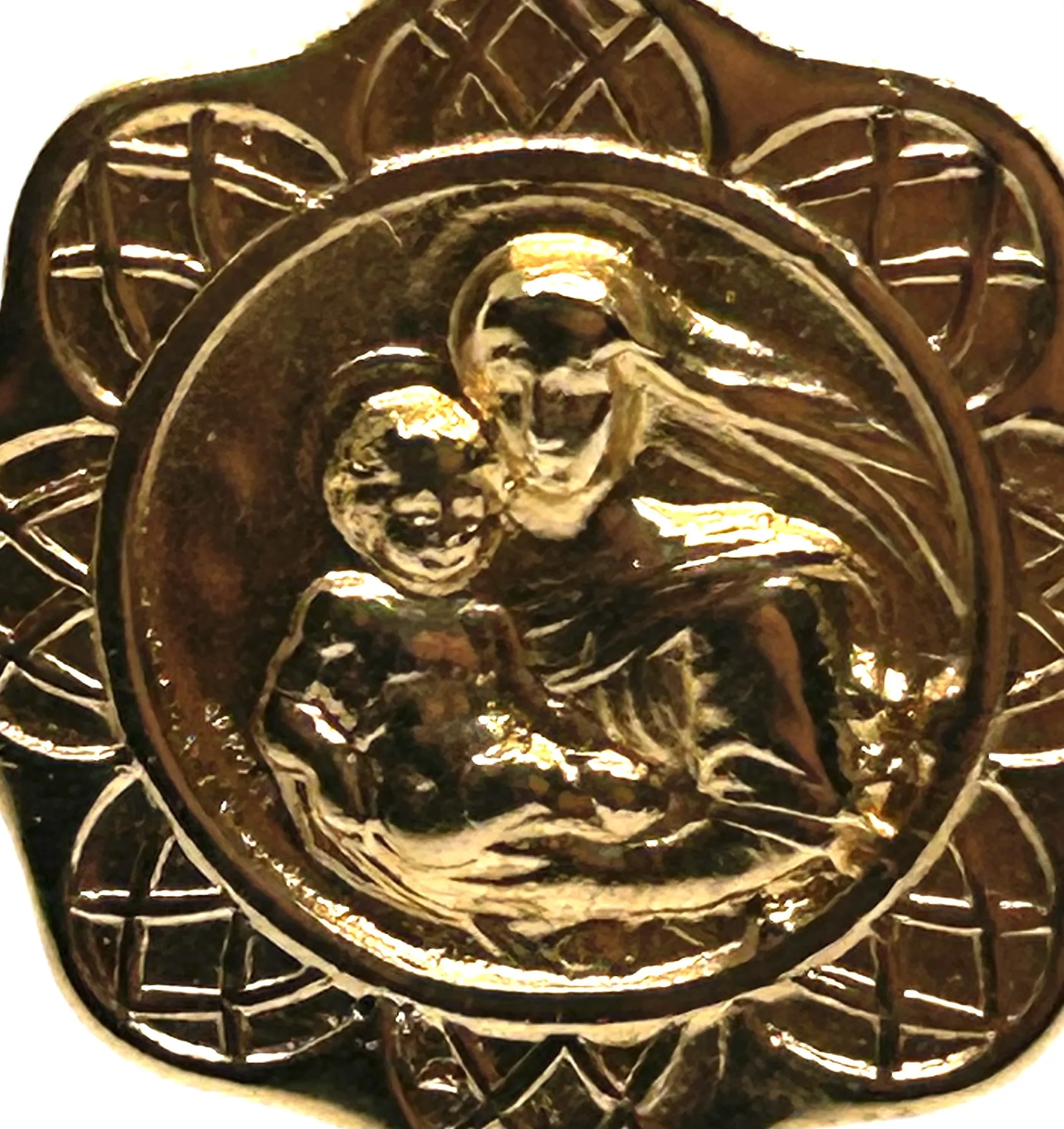 Zlacený stříbrný medailonek – přívěsek s reliéfním zobrazením Madony s dítětem z 20. let minulého století, Evropa. Ag btto 2,70 g, 900/1000; průměr 2,3 cm, výška s ouškem 3 cm, výška bez ouška 2,5 cm. Medailonek s krásným reliéfním portrétem Bohorodičky se nalézá ve vynikajícím stavu a je k němu přiložen atest Puncovního úřadu České republiky.