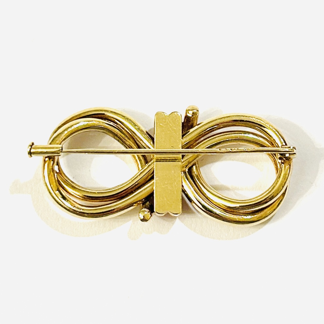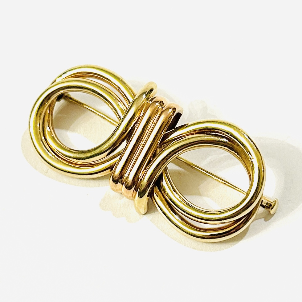 Elegantní brož z období art-deco ve tvaru stylizované, až futuristicky pojaté mašle, dynamické křivky pracující s kontrastním zbarvení kovu. Tuzemská klenotnická práce z 30. či 2. poloviny 40. let 20. století.