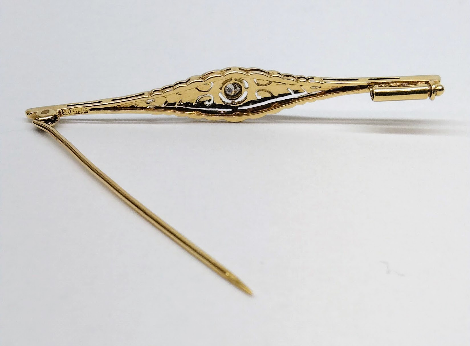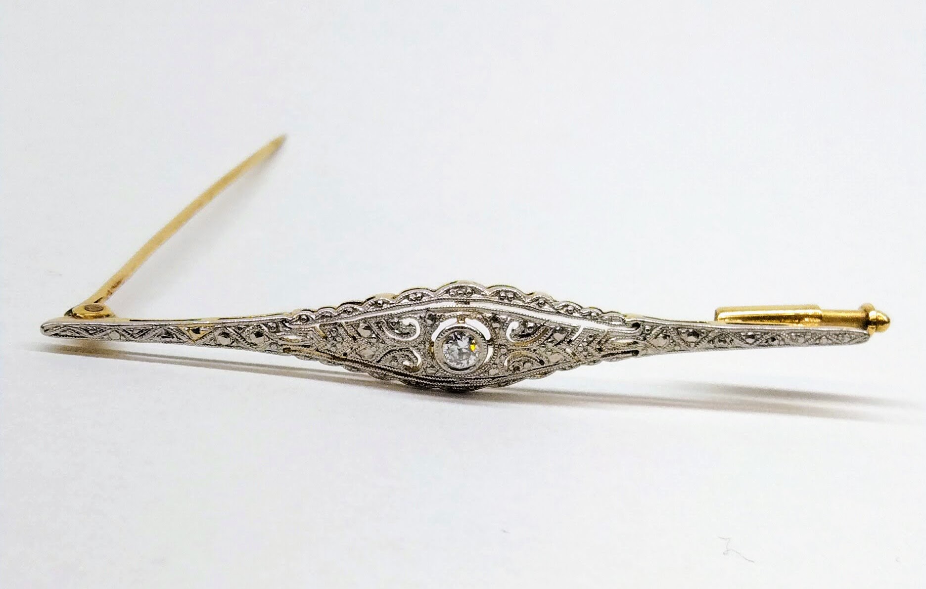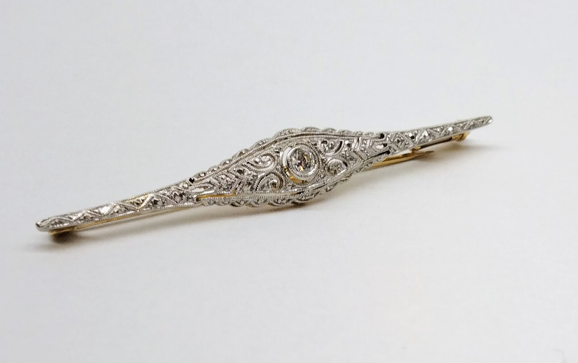 Subtilní jemná art-deco brož z bílého a žlutého zlata se středovým diamantem briliantového brusu o velikosti 0,15 ct, zdobená prořezáváním a technikou granulace. Celková hmotnost 2,80 g, Au 585/1000, osvědčení Puncovního úřadu. Elegantní šperk ve výborném stavu. Střední Evropa, druhá čtvrtina 20. století, délka 5,5 cm, šířka 0,8 cm.