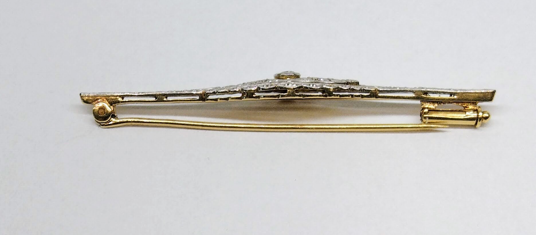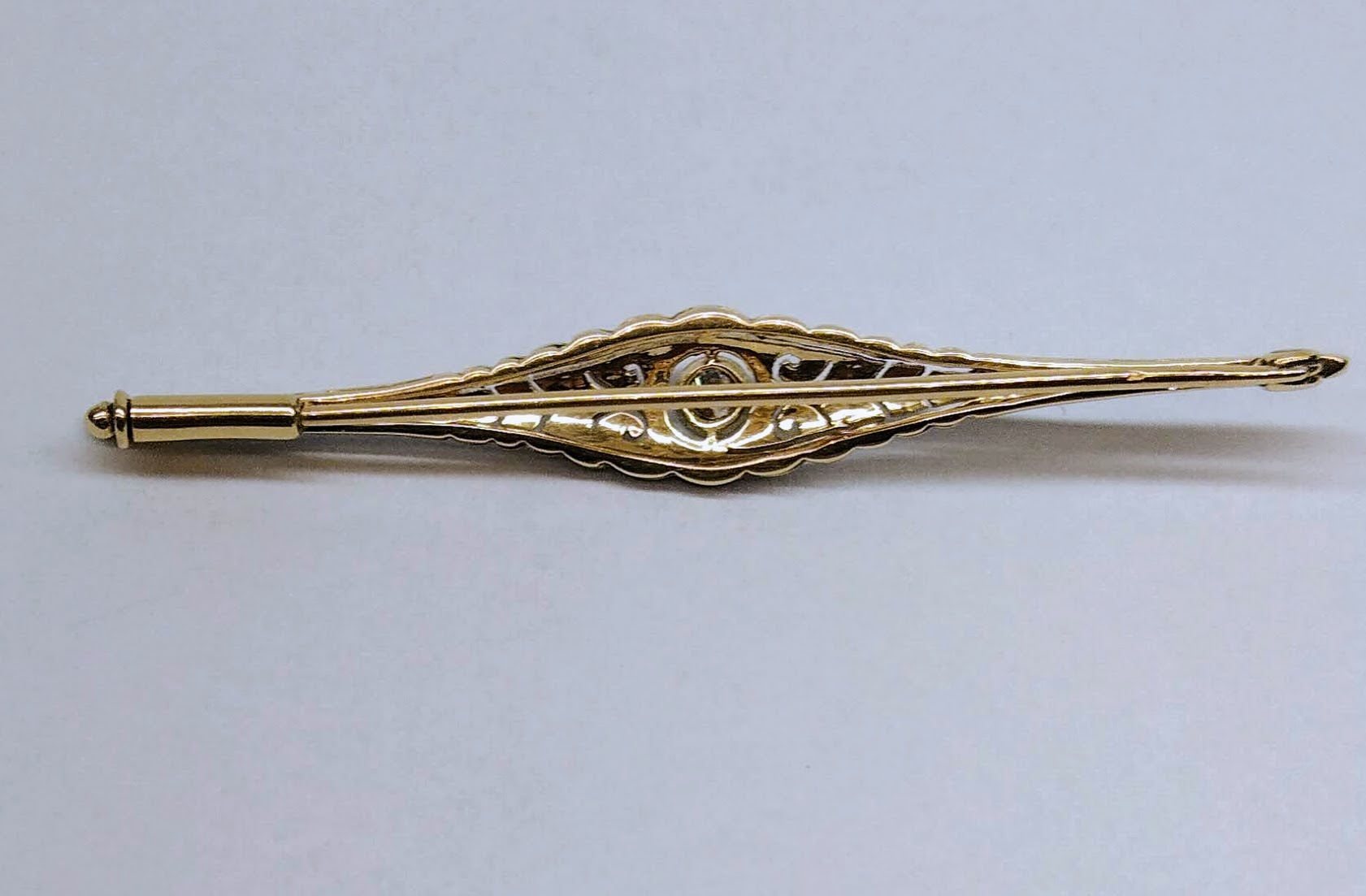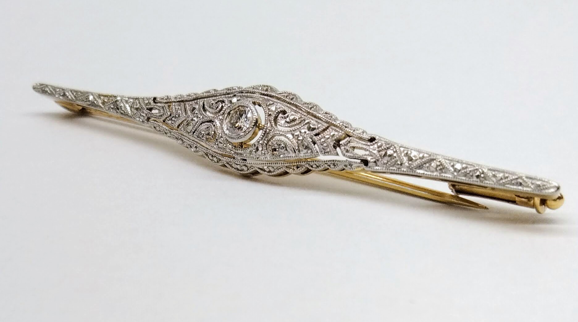 Subtilní jemná art-deco brož z bílého a žlutého zlata se středovým diamantem briliantového brusu o velikosti 0,15 ct, zdobená prořezáváním a technikou granulace. Celková hmotnost 2,80 g, Au 585/1000, osvědčení Puncovního úřadu. Elegantní šperk ve výborném stavu. Střední Evropa, druhá čtvrtina 20. století, délka 5,5 cm, šířka 0,8 cm.