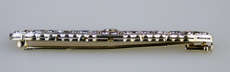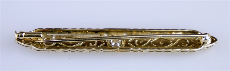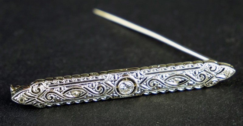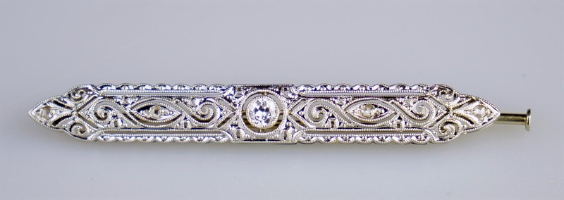 Jemná decentní art-deco brož z bílého zlata se středovým diamantem briliantového brusu o velikosti 0,2 ct a 4 diamanty routového brusu. Celková hmotnost 3,85 g, Au 585/1000, dovozový punc lyra (Z-34). Elegantní šperk ve výborném stavu. Střední Evropa, druhá čtvrtina 20. století, délka 4,9 cm, šířka 0,8 cm.