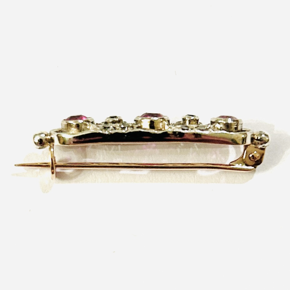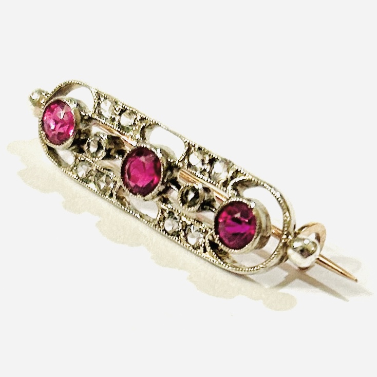 Drobnější, zářivá brož z období raného art-deco, tělo ve tvaru podlouhlého oválu bohatě členěné prořezáváním a osazeno syntetickými rubíny a leukosafíry kulatého brusu, kameny uloženy v bílém zlatě. Okraje zušlechtěny technikou zrnkování, po stranách doplněno granulovanými kuličkami. Západoevropská klenotnická práce z počátku 20. let 20. století.