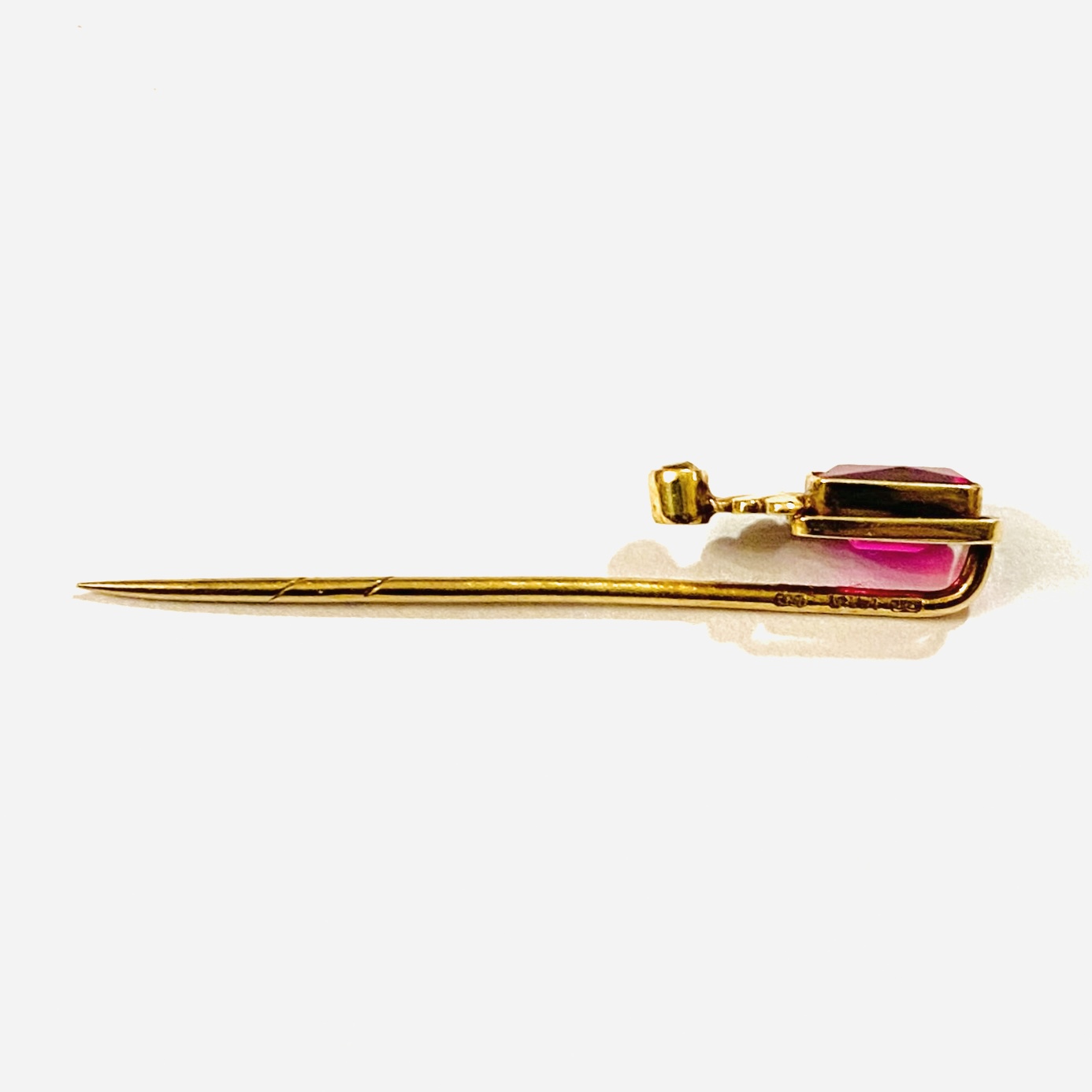 Půvabná jehlice do kravaty či klopy z období art-deco, hlavice osazena syntetickým rubínem obdélného brusu a leukosafírem kulatého brusu, oba kameny fasovány v zrnitých obrubách, zdobeno stylizovaným vějířovým motivem. Precizní práce pražského (Královské Vinohrady) klenotníka Jaroslava Seidla z 30. let 20. století.