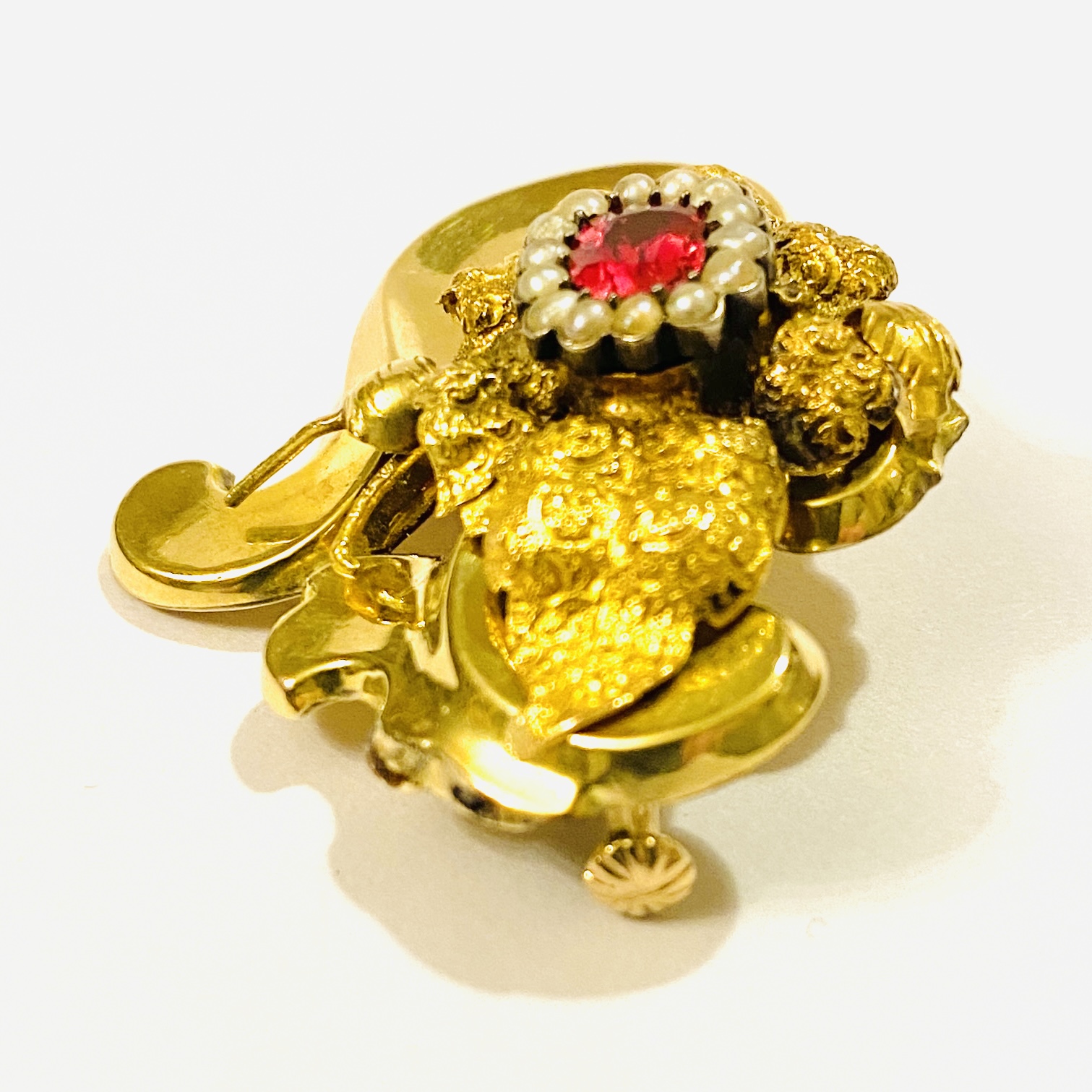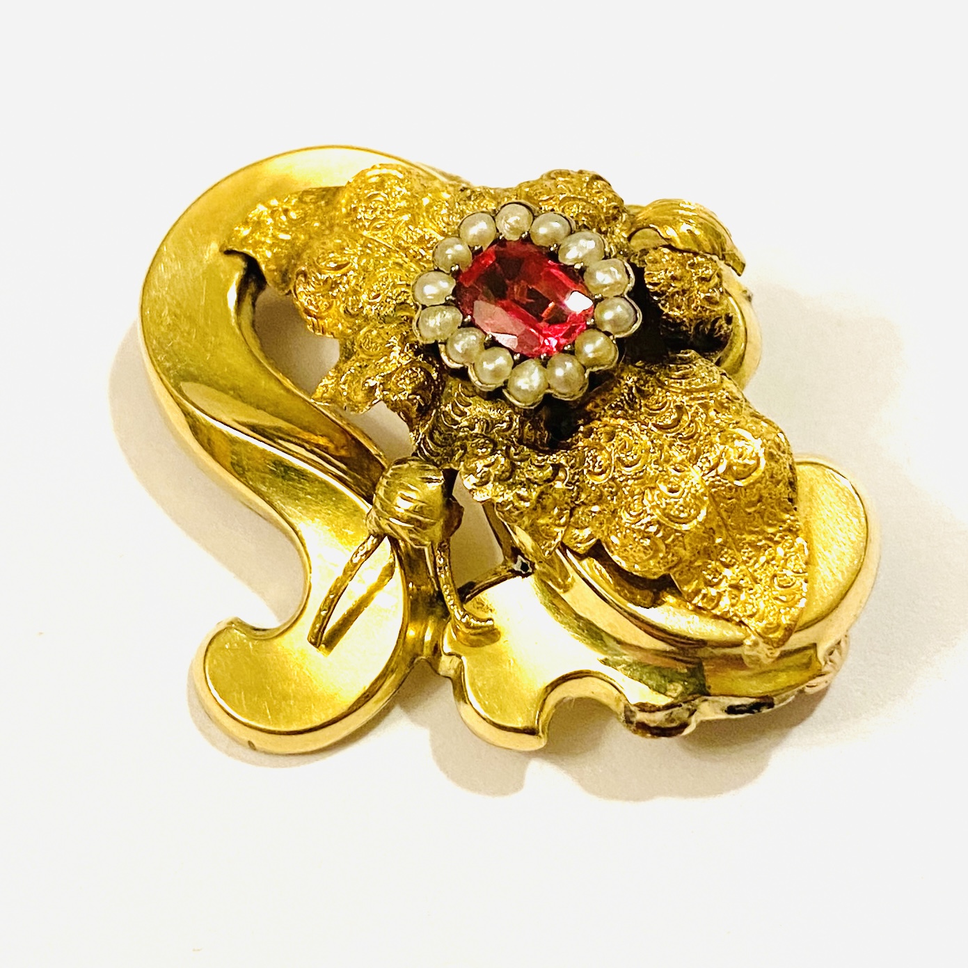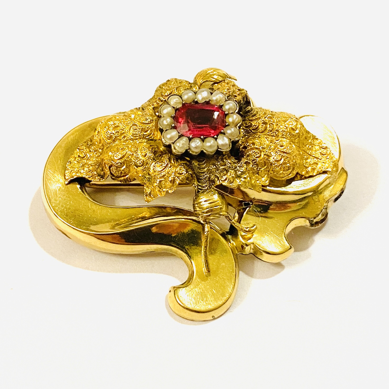 Dekorativní, honosnější brož z období biedermeieru, plasticky tvarovaně tělo rokajového tvaru s jemně rytou kontrastní aplikací v podobě listů, osazeno červeným sklem (imitující rubín) starého obdélného brusu, rámováno 14 přírodními perlami. Precizní středoevropská zlatnická práce z 2. čtvrtiny 19. století.