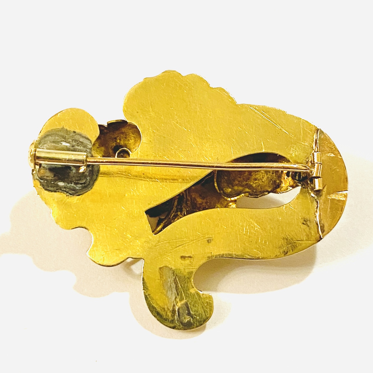 Zhotoveno ze žlutého, tělo ze 16,1 karátového, tj. o ryzosti 670/1000, jehla ze 14 karátového zlata, tj. o ryzosti 585/1000; vyhotoveno osvědčení puncovního úřadu, neznačeno. Hmotnost 10,30 g, délka 39 mm, šířka 32 mm. Mladší zapínání s trombónovou pojistkou v pořádku, v minulosti opravováno cínem (není při nošení patrné), jinak v dobrém stavu.