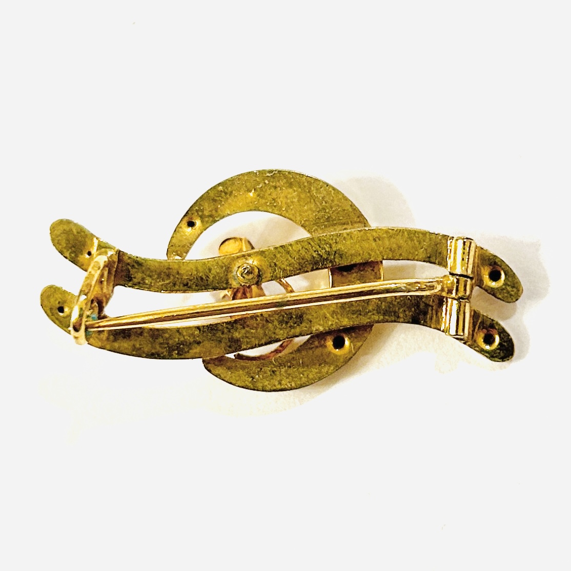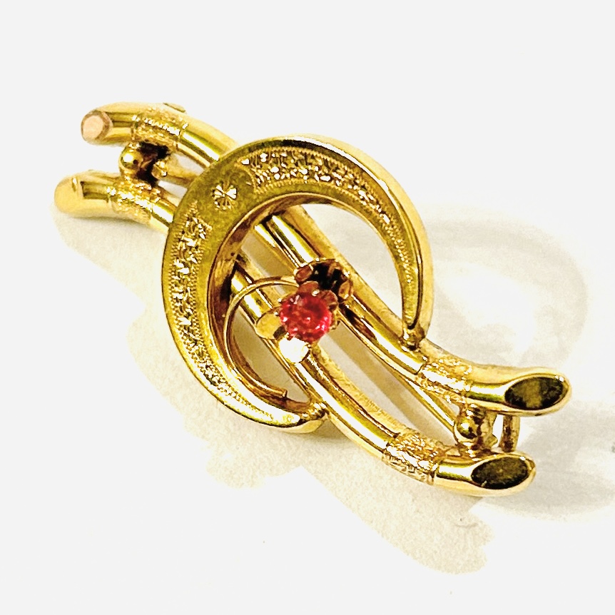 Elegantní brož z období doznívajícího biedermeieru, tělo tvořené dvěma zvlněnými liniemi s vystupující aplikací ve tvaru srpku měsíce, centrální květ osazený světle rubínovým sklem kulatého brusu fasovaného v mnohokrapnové koruně, místy zdobeno jemným rytím. Kvalitní středoevropská zlatnická práce z 50. až 60. let 19. století.