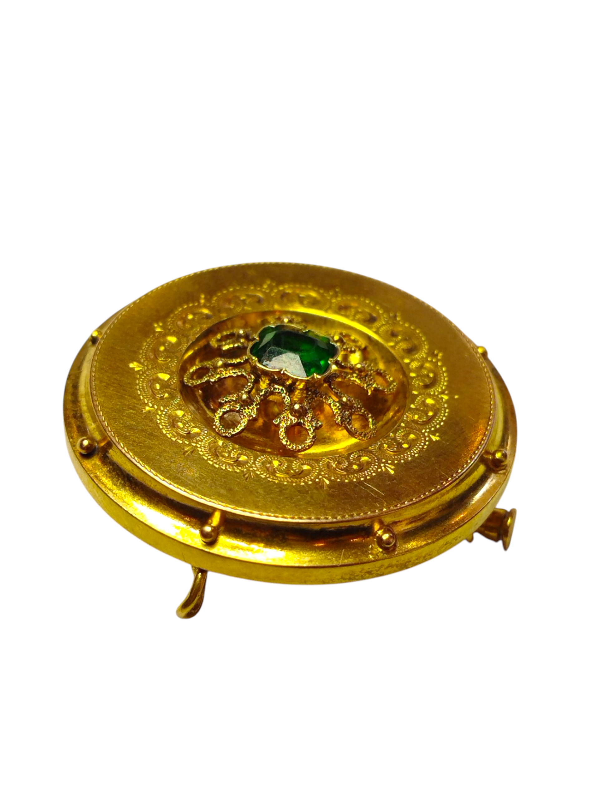 Krásná brož z 1.pol. 19.století, období Biedermeier, osazen zelený kámen (imitace smaragdu), kámen nese známky nošení, jinak je brož v perfektním stavu, punc – Liška, Rakousko-Uhersko.