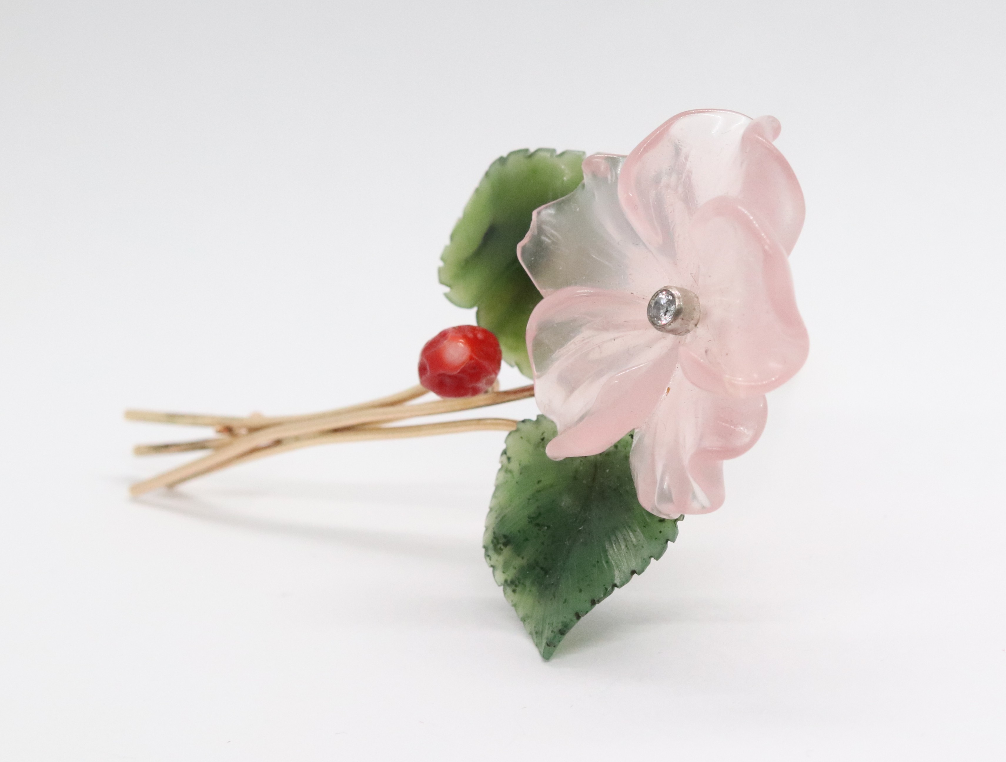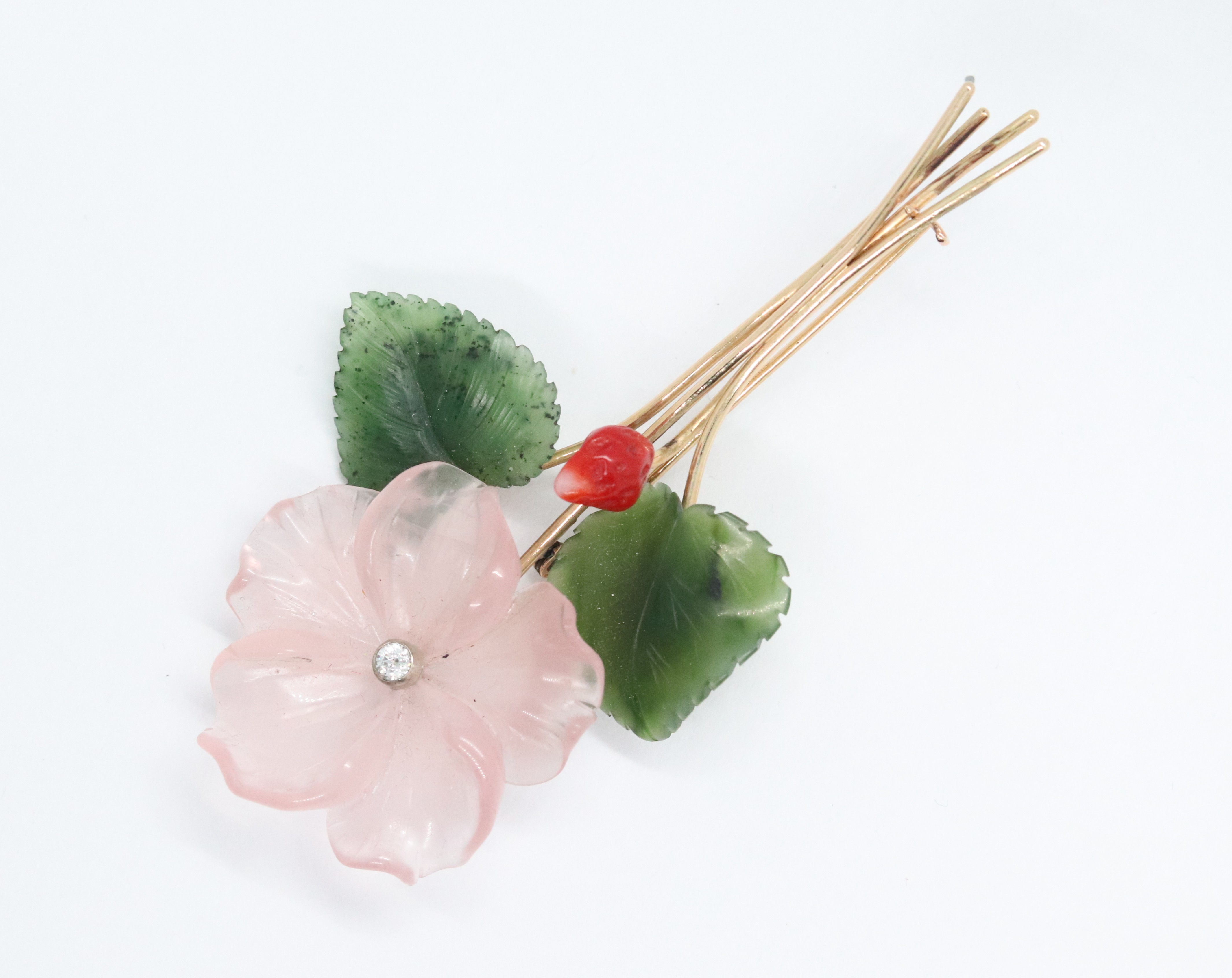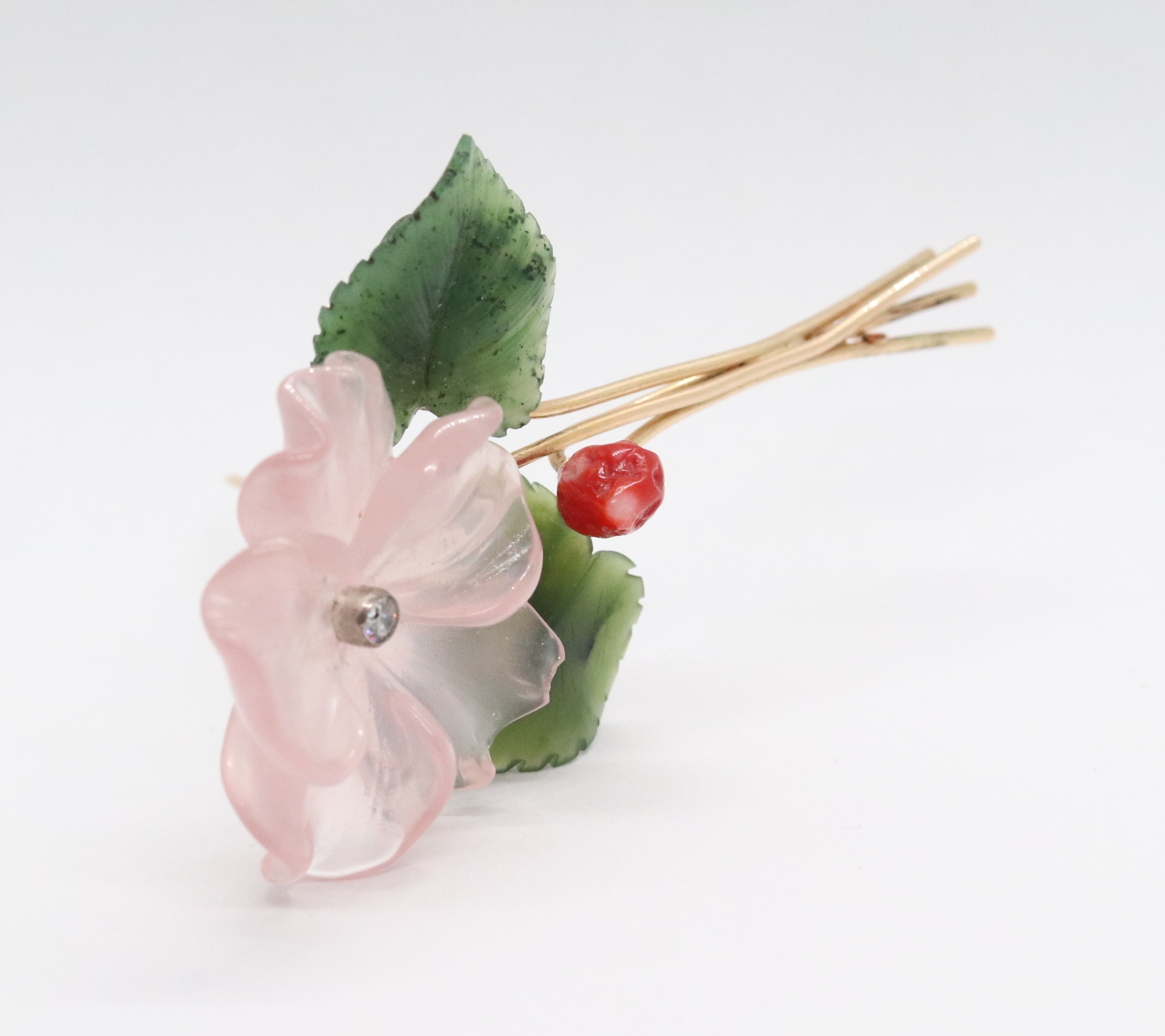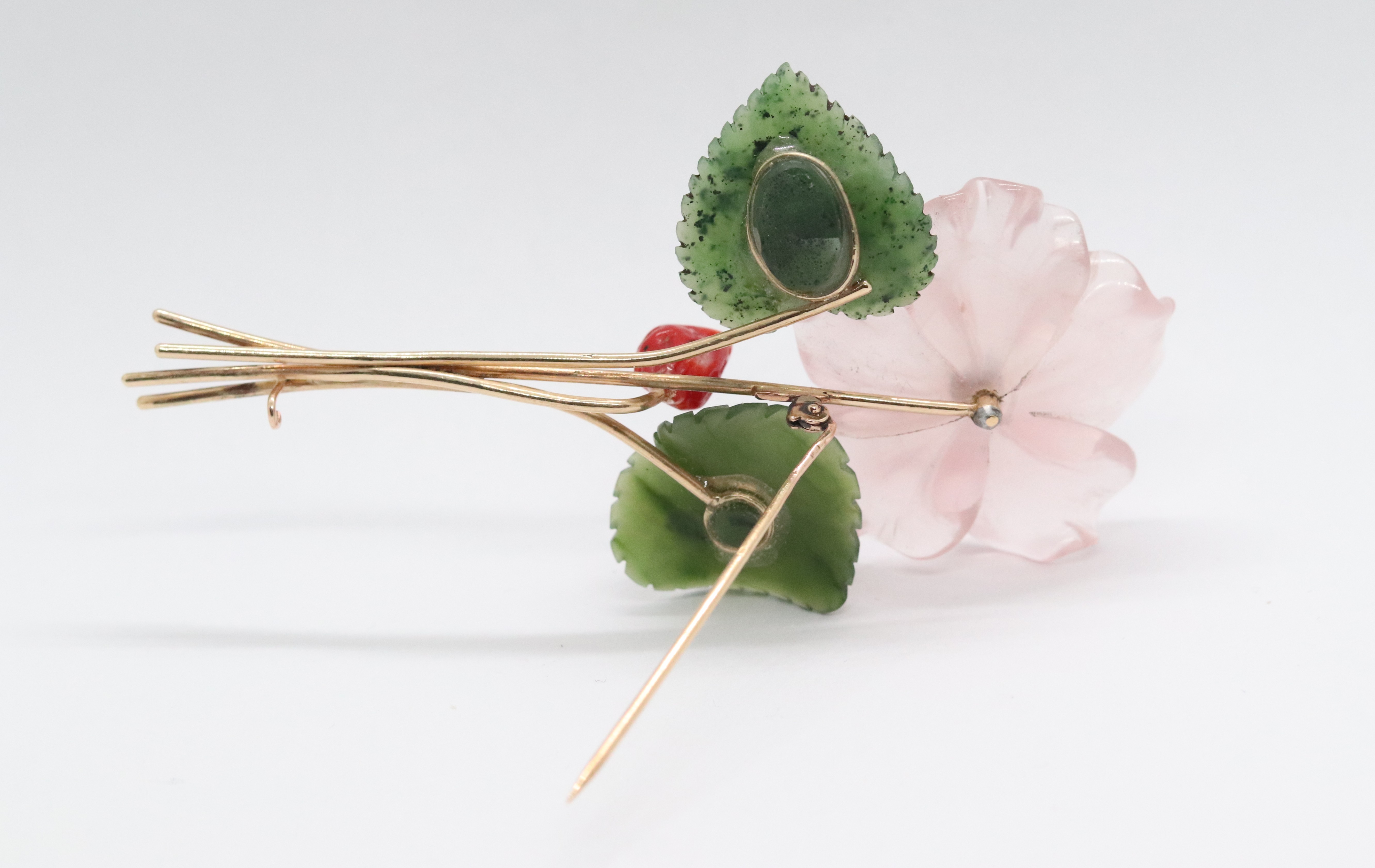 Zlatá velká brož v podobě jahůdky, květ z růženínu, listy z nefritu, jahůdka z chalcedonu, doplněná diamantem briliantového brusu o hmotnosti 0,10 ct, Au btto 27,40g/585/1000; délka 10 cm, šířka 5,5 cm