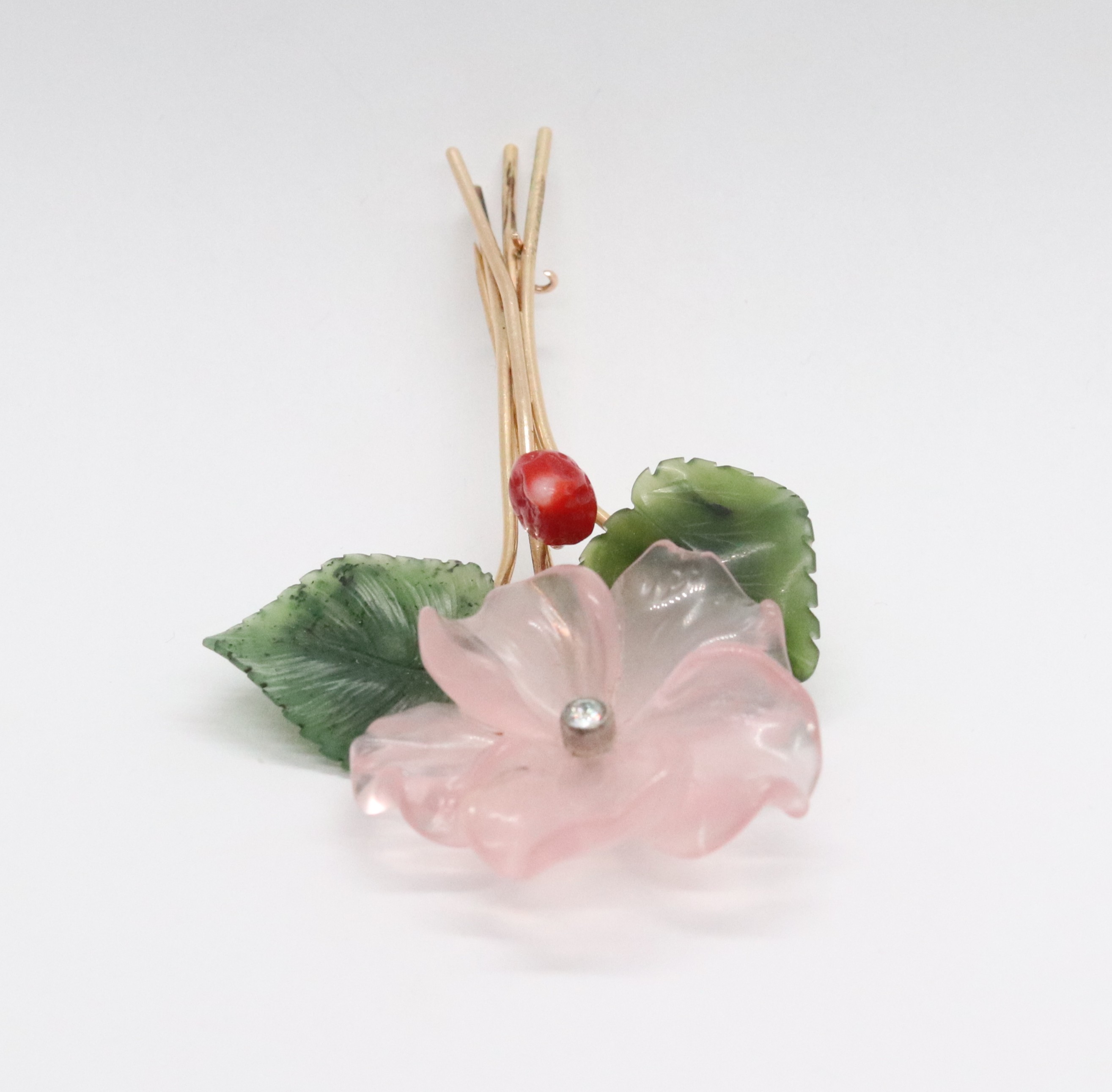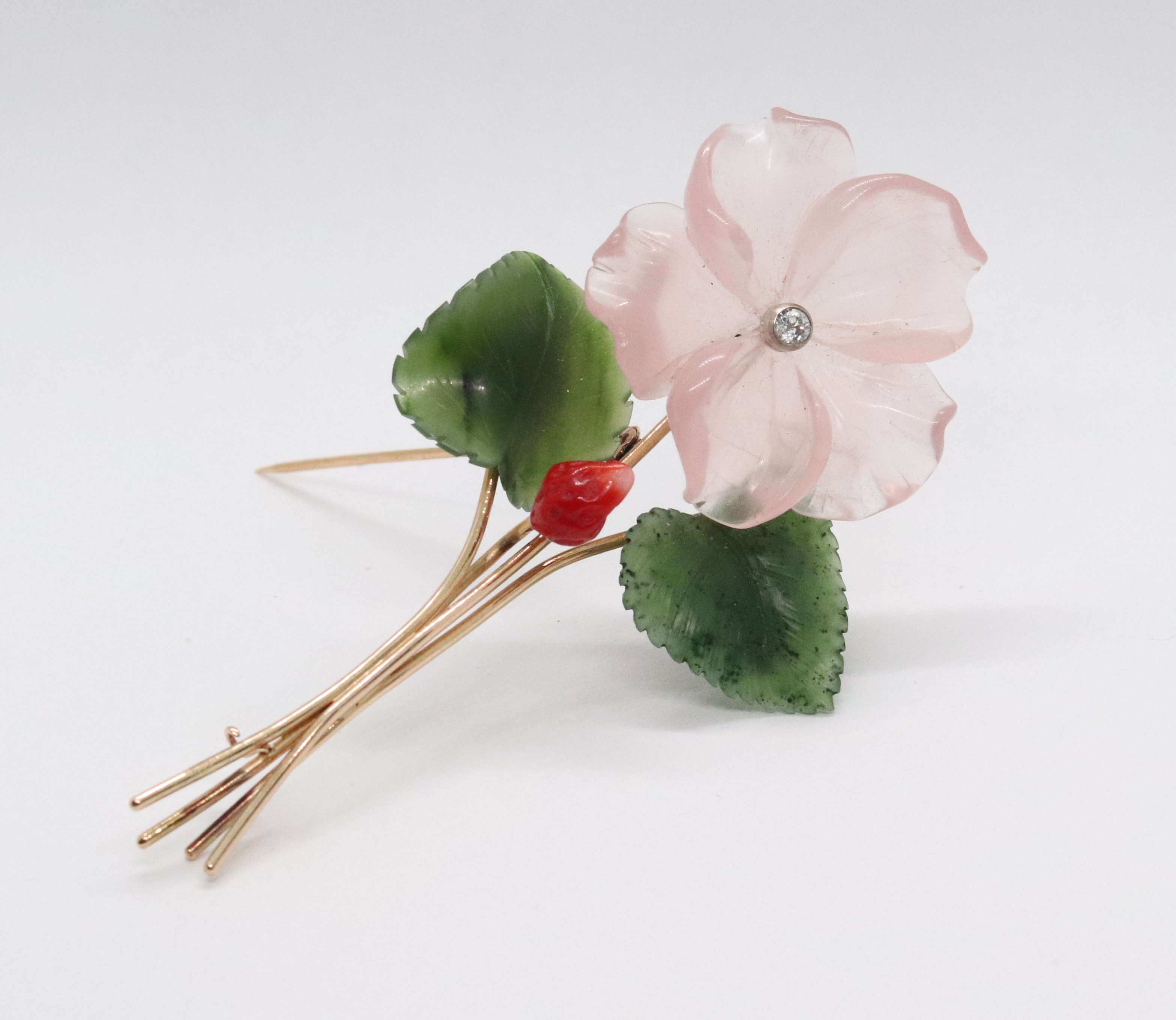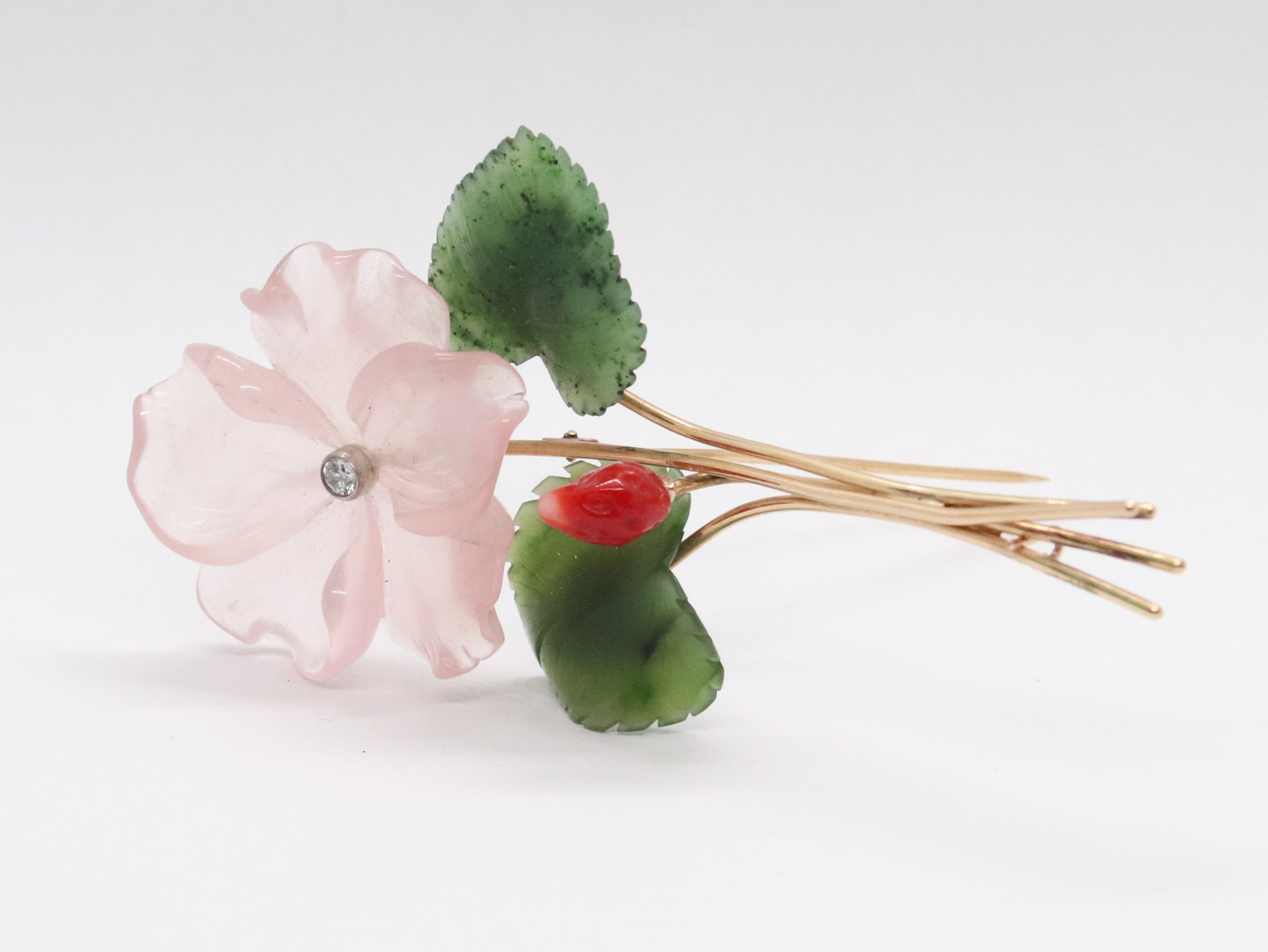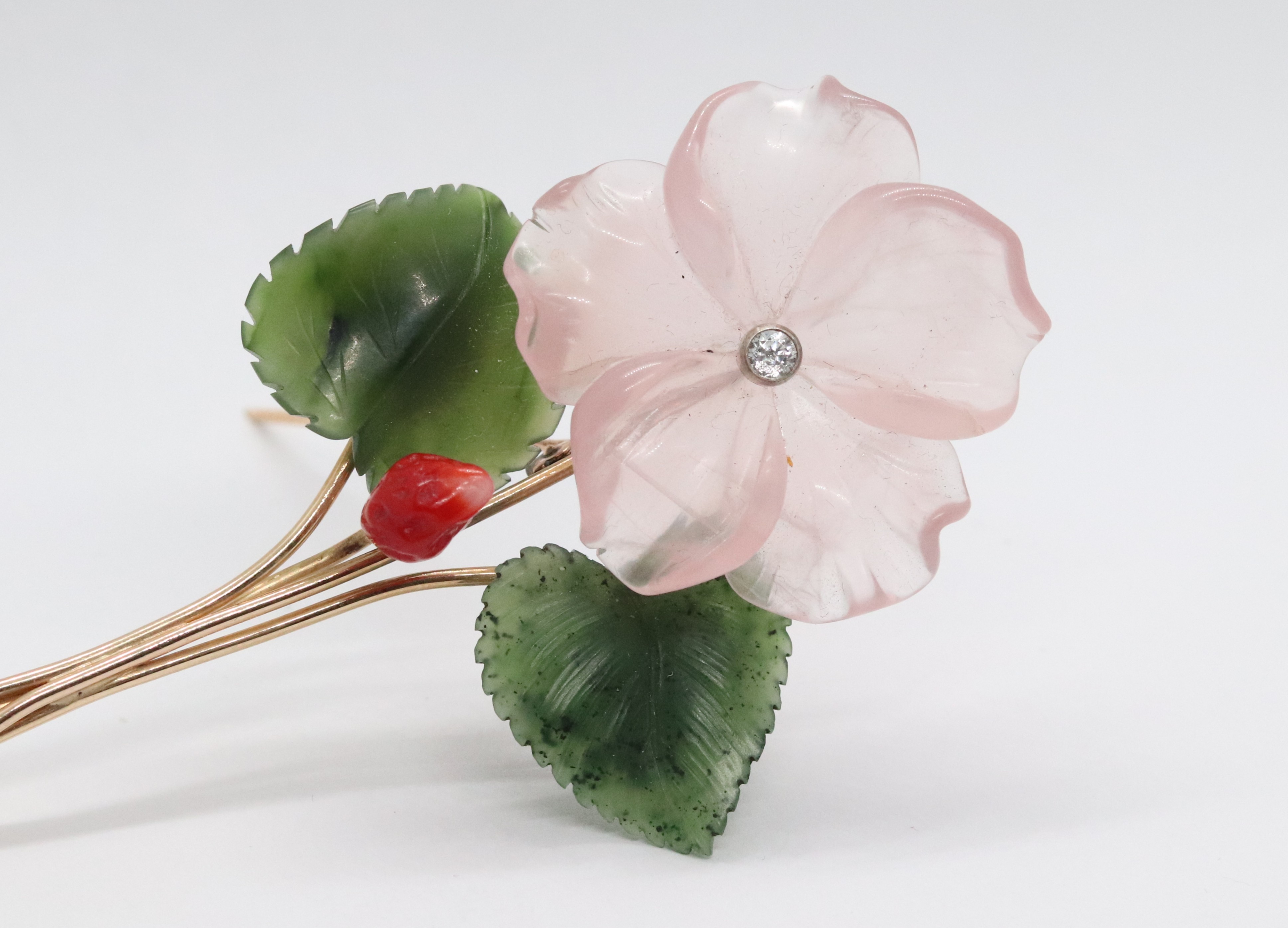 Zlatá velká brož v podobě jahůdky, květ z růženínu, listy z nefritu, jahůdka z chalcedonu, doplněná diamantem briliantového brusu o hmotnosti 0,10 ct, Au btto 27,40g/585/1000; délka 10 cm, šířka 5,5 cm