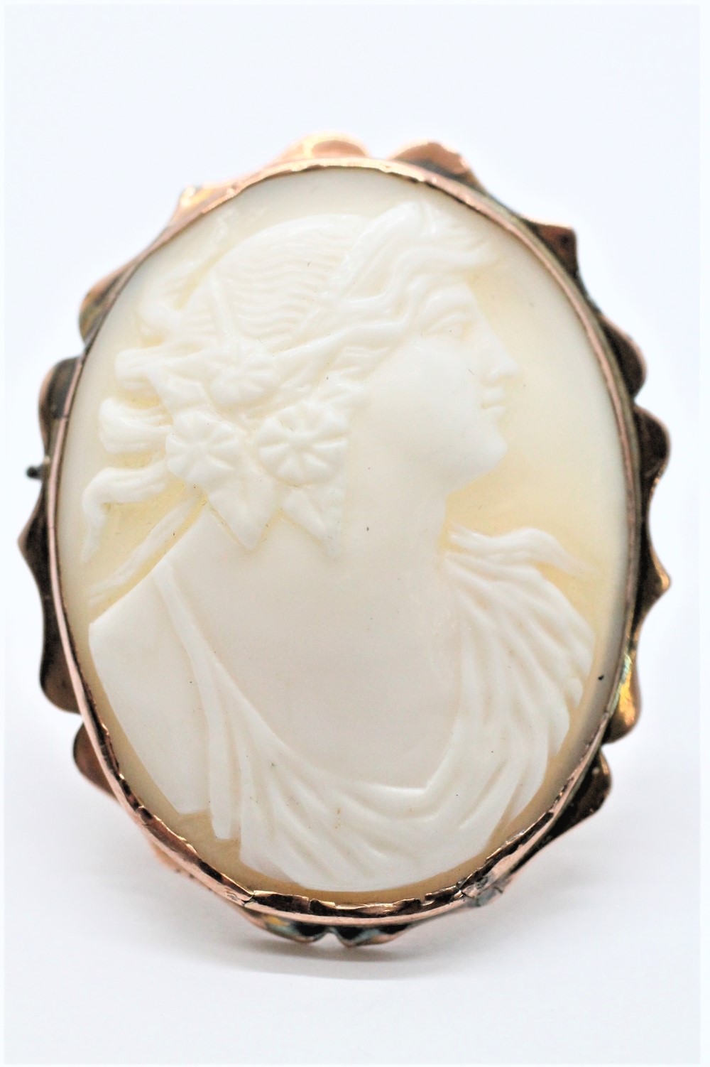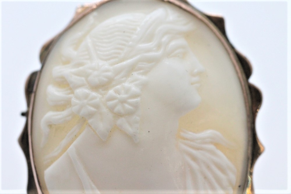 Zlatá brož – kamej. Žluté zlato 375/1000, jehla, zapínání – obecný kov. Velikost brože: 4,5 cm x 3,5 cm. Váha brože: 10,2 g.
