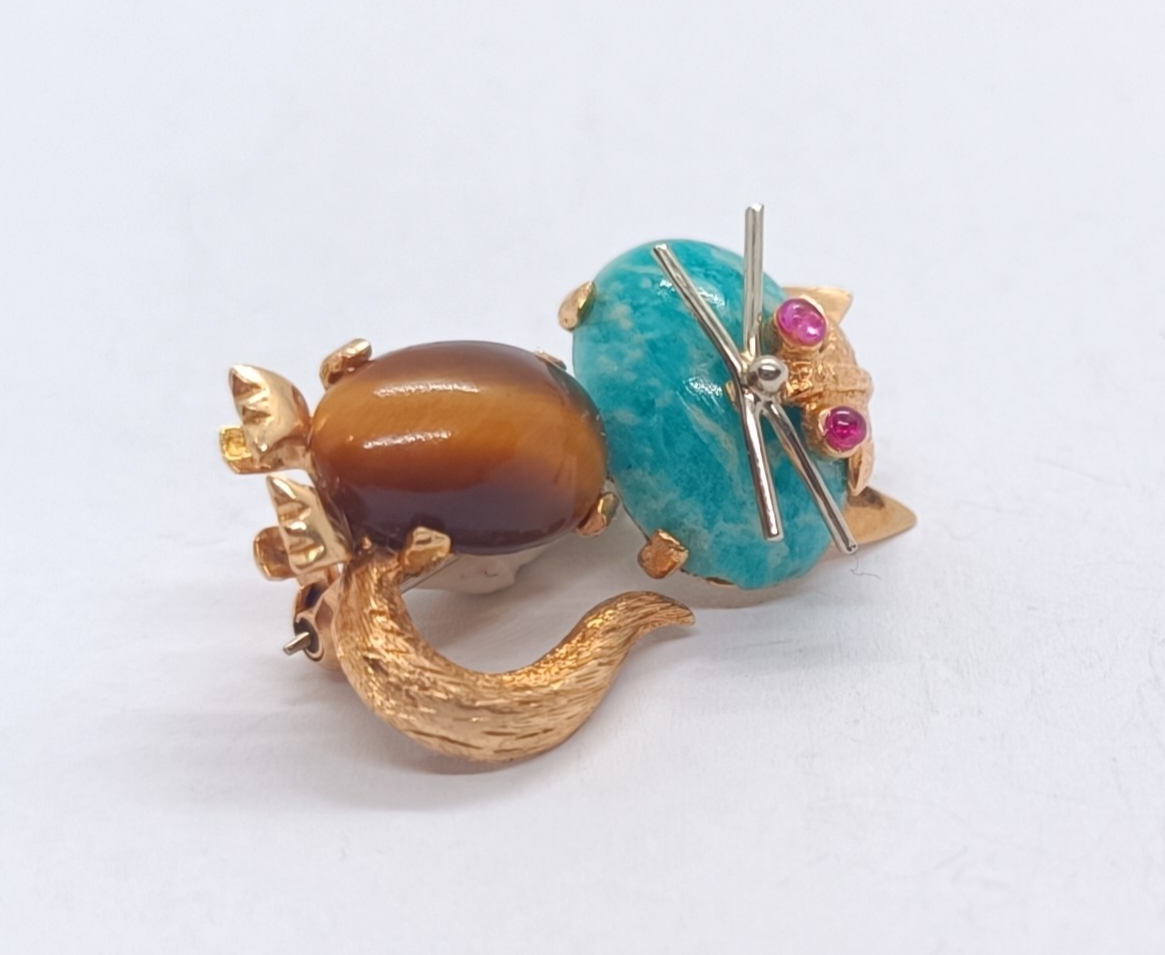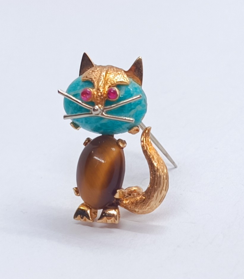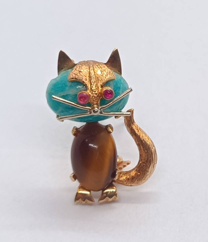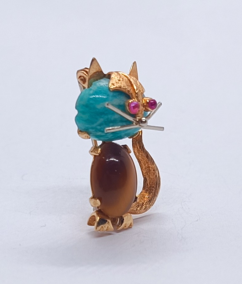 Zlatá brož v podobě kočky, tělo z tygřího oka, hlava z tyrkysu, oči z rubínků, zdobené gilošováním, Au btto 5,20g/750/1000, západní Evropa, 2. polovina 20. století, atest puncovního úřadu; délka 2,7 cm, šířka 2 cm