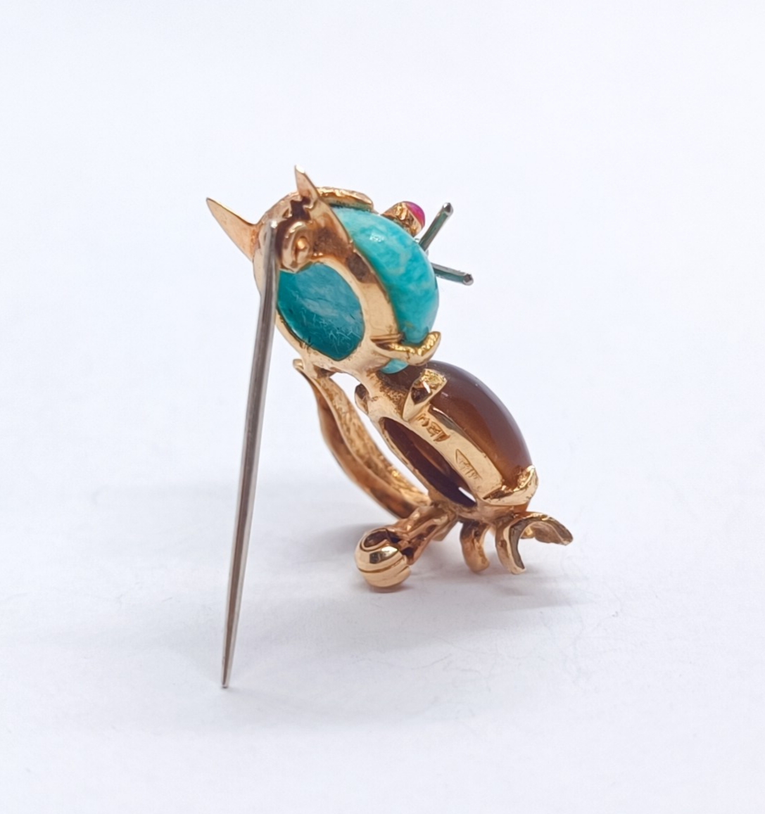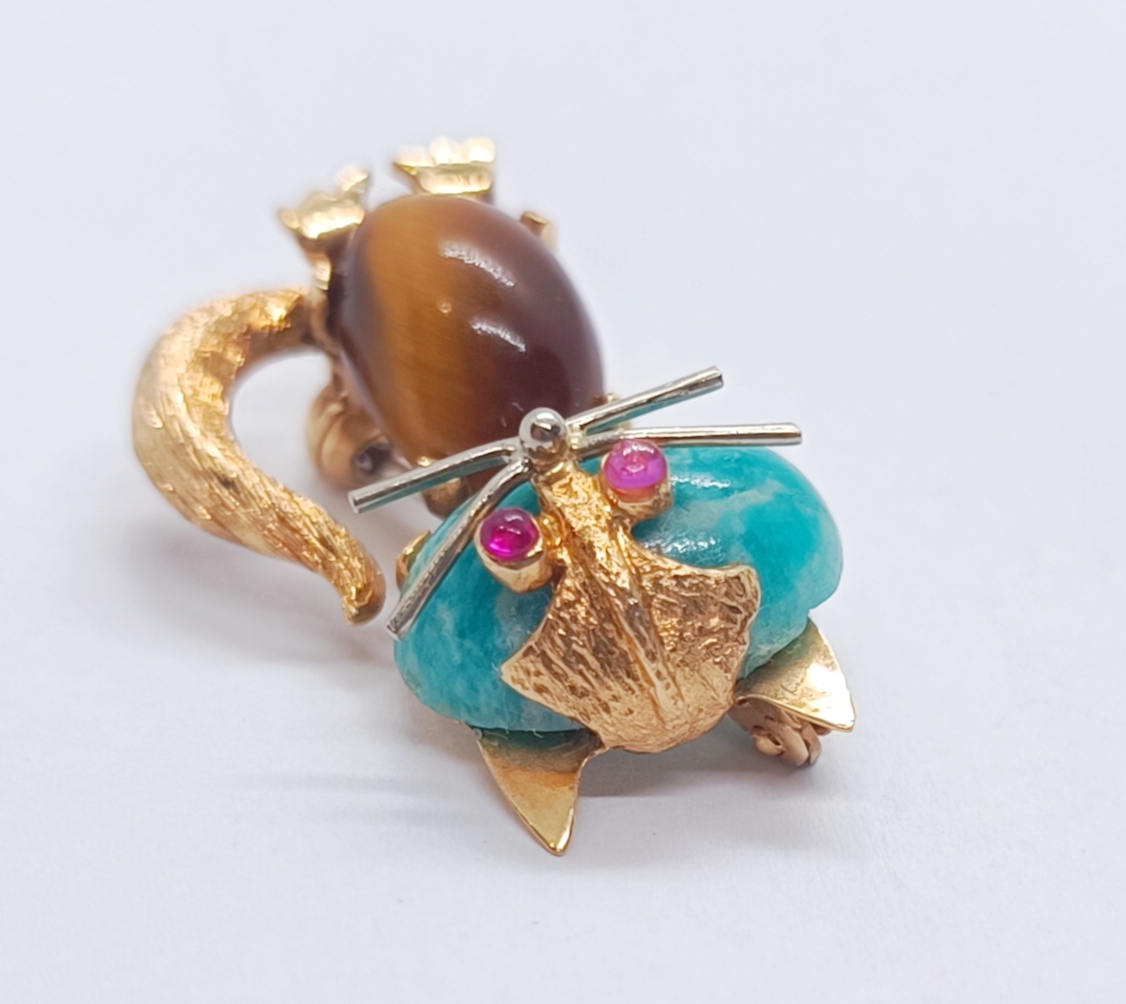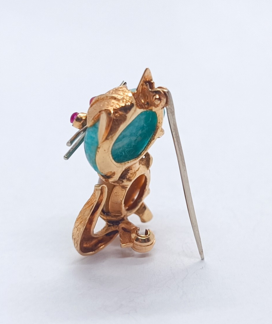 Zlatá brož v podobě kočky, tělo z tygřího oka, hlava z tyrkysu, oči z rubínků, zdobené gilošováním, Au btto 5,20g/750/1000, západní Evropa, 2. polovina 20. století, atest puncovního úřadu; délka 2,7 cm, šířka 2 cm