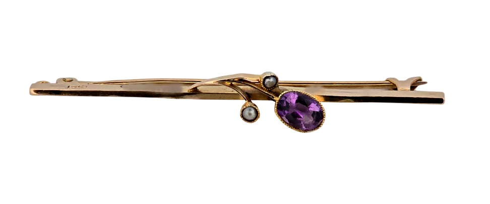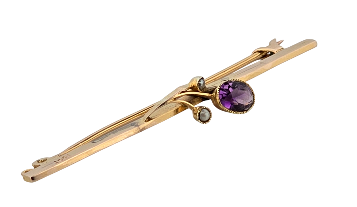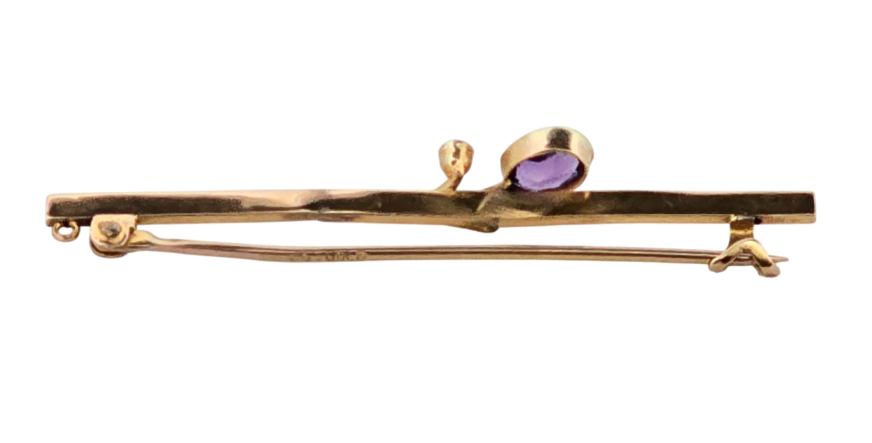 Popis: Starožitná zlatá brož zdobená fialovým amtystem a dvěmi drobnými perličkami. Zapínání klasické, plně funkční. 16ti karátové zlato 650/1000, jehla ze zlata 375/1000.