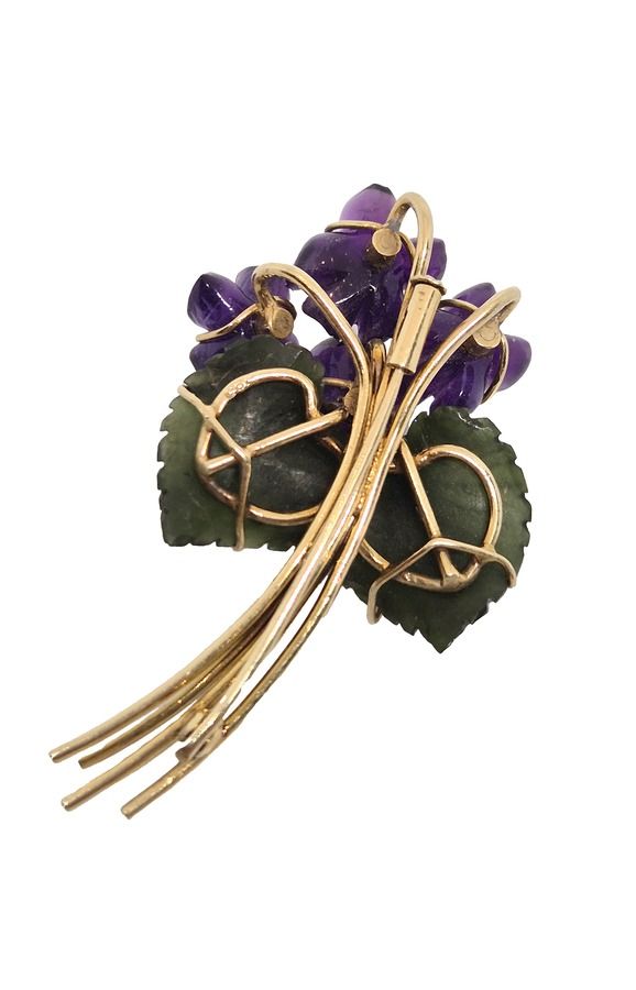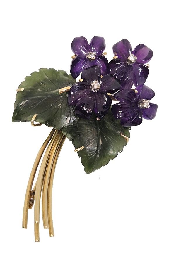 Zlatá brož s okvětními lístky z broušeného ametystu v nichž jsou zasazené bílé diamanty,