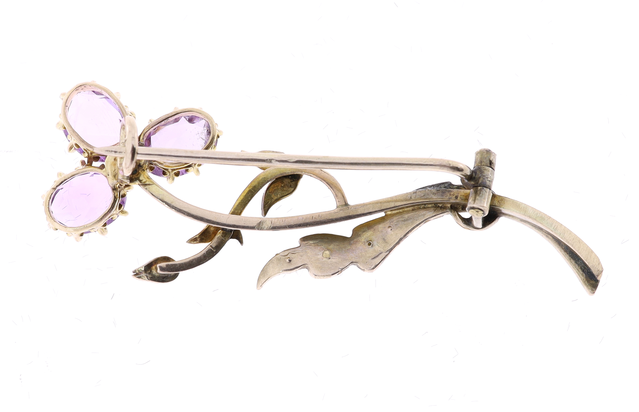 Elegantní historická brož zdobená třemi ametysty uspořádanými do tvaru květiny a drobnými říčními perličkami. Šperk pochází z přelomu 19. a 20. století a nese kombinaci ryzostí typických pro ruční zlatnickou práci daného období. Spodní část u větších kamenů je vyrobena ze zlata o ryzosti 333, krapny držící kameny jsou ze zlata o ryzosti 375 a ostatní dekorativní prvky mají přibližně 220–280. Celek působí velmi jemně a autenticky.