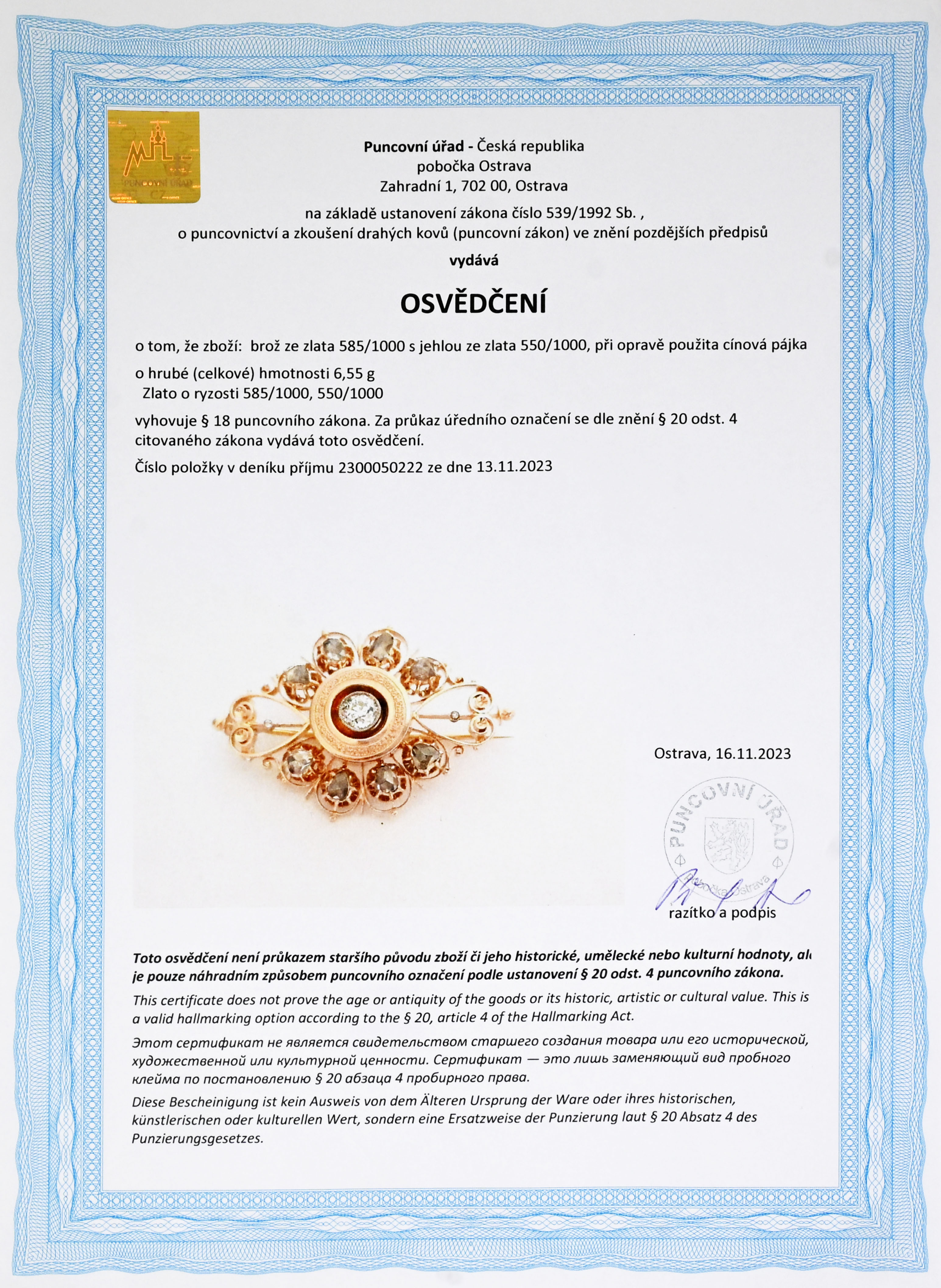 k broži je přiloženo osvědčení vydané puncovním úřadem, které potvrzuje pravost a kvalitu materiálu.