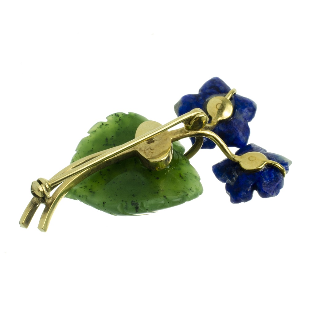 Brož ze žlutého zlata zdobená vyřezávanými drahými kameny (lapis lazuli nefrit, perličky) ve tvaru květiny.