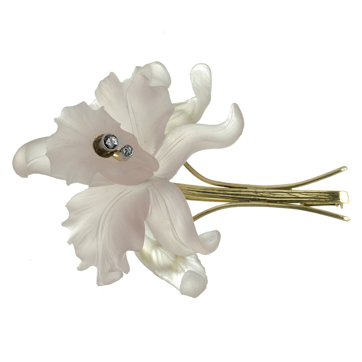 Luxusní brož ze žlutého zlata ve tvaru květiny. Okvětní lístky nádherně vyřezávané z růženínu s drobnými brilianty.