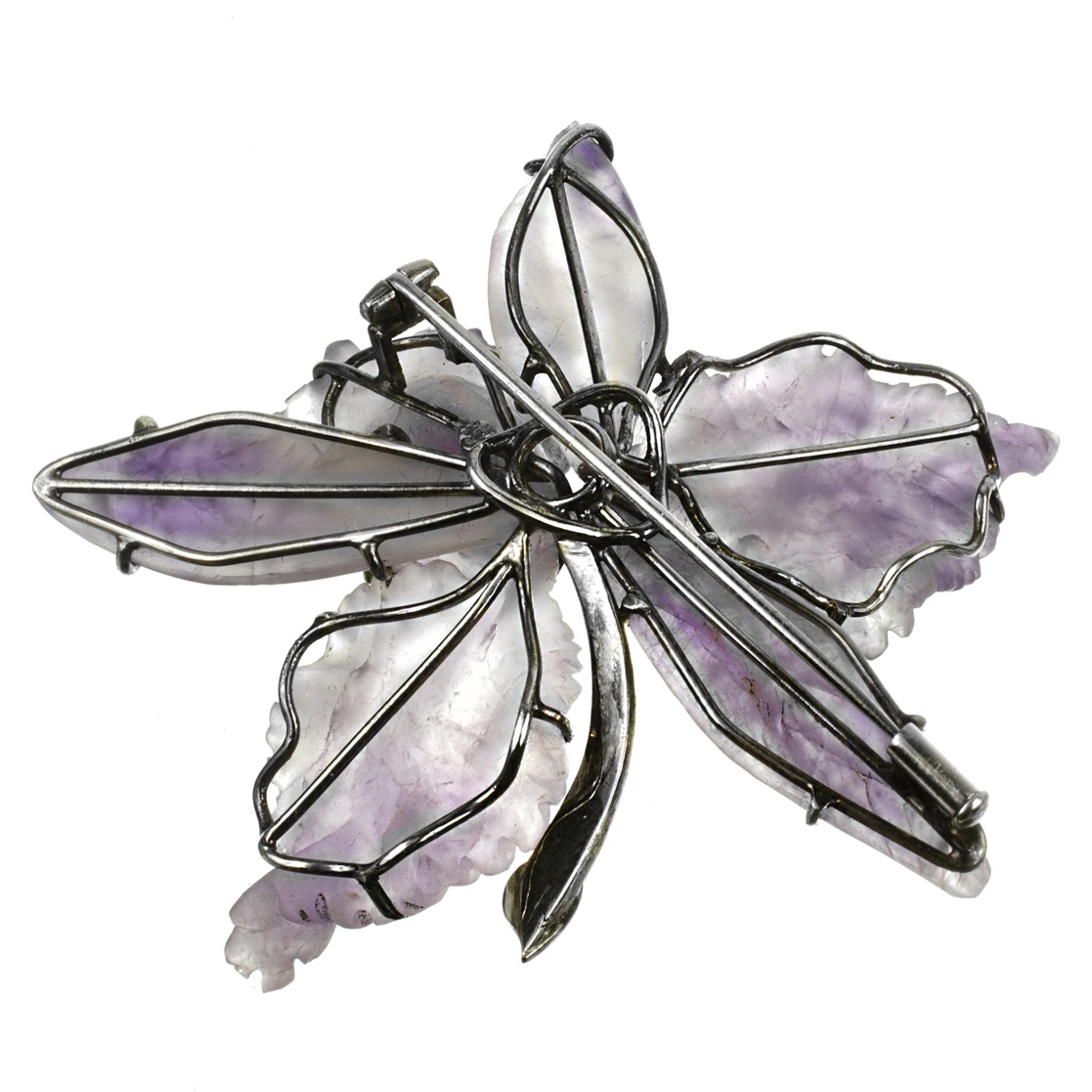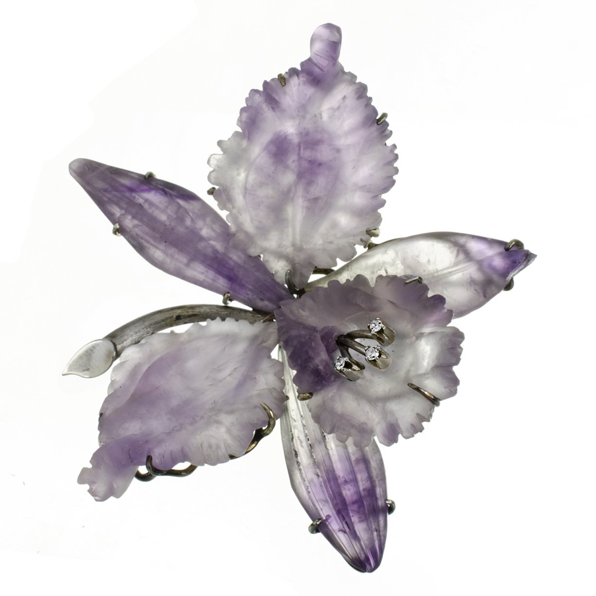 Luxusní brož z bílého zlata ve tvaru orchideje. Okvětní lístky nádherně vyřezávané z ametystu s drobnými brilianty.