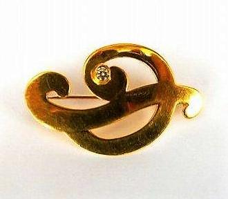 Připínací zlatá brož s bílým kamínkem 18 karátů – Au 750/1000 Váha brutto 4,55 gramů s jedním bílým zirkonem. Ruční výroba. Puncováno platným puncem.