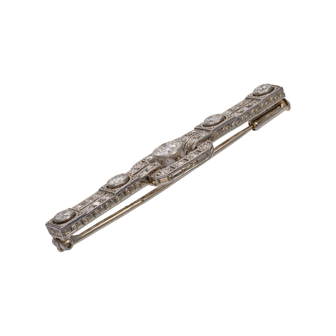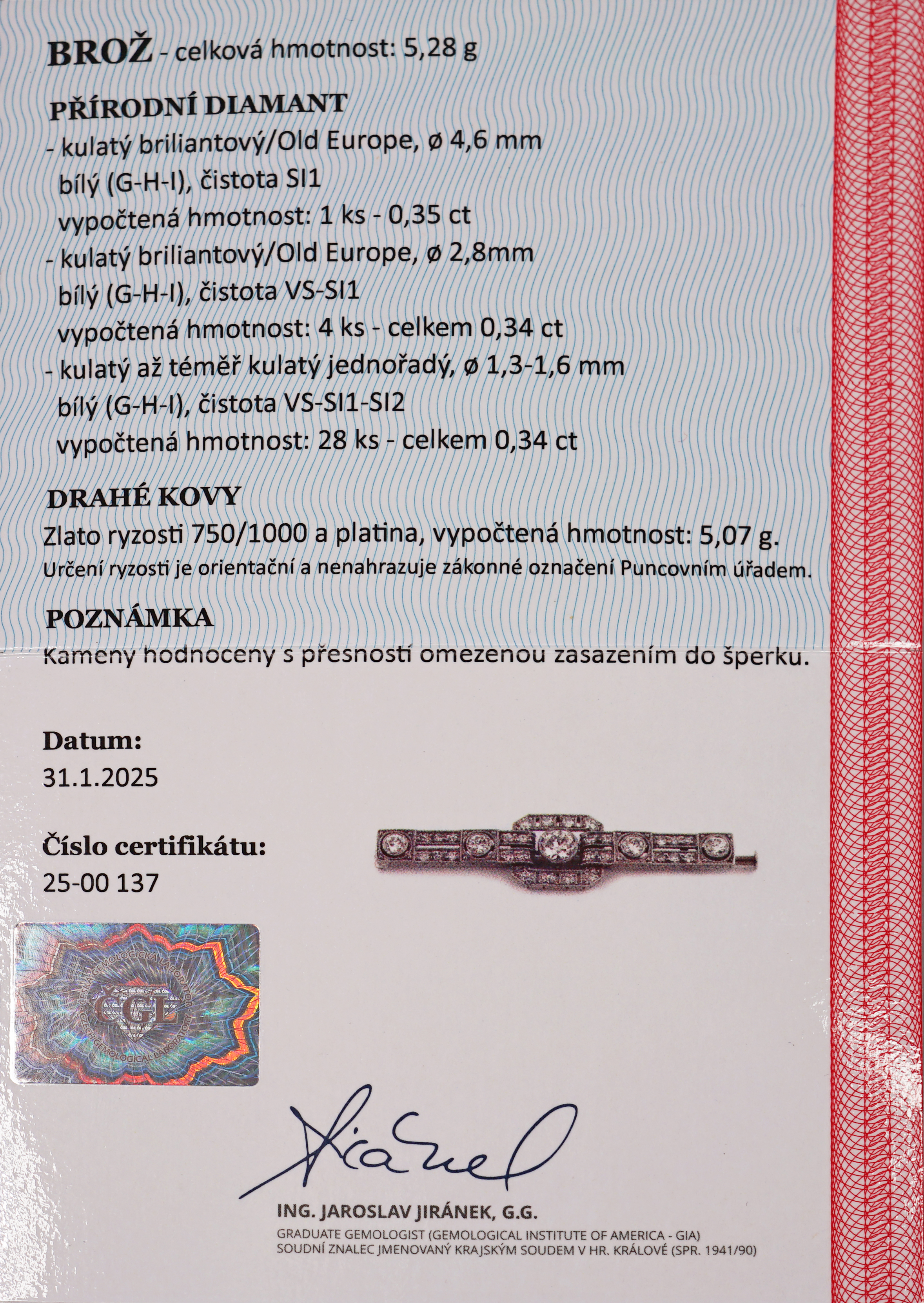 Materiál: bílé zlato o ryzosti 800/1000, brož ze zlata s kameny uloženými v platině