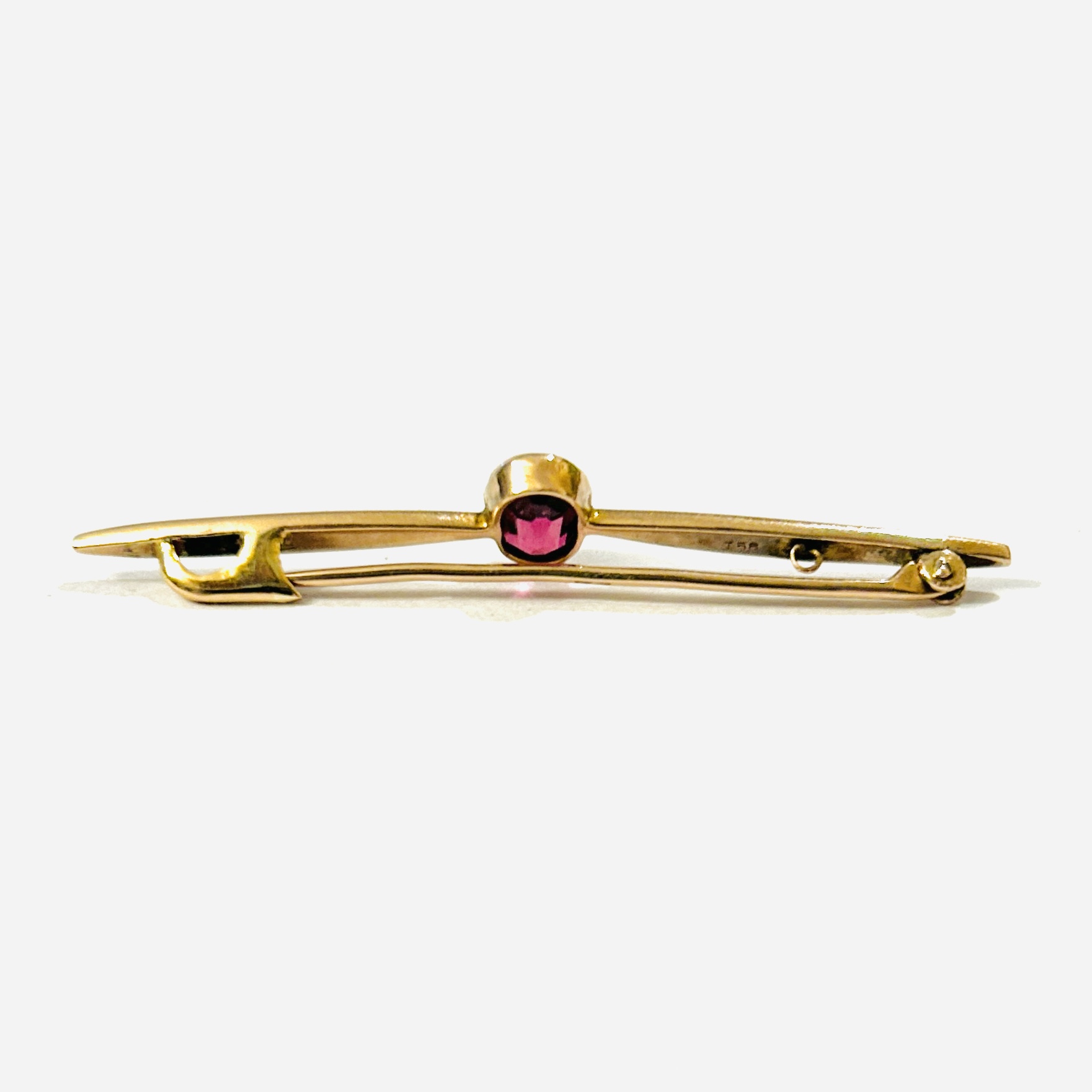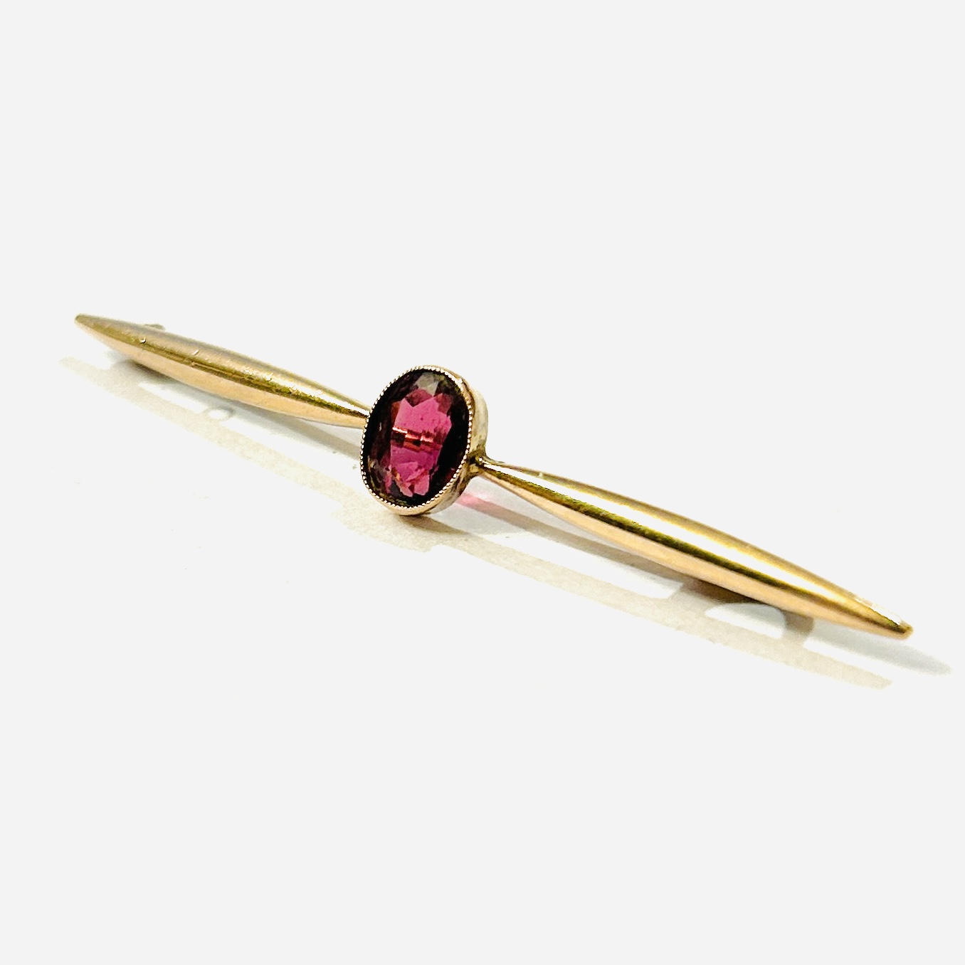 Decentní, elegantní podlouhlá brož z období secese, dynamicky tvarovaná ramena uprostřed osazeny v zrnité obrubě přírodním almandinem (se silným fialovým nádechem) oválného brusu. Kvalitní západoevropská zlatnická práce z první pětiny 20. století.