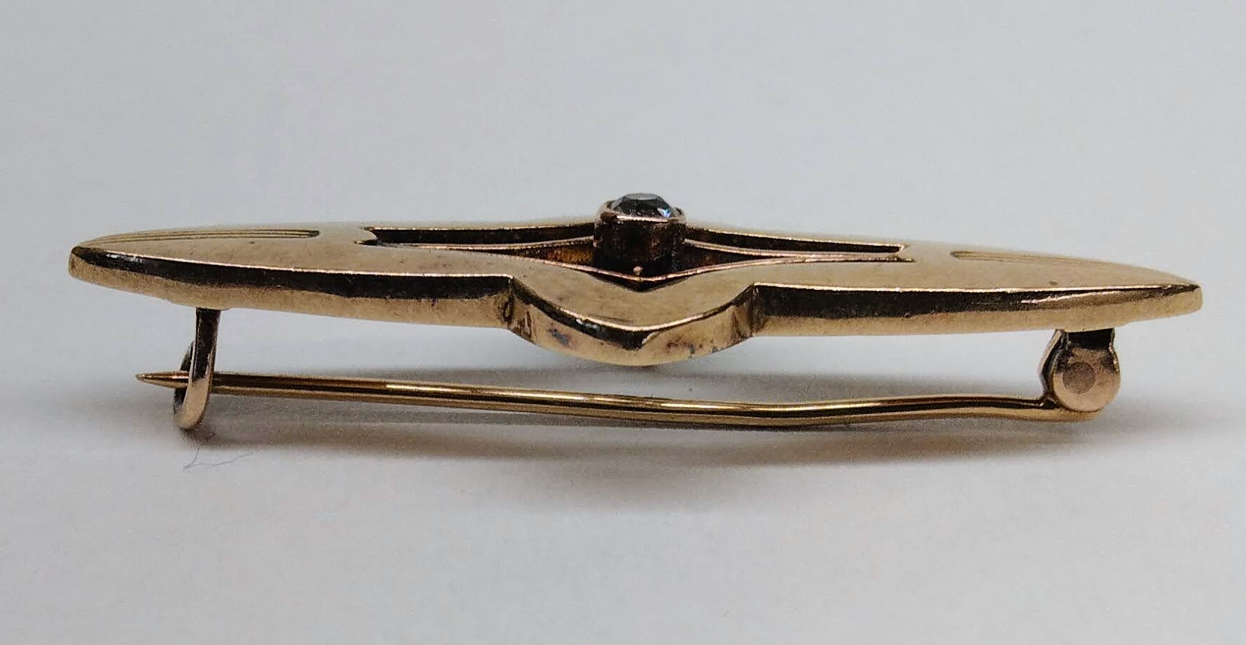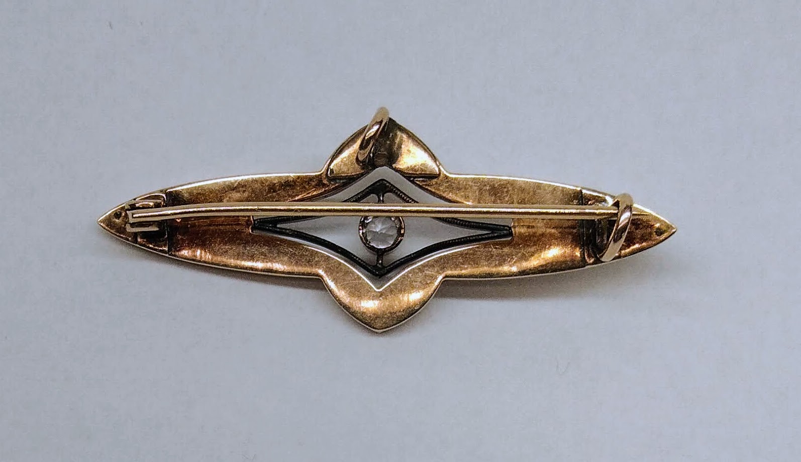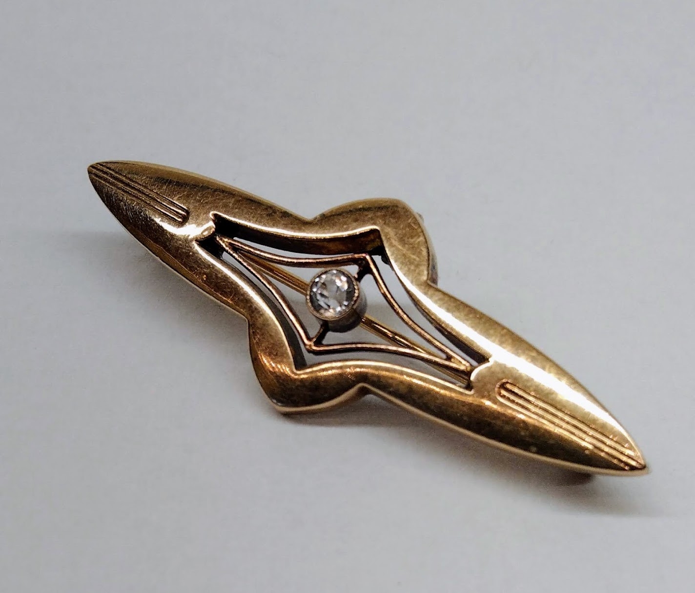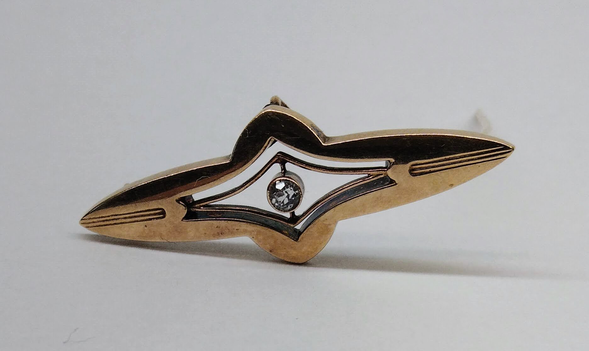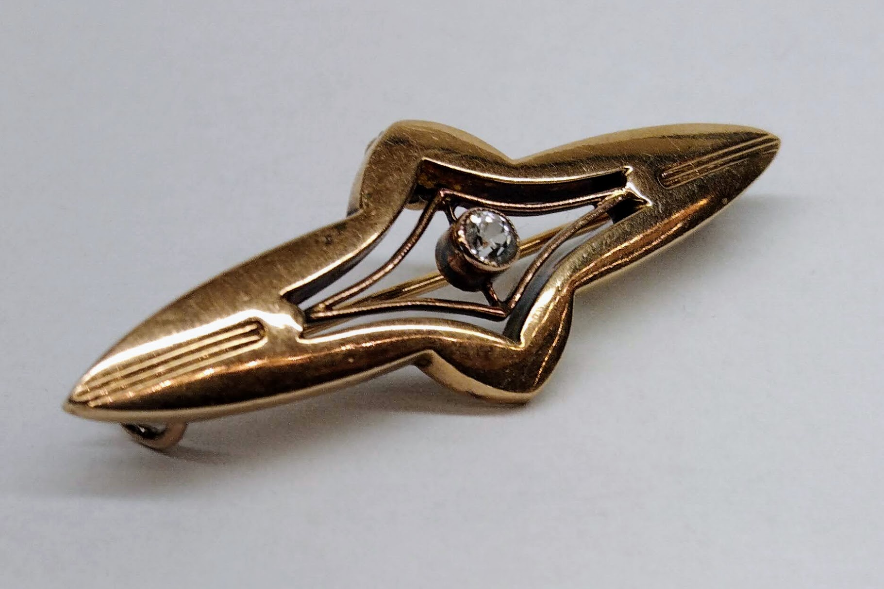 Vkusná secesní zlatá brož s diamantem starého briliantového brusu o velikosti 0,15 ct, s očkem pro zavěšení. Celková hmotnost 2,45 g, Au 580/1000, osvědčení Puncovního úřadu. Stylový šperk ve výborném stavu. Rakousko-Uhersko, začátek 20. století, délka 4 cm, šířka 1,5 cm.