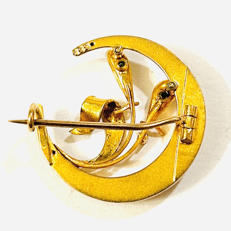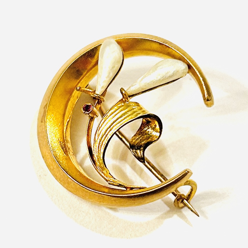 Velice půvabná brož z období secese, tělo ve tvaru srpku měsíce s ladným florálním motivem, osazeno drobným přírodním rubínem kulatého brusu a 2 přírodními říčními perlami, jež vynikají svým organickým tvarem. Efektně potaženo matným dukátovým zlatem. Precizní německá zlatnická práce z počátku 20. století. Vyrobeno technikou dutého kovu.
