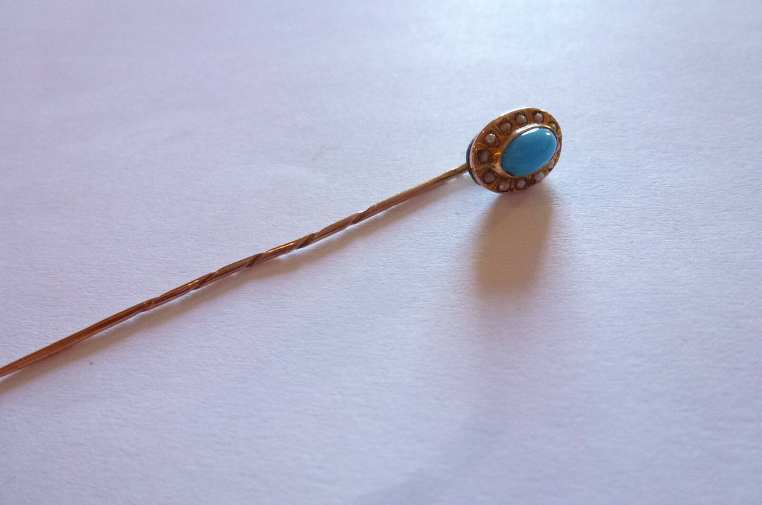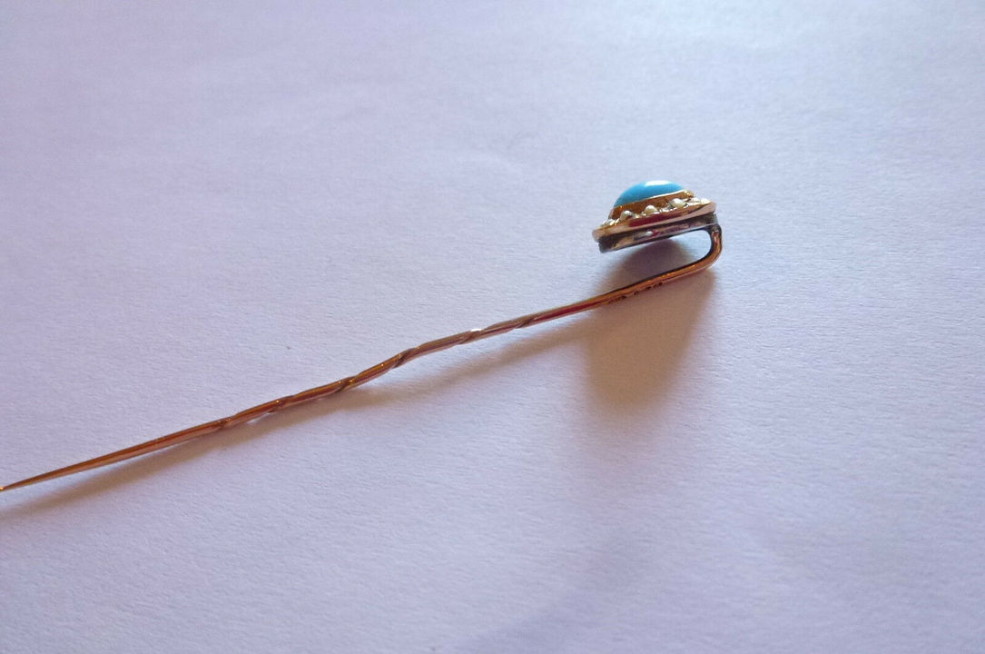 Zlatá jehlice do kravaty s tyrkysem a perličkami, Rakousko – Uhersko,