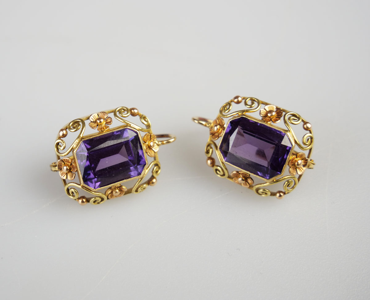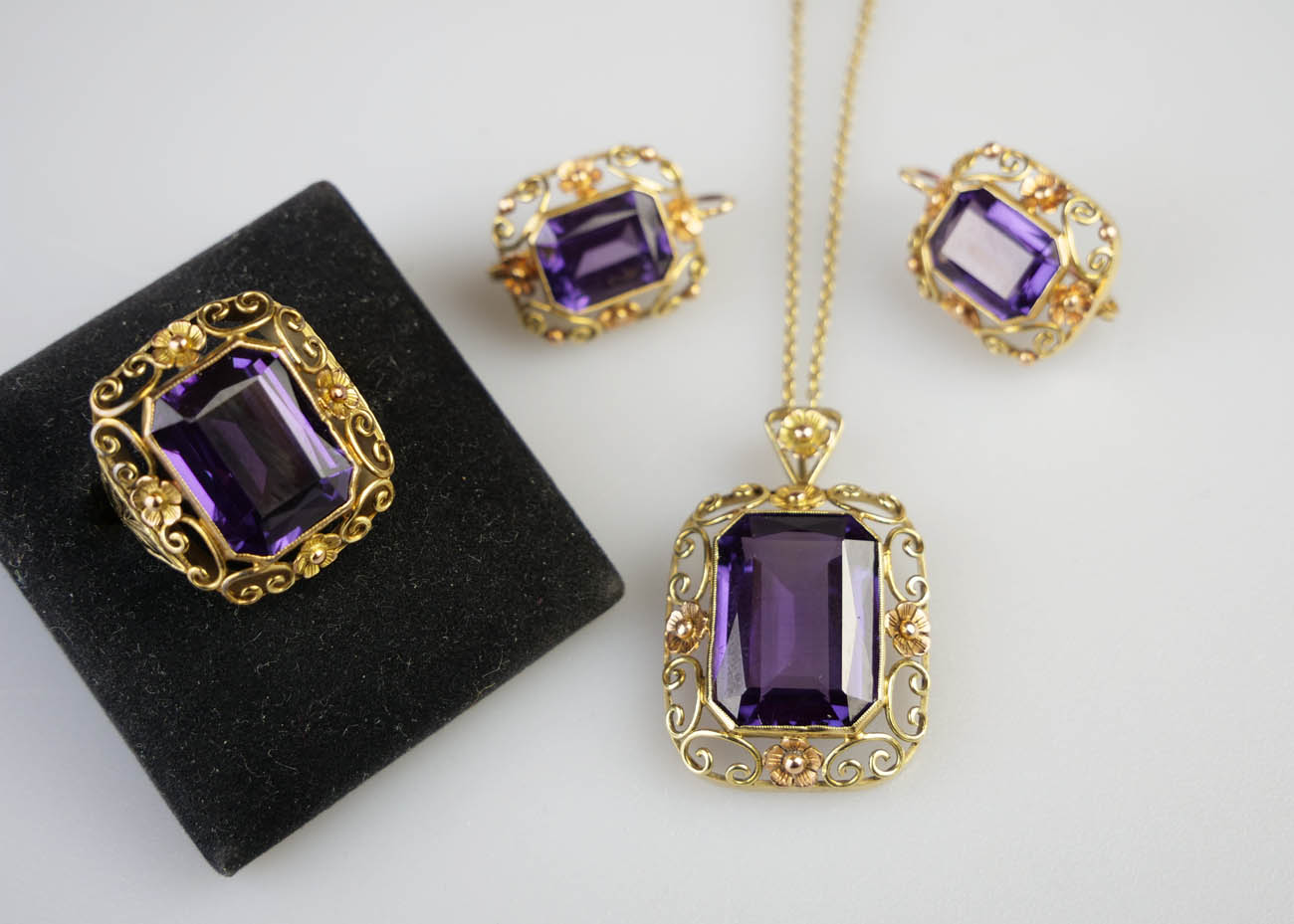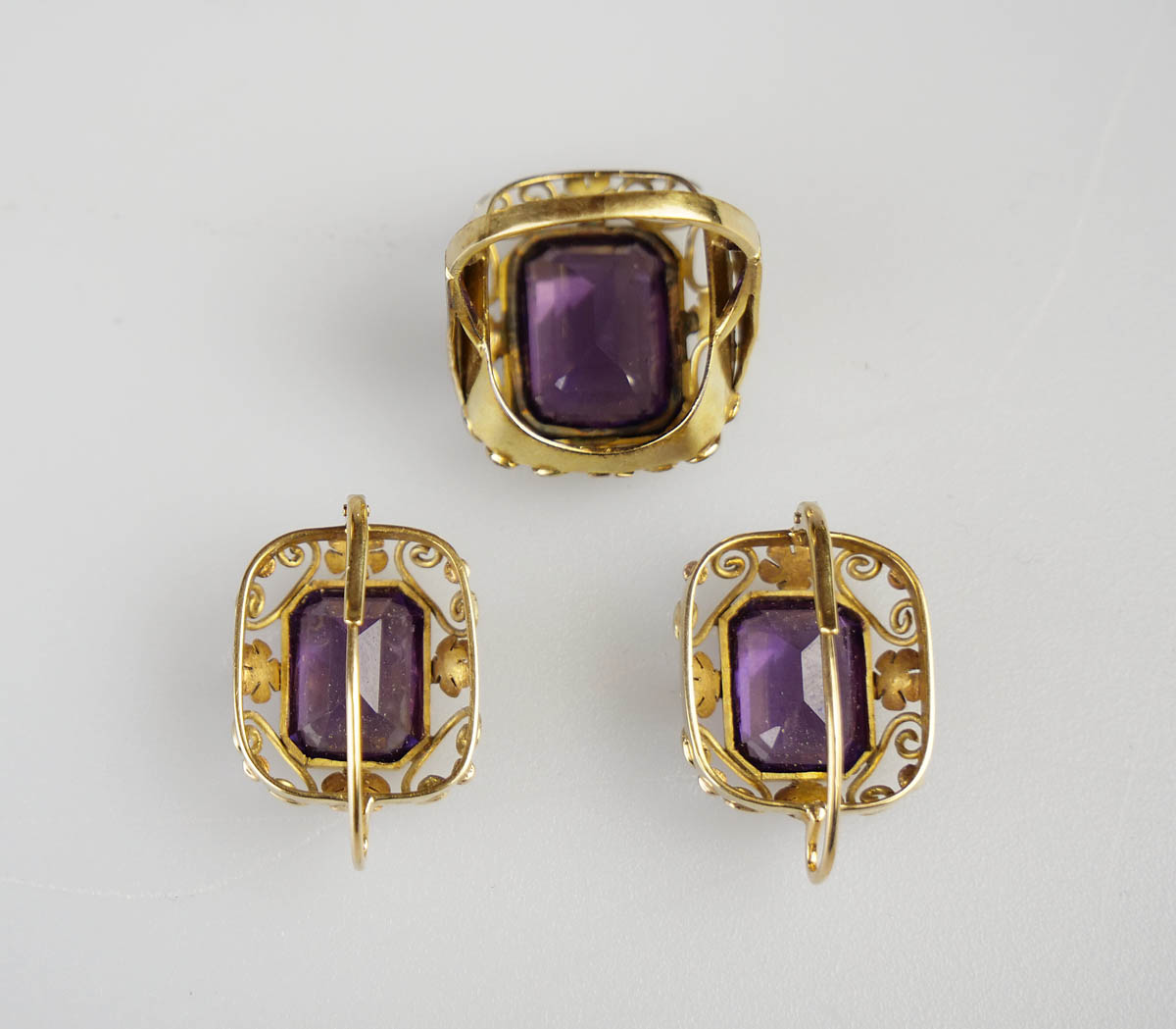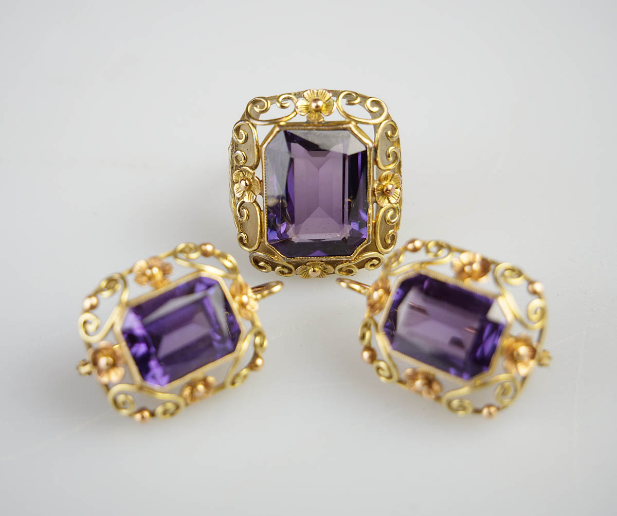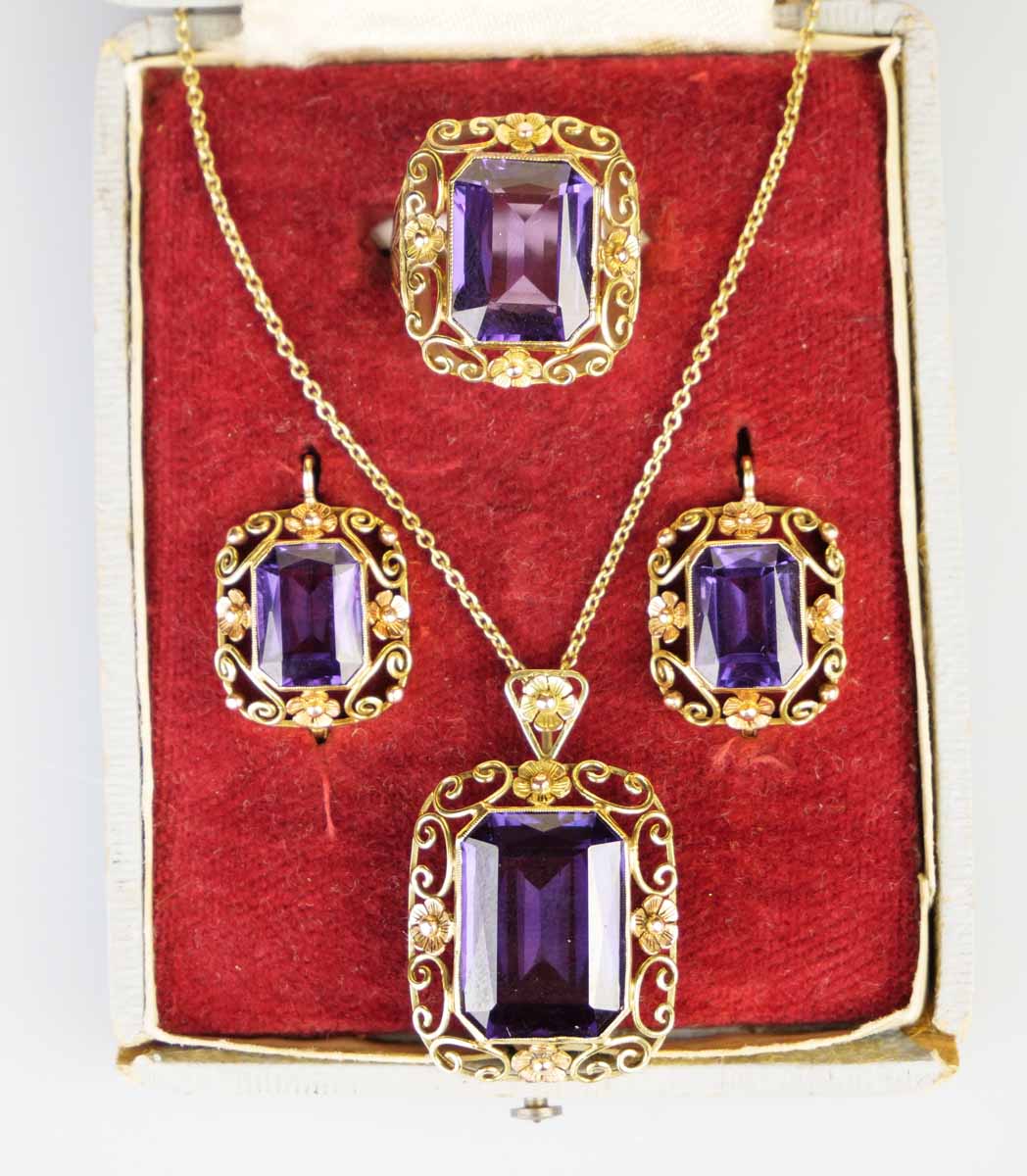 zlatá souprava se syntetickými safíry s barvoměnou, náušnice, kolier a prsten, Au 25,50 g/585/1000, Československo, kolem r. 1935, dobový punc (lvíček), u náušnic atest Puncovního úřadu; rozměry náušnic 1,6 x 2,2 cm, rozměry kolieru 3,5 x 2,3 cm, rozměry hlavy prstenu 2,2 x 2 cm; velikost prstenu 55
