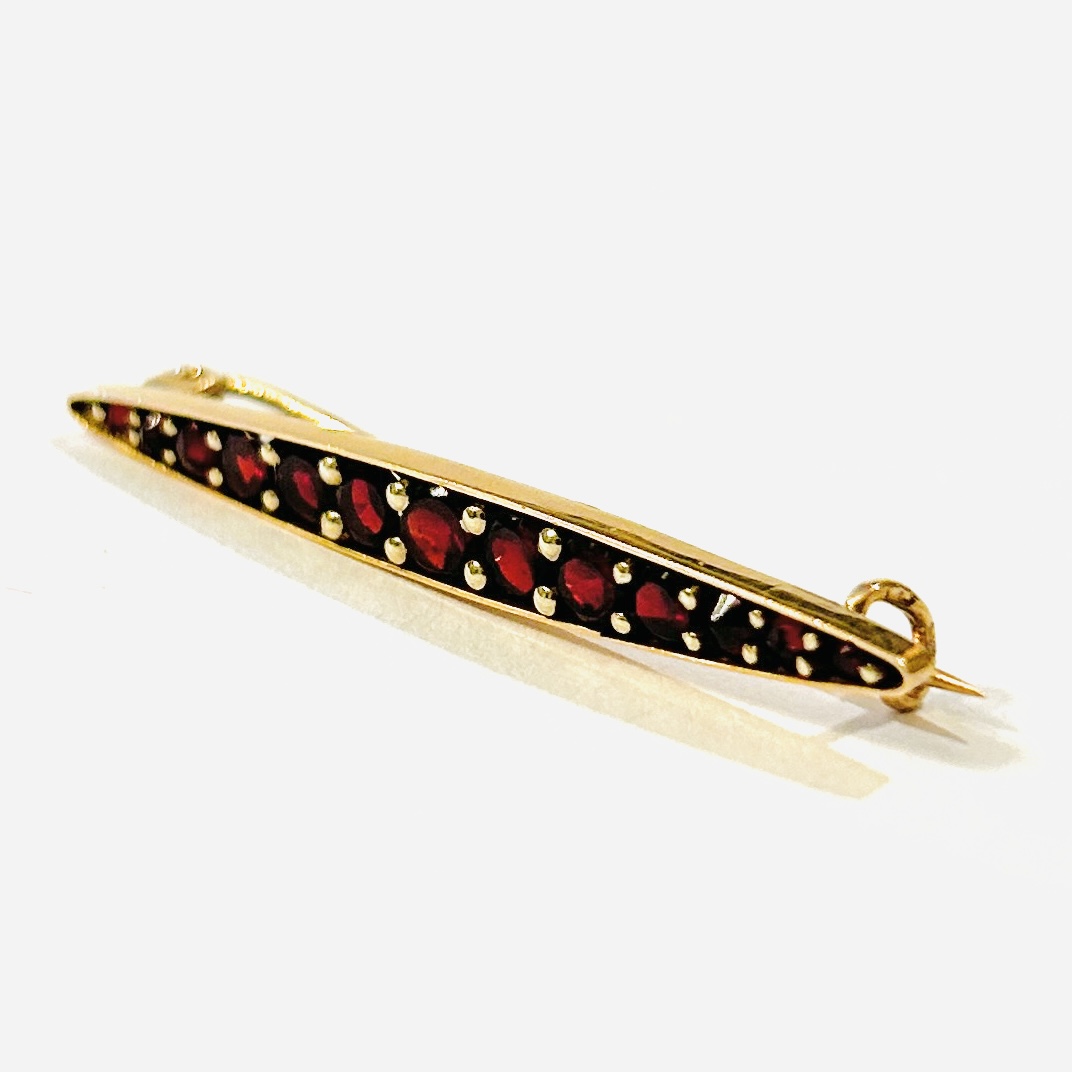 Decentní, nadčasová podlouhlá brož se zašpičatělými konci, v řadě osazeno českými granáty kulatého plochého a routového brusu, fasováno nýtkovou technikou, větší kameny zespoda opatřeny průsvitkou. Precizní pražská či turnovská práce z 1. poloviny 20. let 20. století.