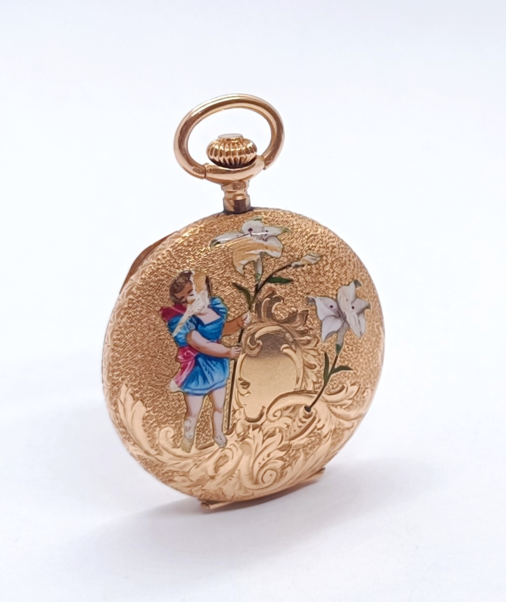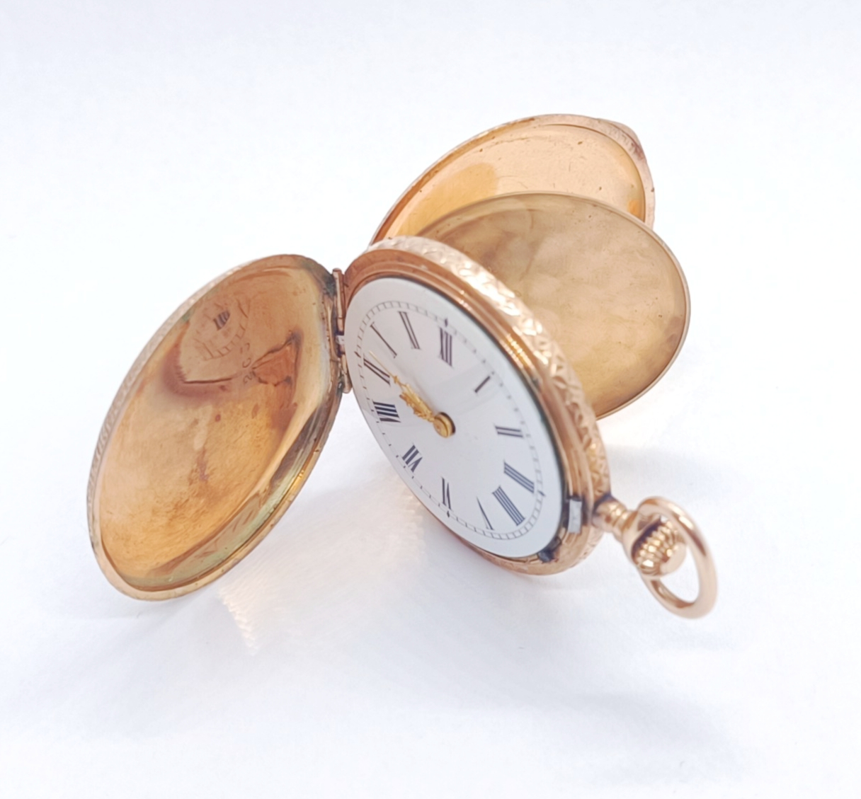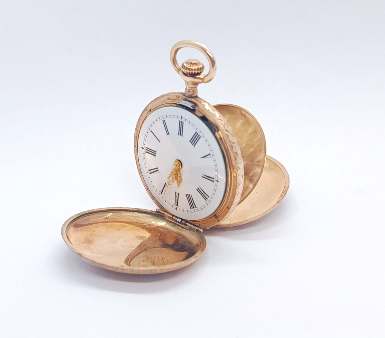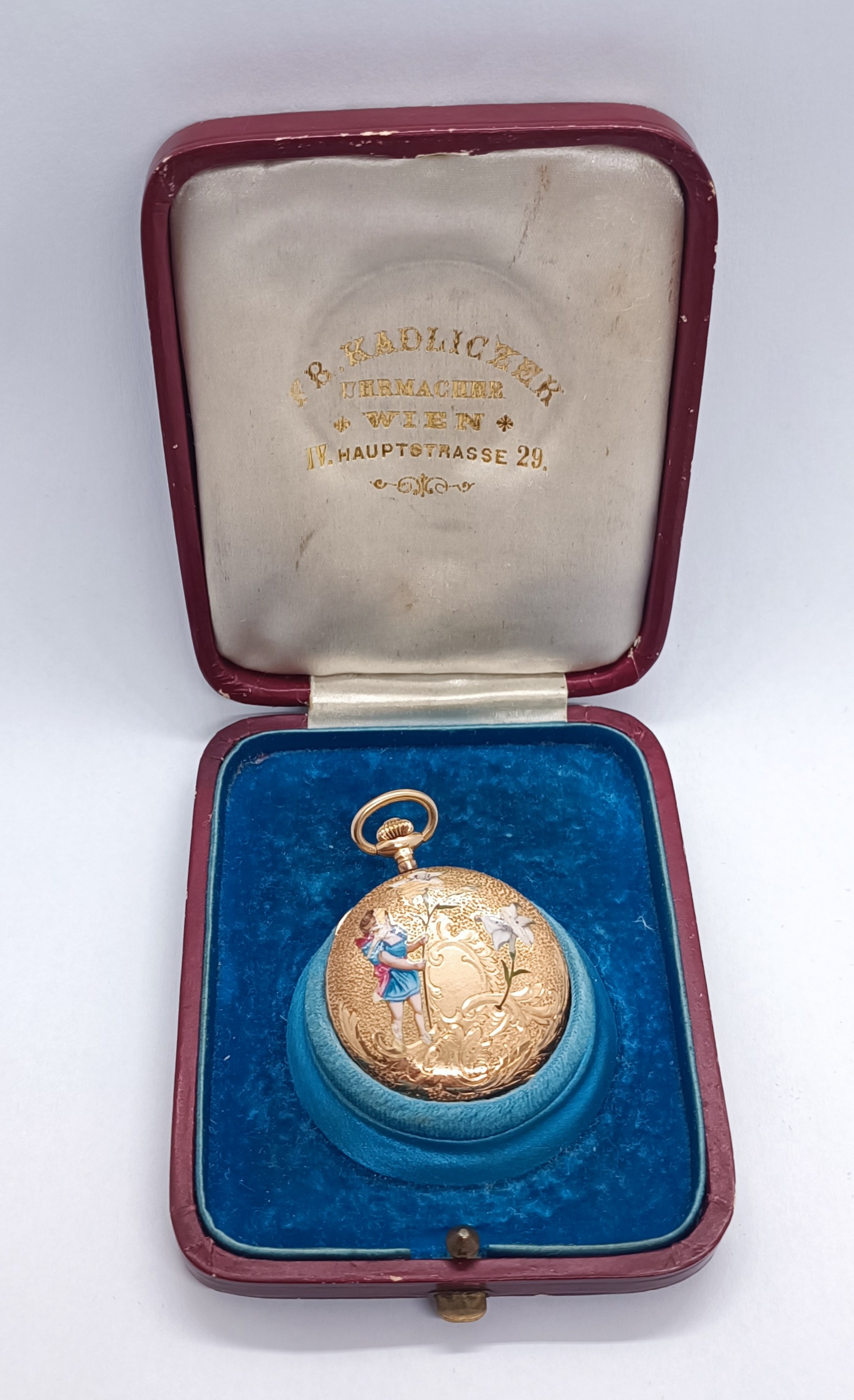 Zlaté kapesní tříplášťové hodinky „jeptišky“, na přední straně zdobené e-mailem, část nedochováno, ornamentálně zdobené, Au btto 23,12g/580/1000, dovozový punc do Rakousko – Uherska, puncovní úřad Linec, do roku 1901, chybí sklíčko, stará krabička k hodinkám, funkční; průměr ciferníku 2,7 cm, celkový průměr pláště 3,2 cm