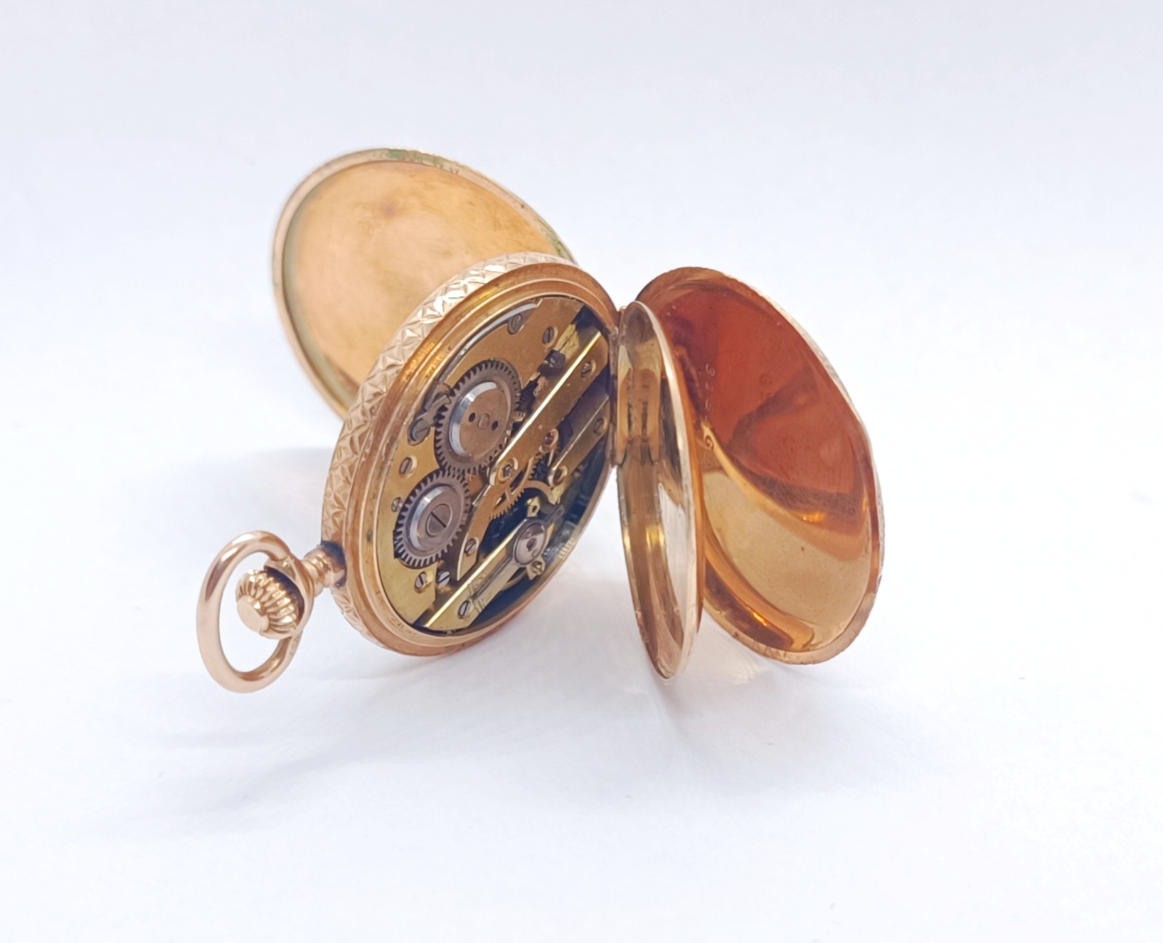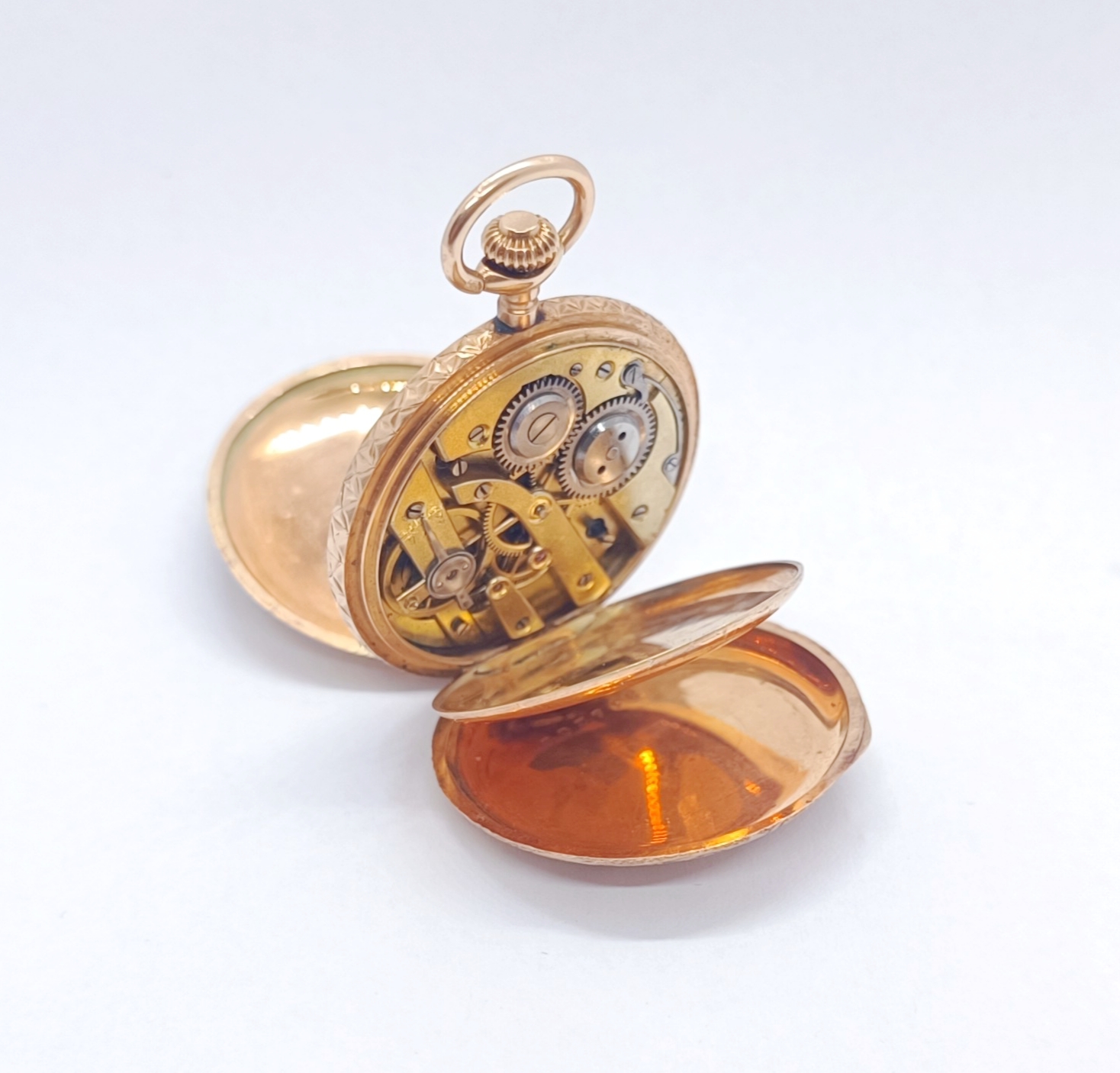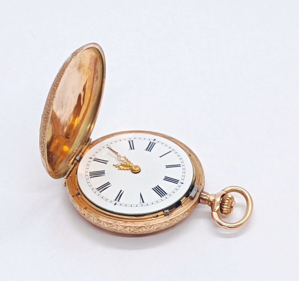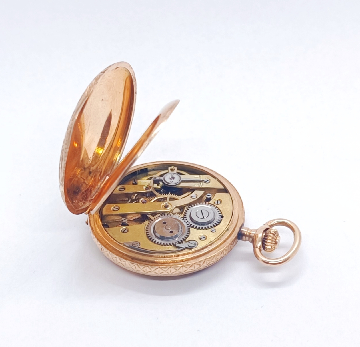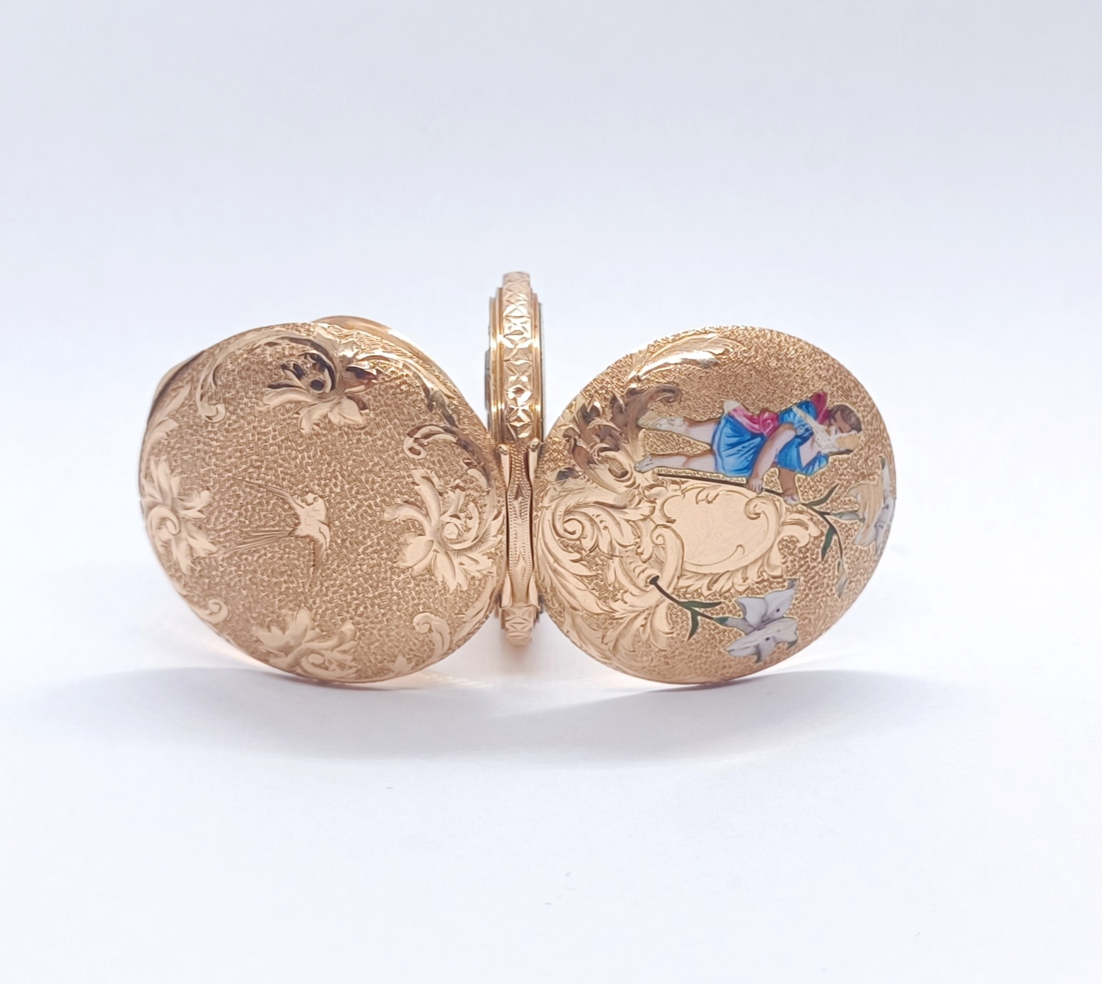 Zlaté kapesní tříplášťové hodinky „jeptišky“, na přední straně zdobené e-mailem, část nedochováno, ornamentálně zdobené, Au btto 23,12g/580/1000, dovozový punc do Rakousko – Uherska, puncovní úřad Linec, do roku 1901, chybí sklíčko, stará krabička k hodinkám, funkční; průměr ciferníku 2,7 cm, celkový průměr pláště 3,2 cm
