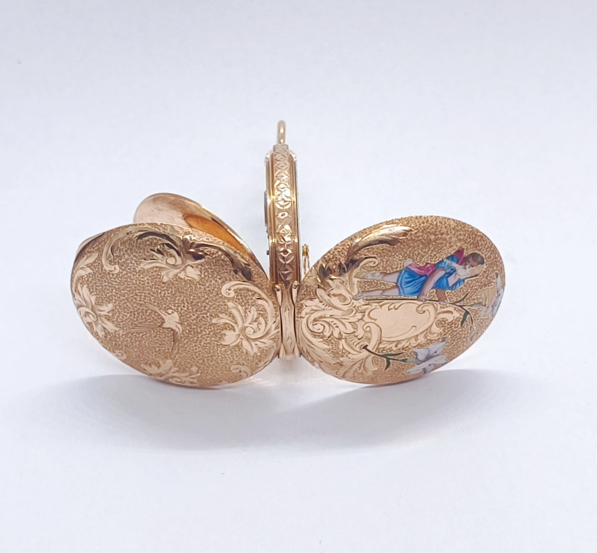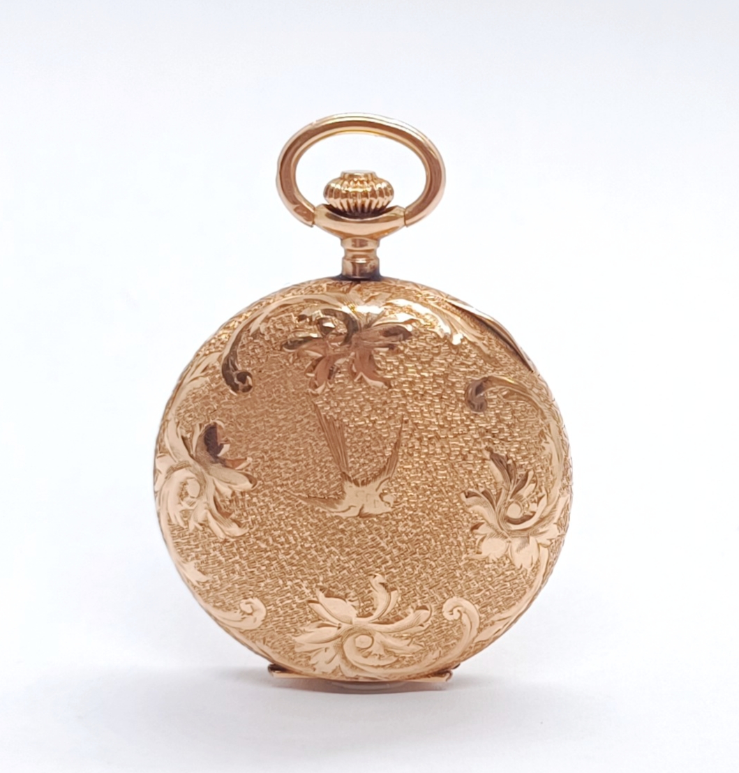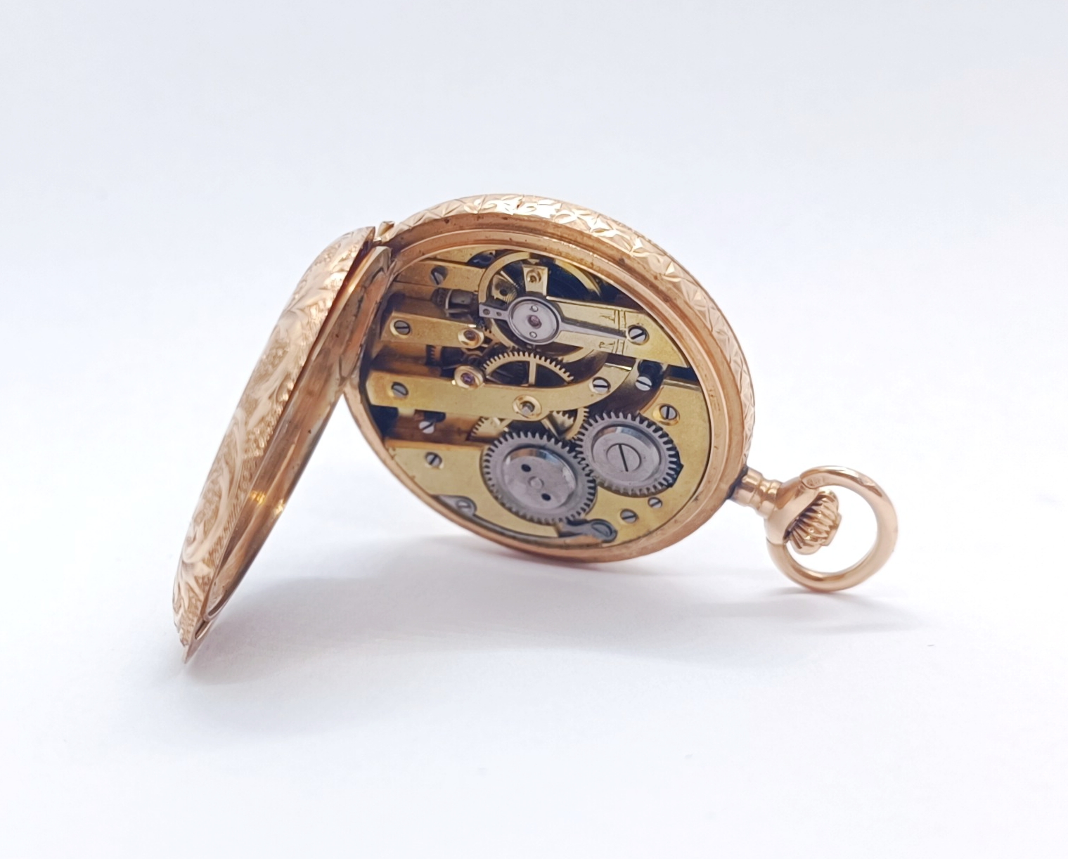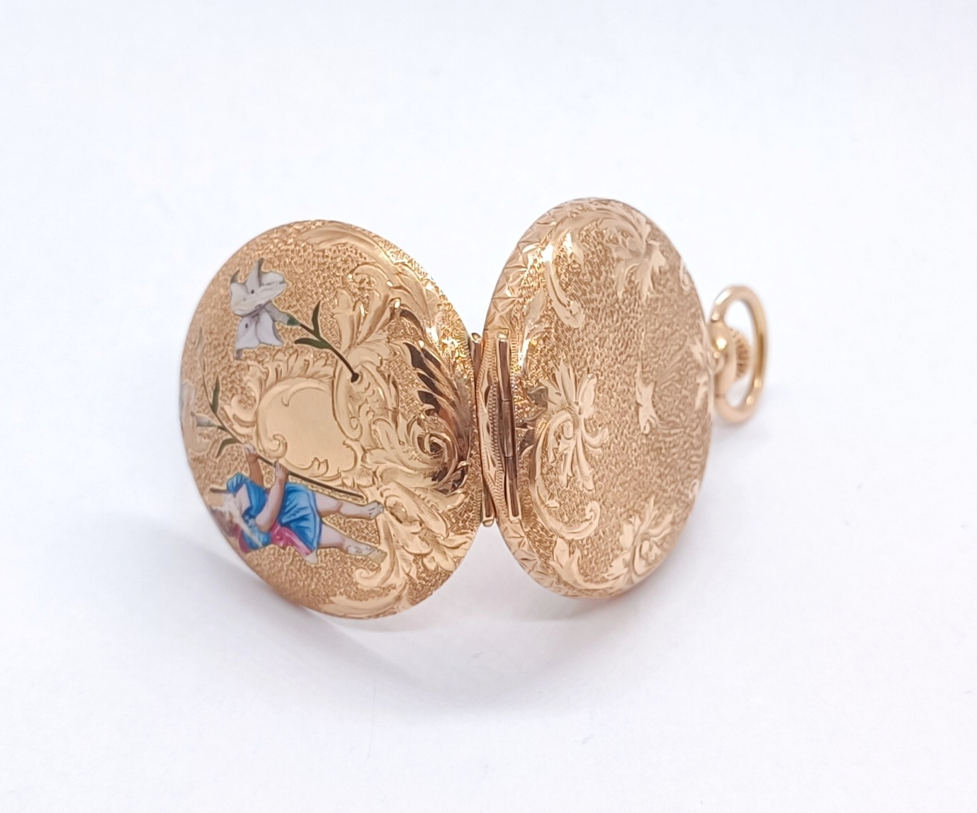 Zlaté kapesní tříplášťové hodinky „jeptišky“, na přední straně zdobené e-mailem, část nedochováno, ornamentálně zdobené, Au btto 23,12g/580/1000, dovozový punc do Rakousko – Uherska, puncovní úřad Linec, do roku 1901, chybí sklíčko, stará krabička k hodinkám, funkční; průměr ciferníku 2,7 cm, celkový průměr pláště 3,2 cm