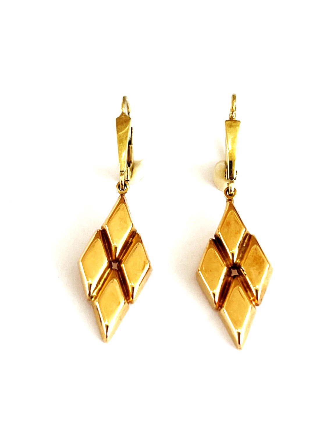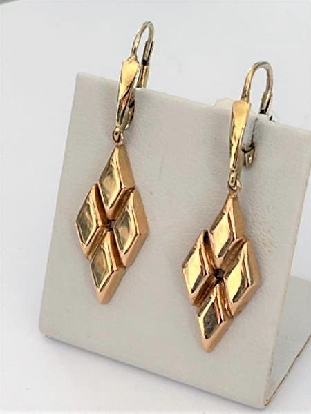Hezké zlaté náušnice ze 14 karátového zlato = Au 585/1000 váha náušnic 4.61 gramů. Náušnice jsou z dutého tzv foukaného zlata. Nenošené – hezký stav. Oblíbené klasické české zapínání – patent. Délka cca 4 cm.
