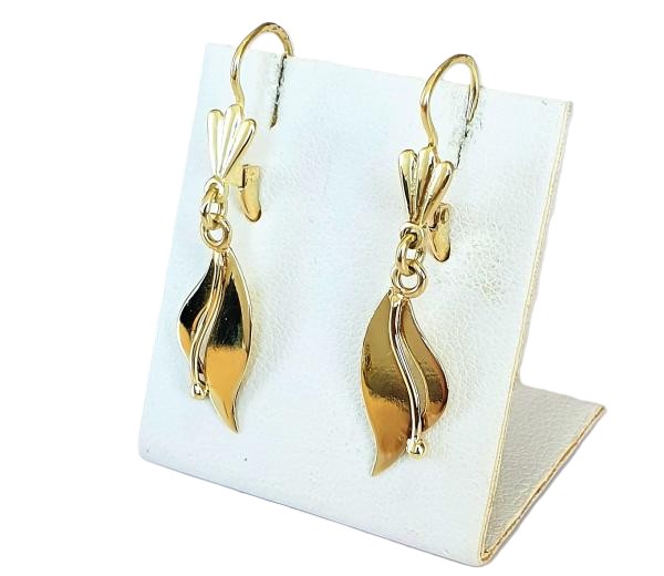 Zlaté náušnice vyrobené ze 14 karátového žlutého zlata – AU 585/1000. Náušnice jsou závěsné na a na klasické české zapínání. Puncovány – Čejka. Hezký nepoškozený stav, navíc náušnice i odborně vyčištěny. Váha 2,61 gramů