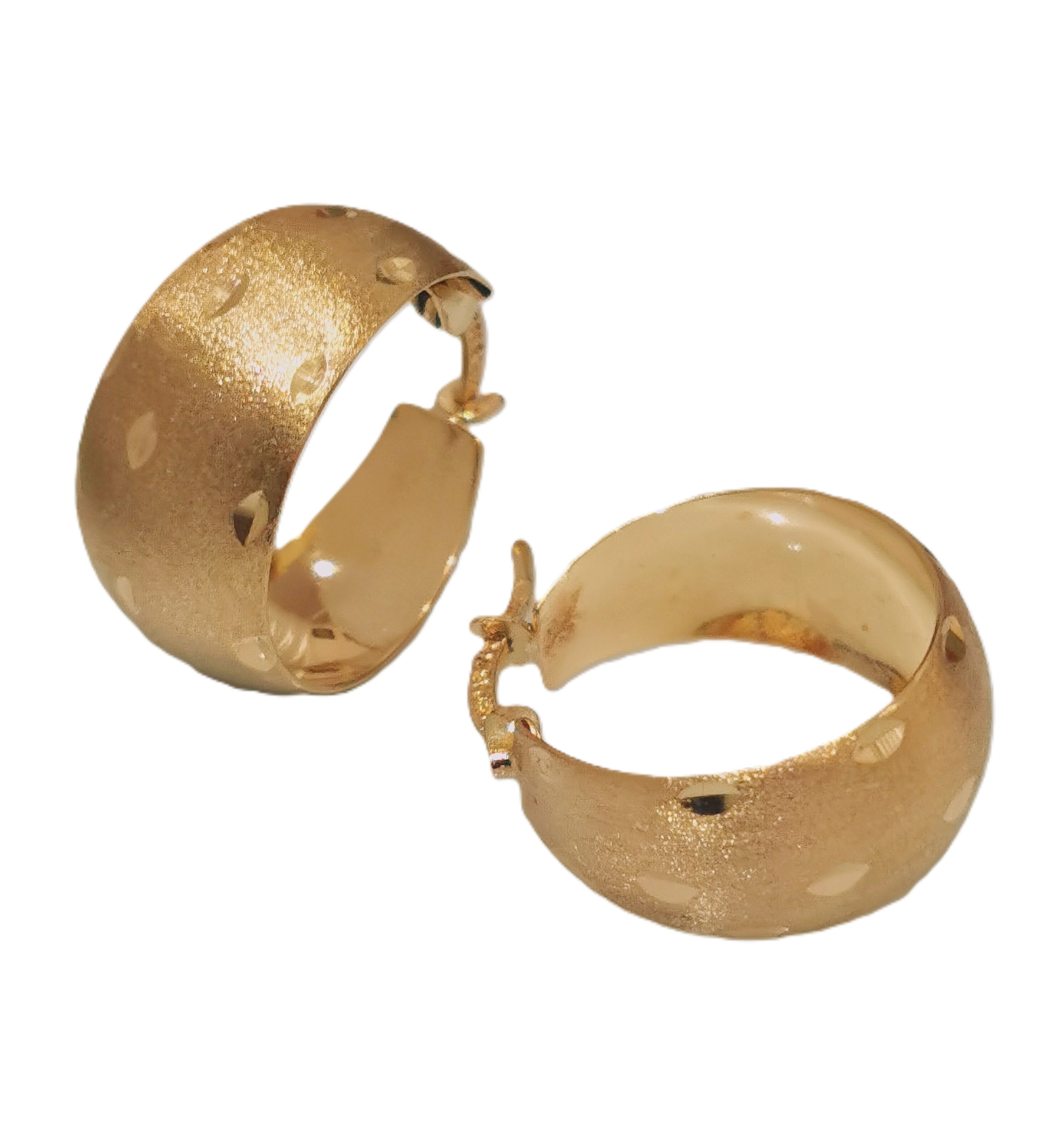 Krásné zlaté náušnice ze žlutého 14 karátového zlata = AU 585/1000. Tyto výrazné široké kruhy jsou zhotovené s povrchem z jemném matu s lesklými třpytivými ozdobami. Váha náušnic 3,60 gramů.