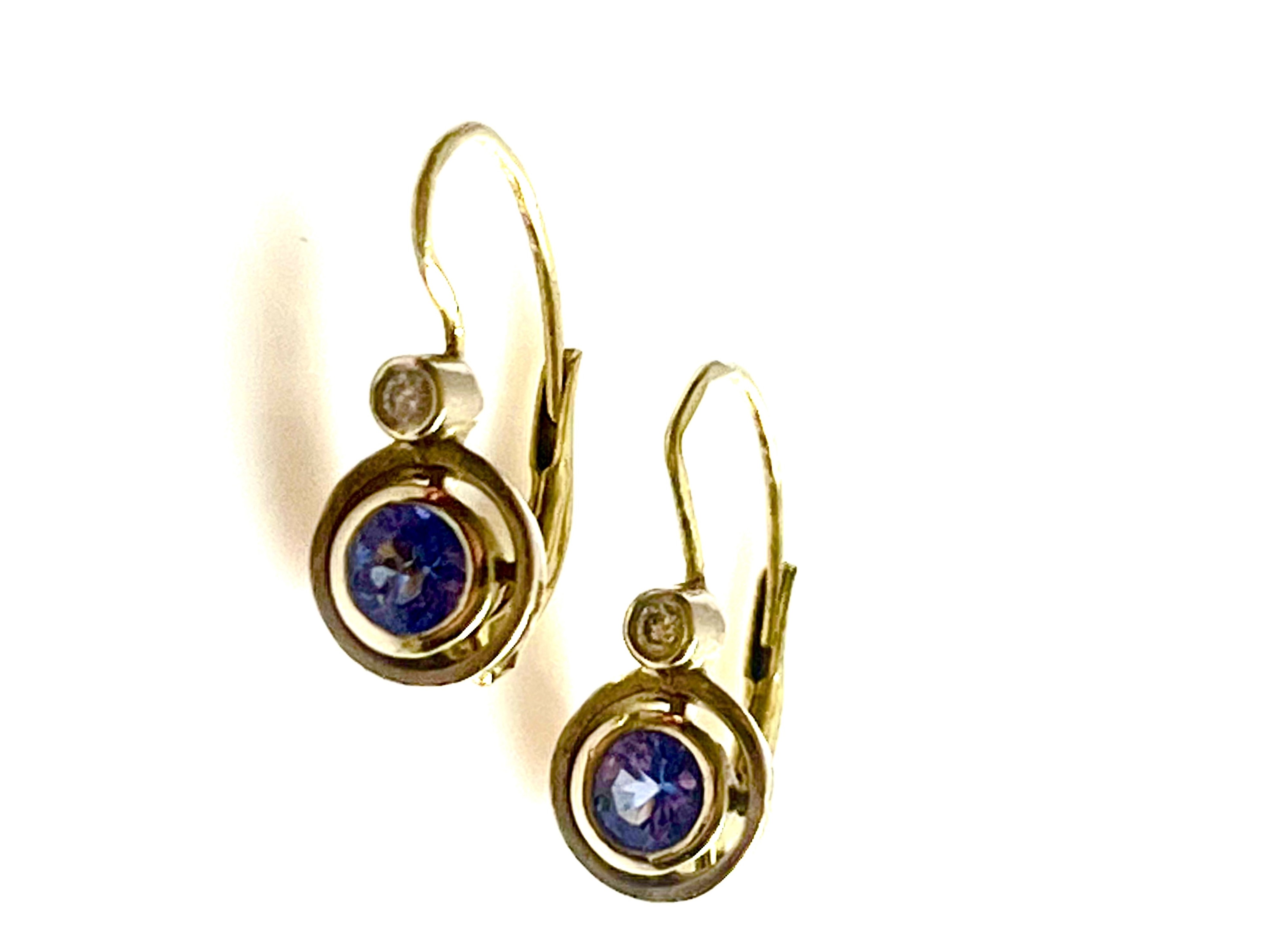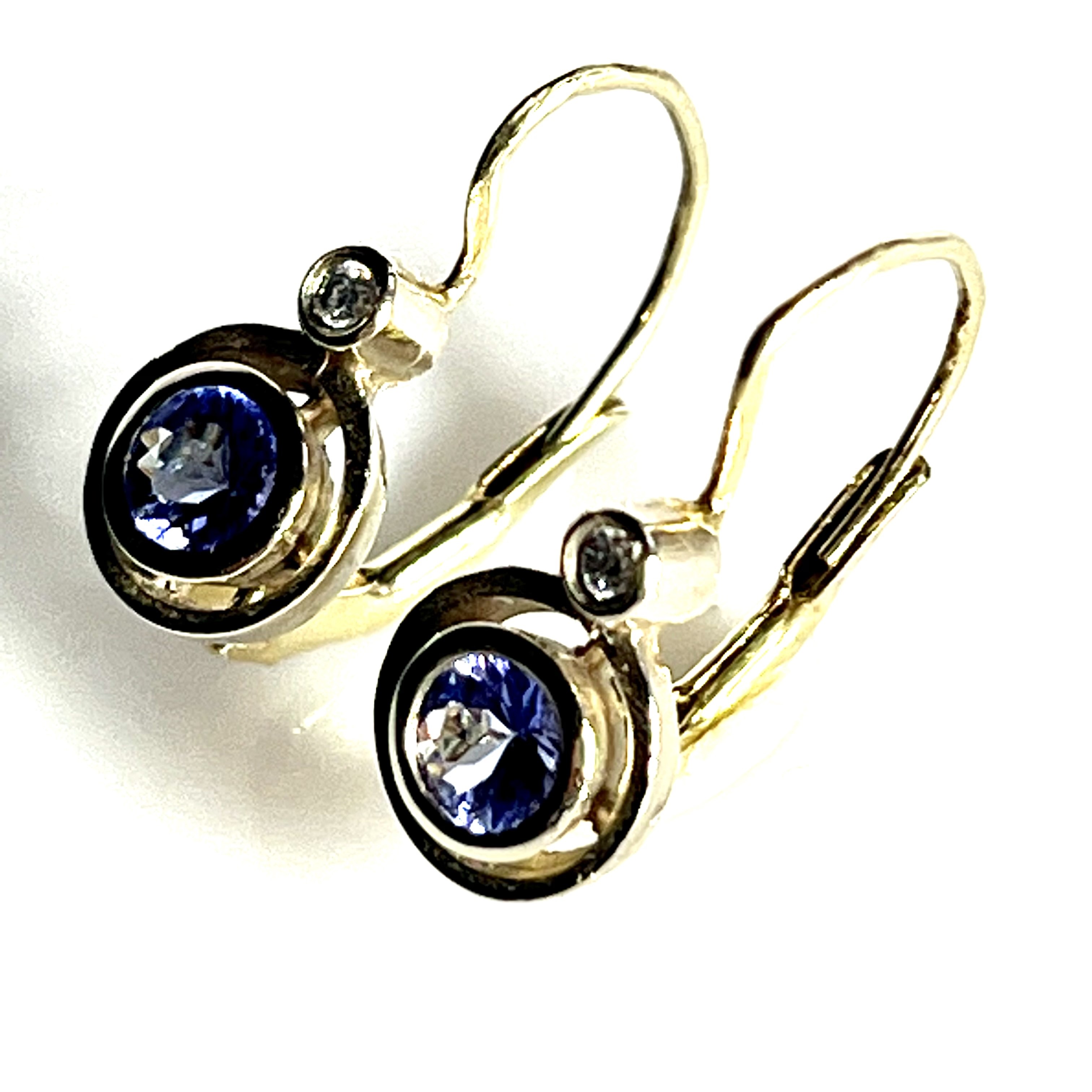 Klasické náušnice ze 14 karátového zlata AU 585/1000 s přírodními kameny – brilianty 2×0,02ct SIG a cca 0,48ct přírodní tanzanity v krásné modro/fialové barvě. Náušnice je ze žlutého zlata a přední část okolo kamenů je bílém zlatě.