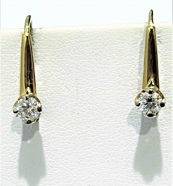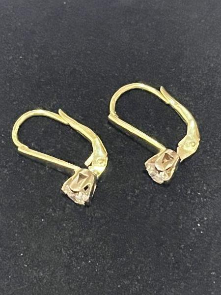 Zlaté náušnice ze 14 karátového zlata AU 585/1000 – kombinované provedení zlata, briliant usazen v bílém zlatě a ostatní část náušnice ve žlutém zlatě, brilianty o velikosti cca 3,65 mm průměr kamene a váze briliantů celkem oba kameny dohromady cca 0,36 ct, kvalita briliantů Si2/G. Váha náušnic brutto 1,77 gramů výška náušnice cca 1,7 cm