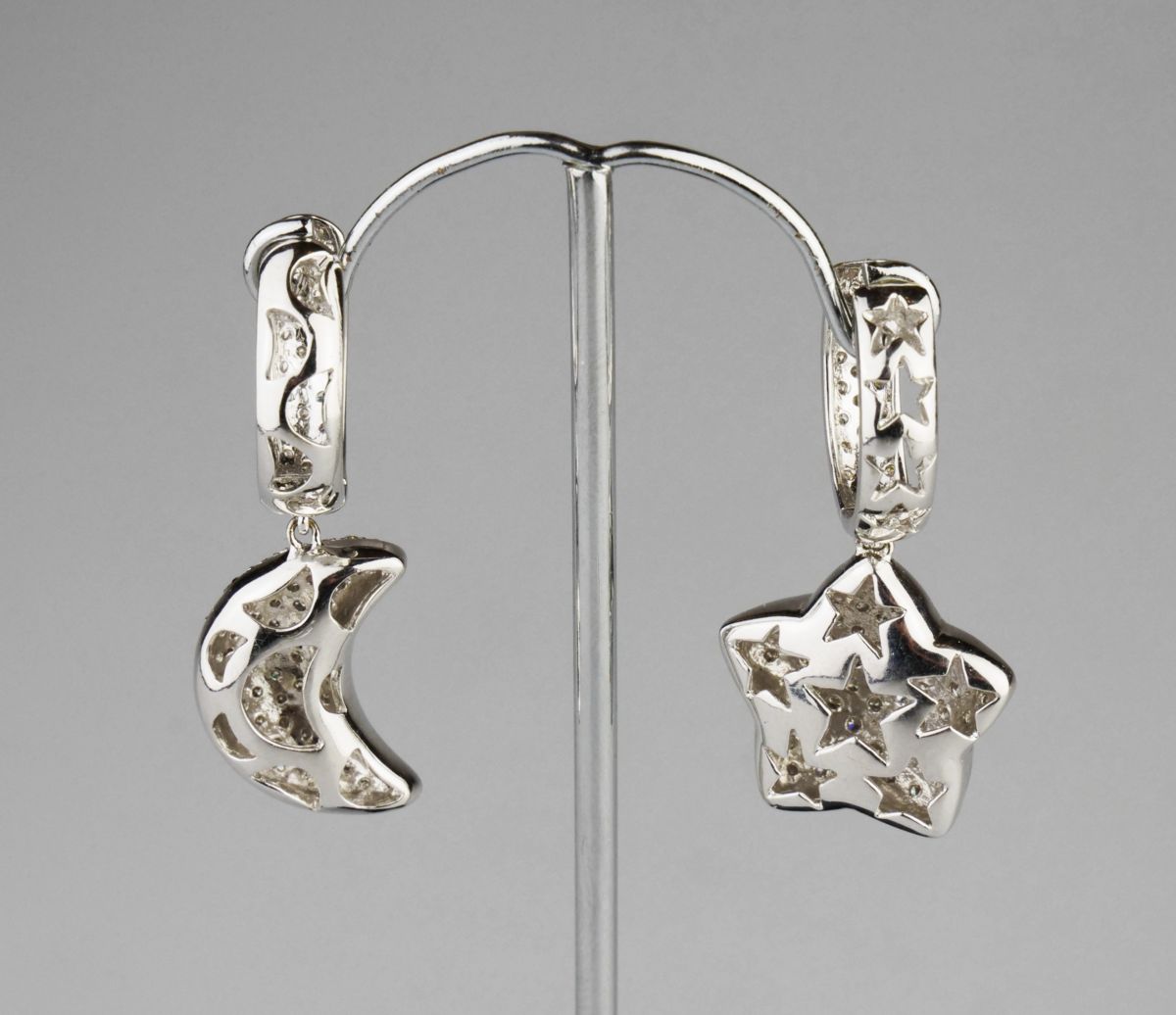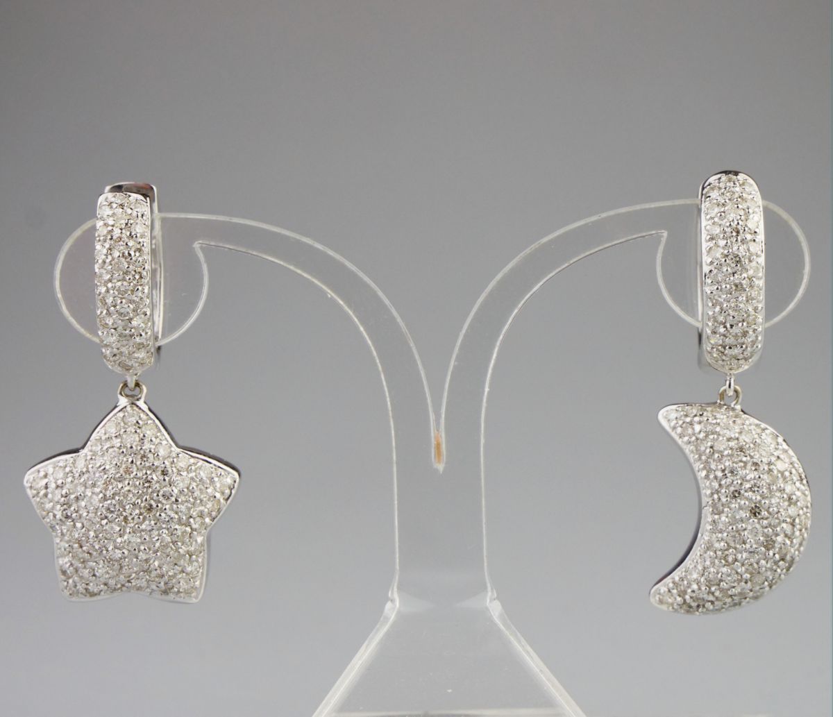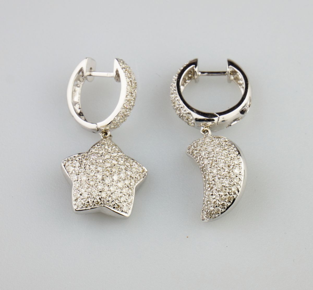 neobvyklé náušnice z bílého zlata ve tvaru půlměsíce a hvězdy s diamanty briliantového brusu o celkové hmotnosti cca 3,5 ct, Au btto 14,37 g/750/1000, západní Evropa, kolem r. 2005, pozdější český punc, délka náušnic 3,5 cm