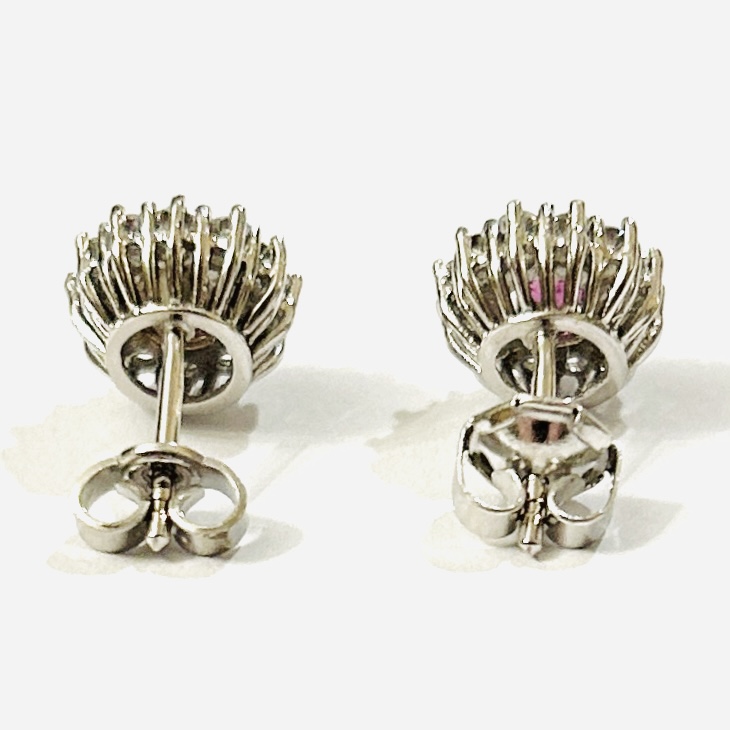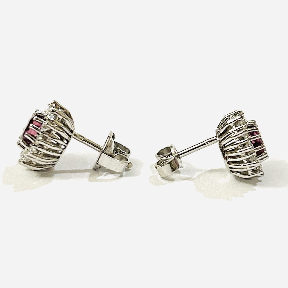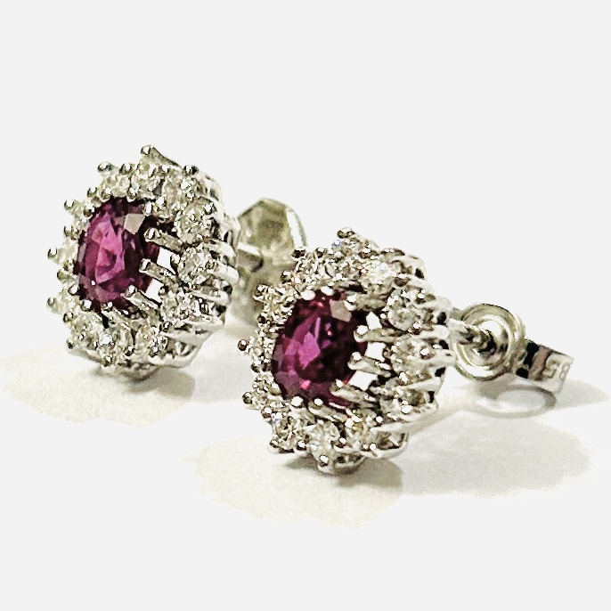 Elegantní, zářivé náušnice s centrálním přírodním rubínem oválného smíšeného brusu o váze 0,45 ct, celkové váze tedy 0,90 ct, původem pravděpodobně z Thajska, rámováno přírodními diamanty kulatého briliantového brusu o celkové váze 0,60 ct (0,025 ct – 24 ks), kvalita velmi dobrá. Pečlivě fasováno krapnami v jemně stavěné hlavici. Precizní západoevropská zlatnická práce ze 70. až 80. let 20. století.