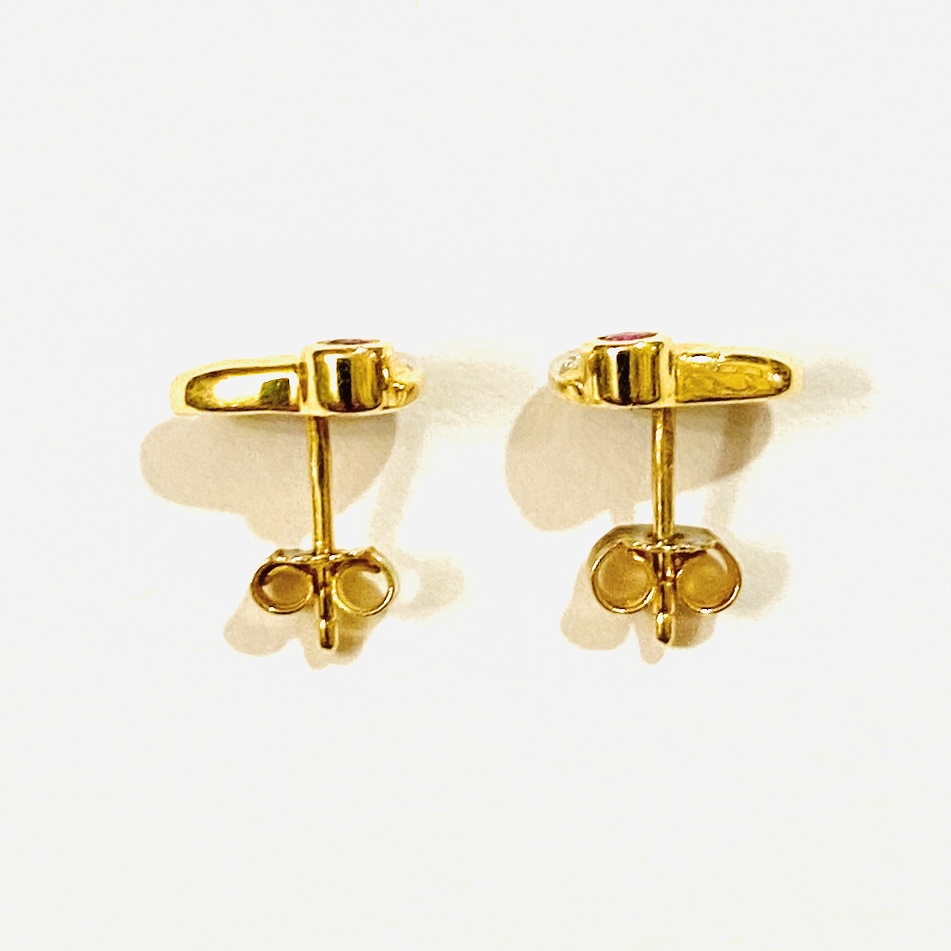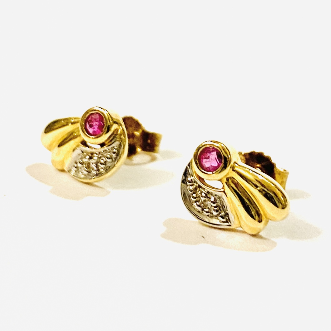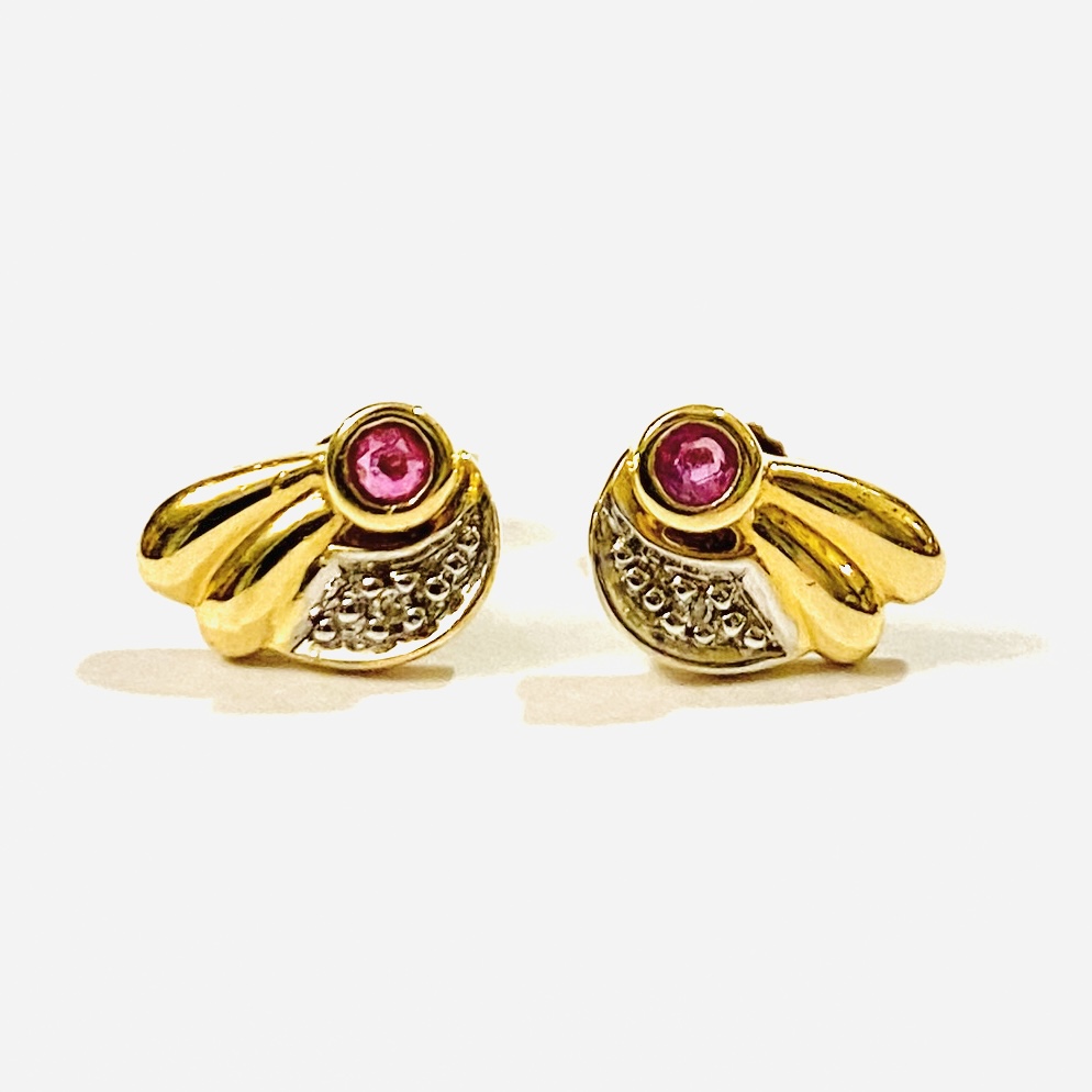 Decentní, nápadité náušnice s vějířovitou hlavicí, ta je každá osazena přírodním diamantem jednoduchého brusu (achtkant), celková váhá 0,02 ct (2 ks – 0,01 ct), v granulovaném lůžku z bílého zlata, v plně přiléhající obrubě uložen přírodní rubín kulatého brusu. Západoevropská zlatnická práce z poslední pětiny 20. století.