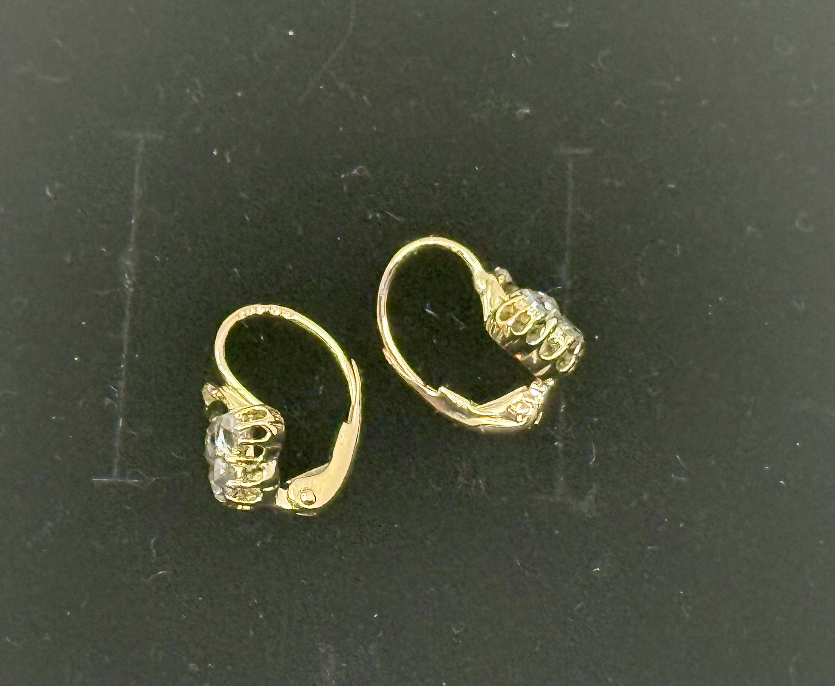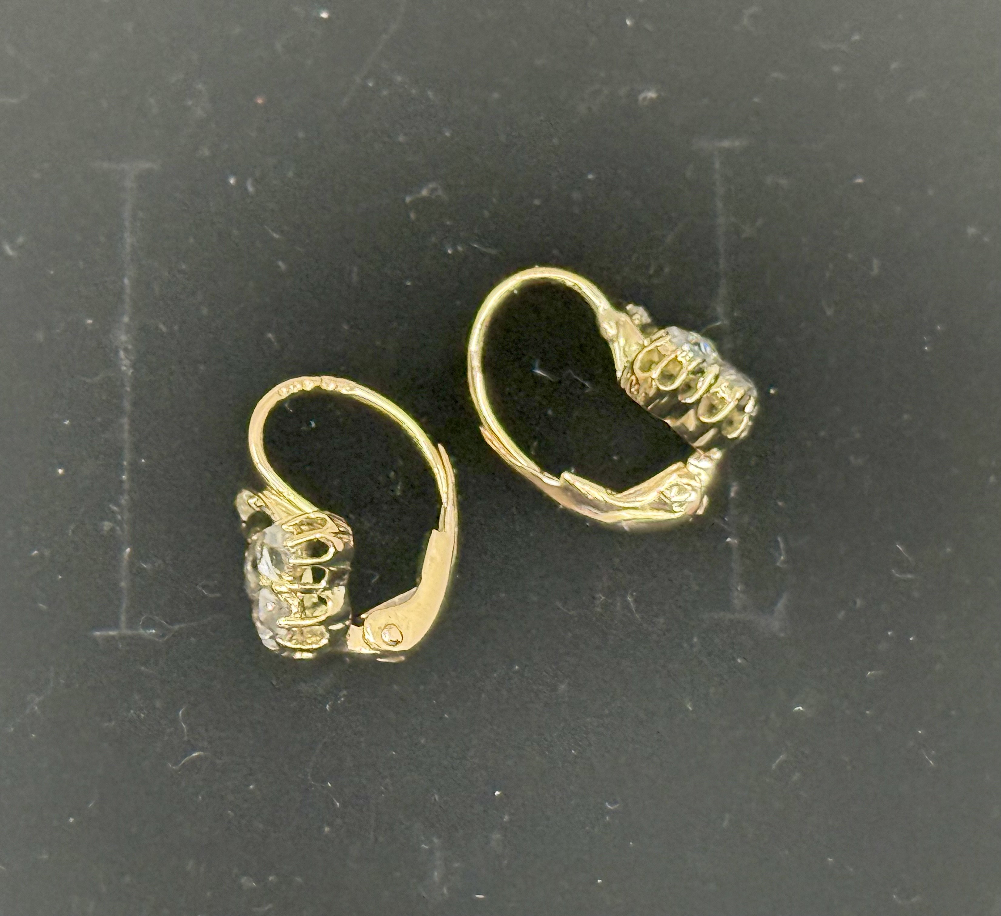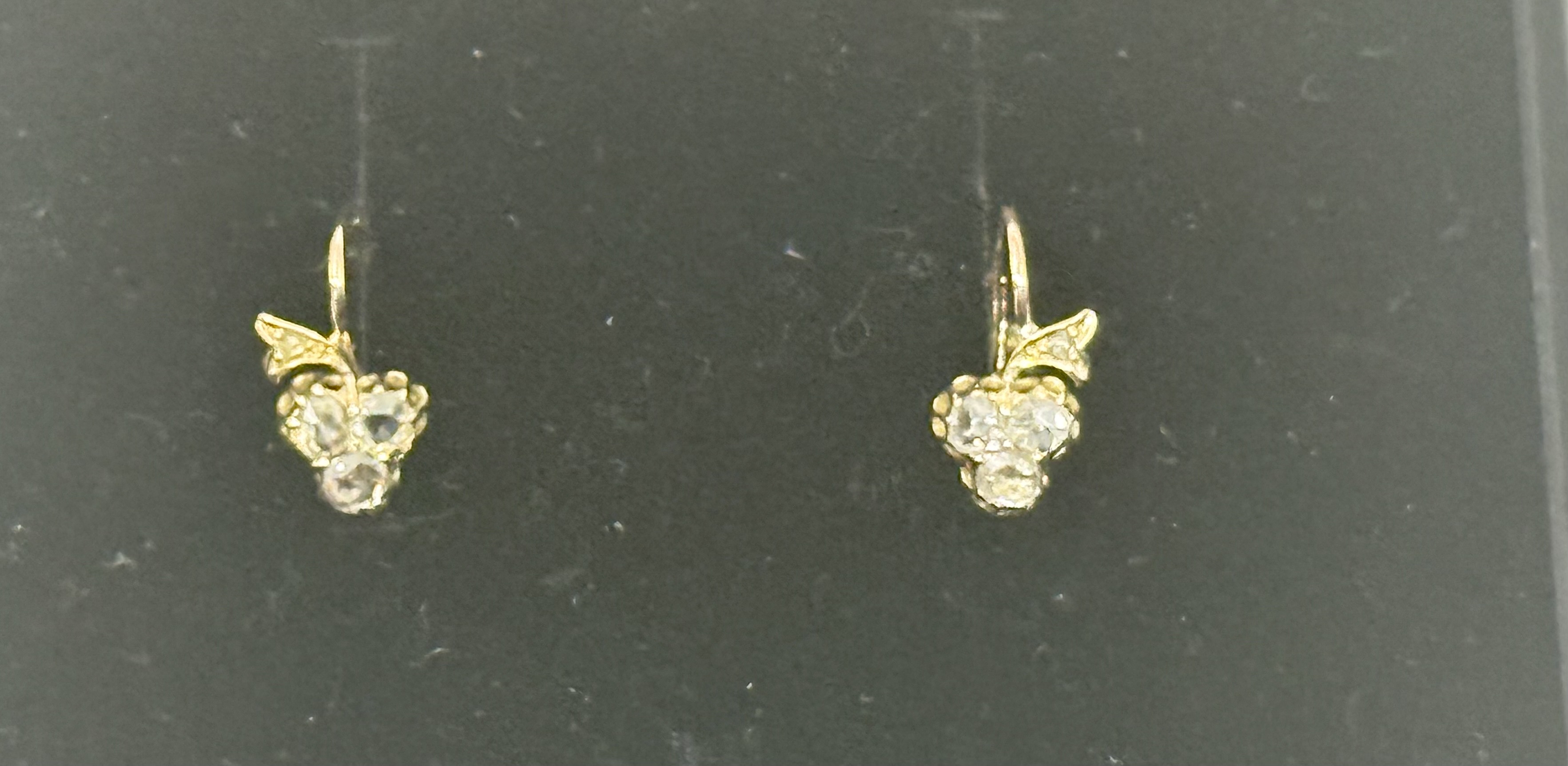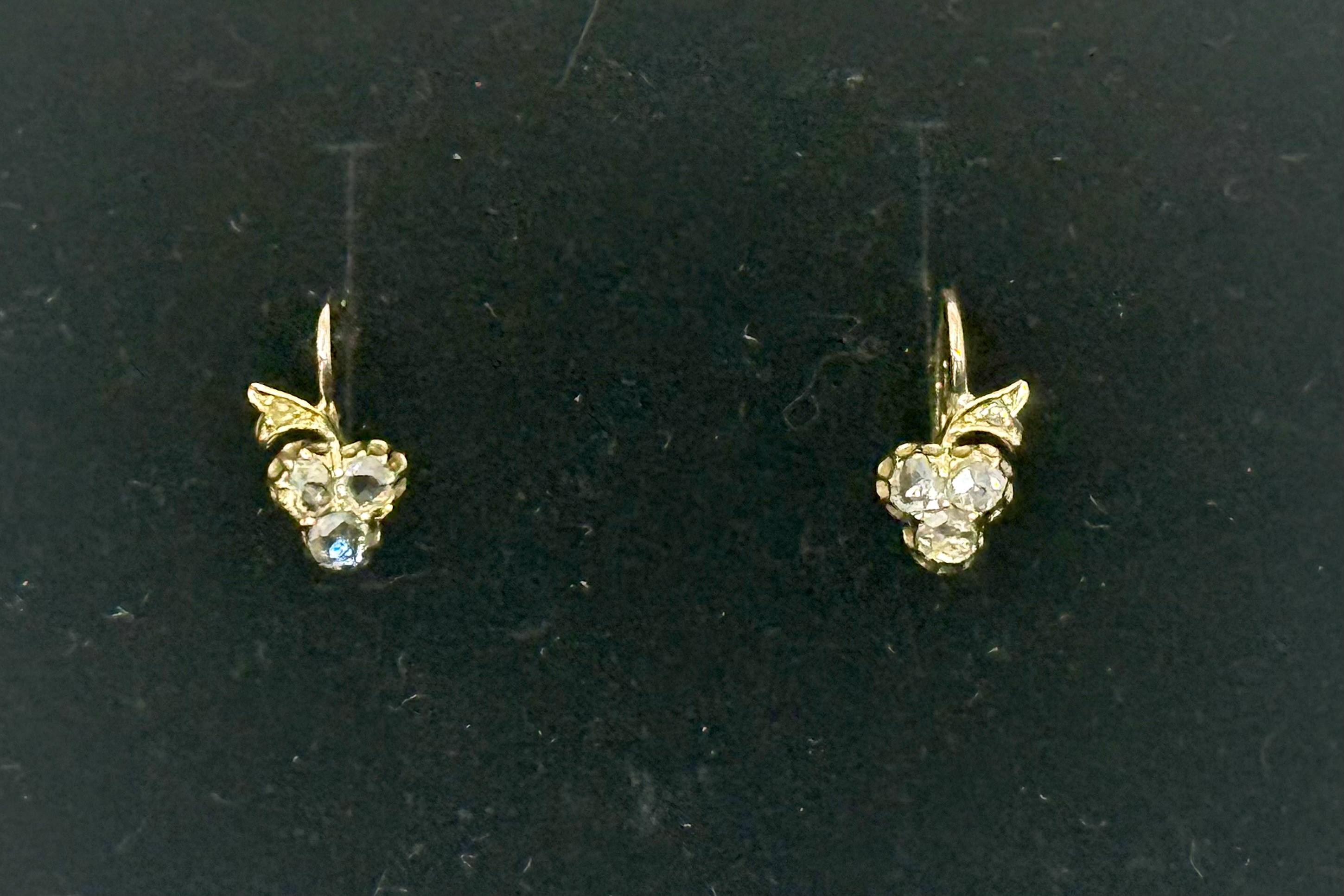Zlaté náušnice s diamantovými routami – kolem 1880 . Zlato ryzosti 585/1000, váha 1,9 g diamanty cca 0,50 ct. Žluté zlato.